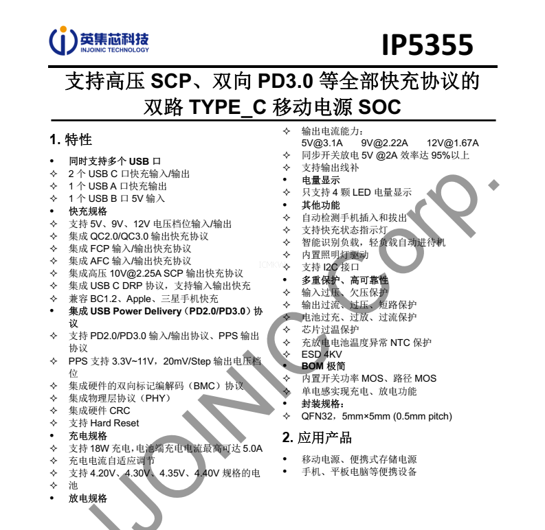 IP5355,支持高压 SCP、双向 PD3.0 等全部快充协议的 双路 TYPE_C 移动电源 SOC芯片规格书下载