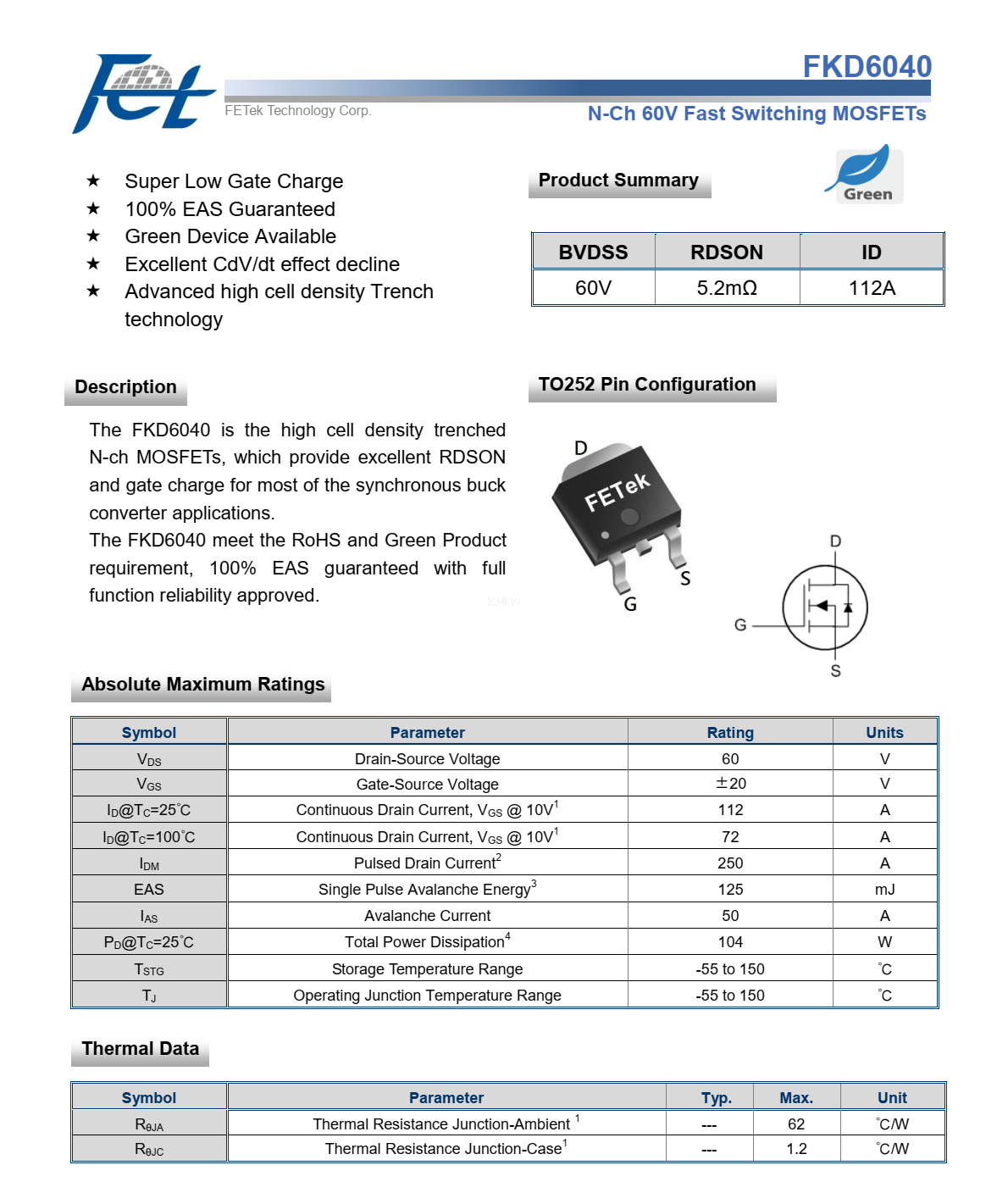 FKD6040,N通道60V快速开关MOSFET芯片PDF规格书下载