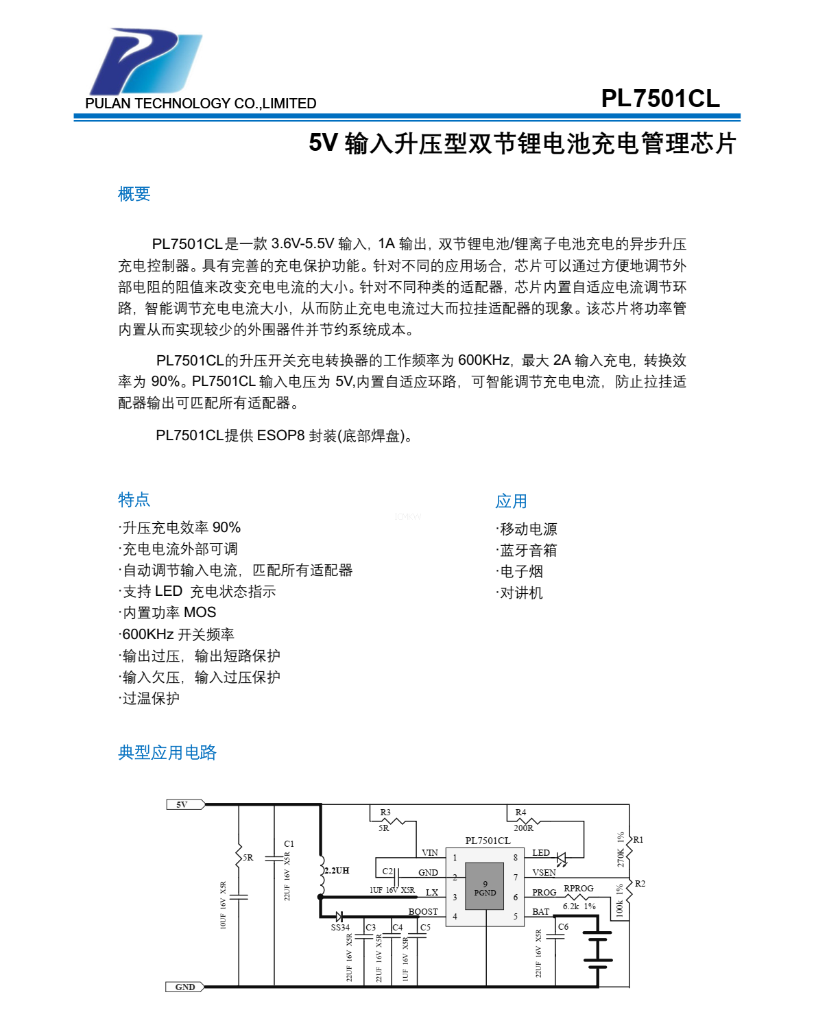 PL7501CL,5V 输入升压型双节锂电池充电管理芯片PDF规格书下载