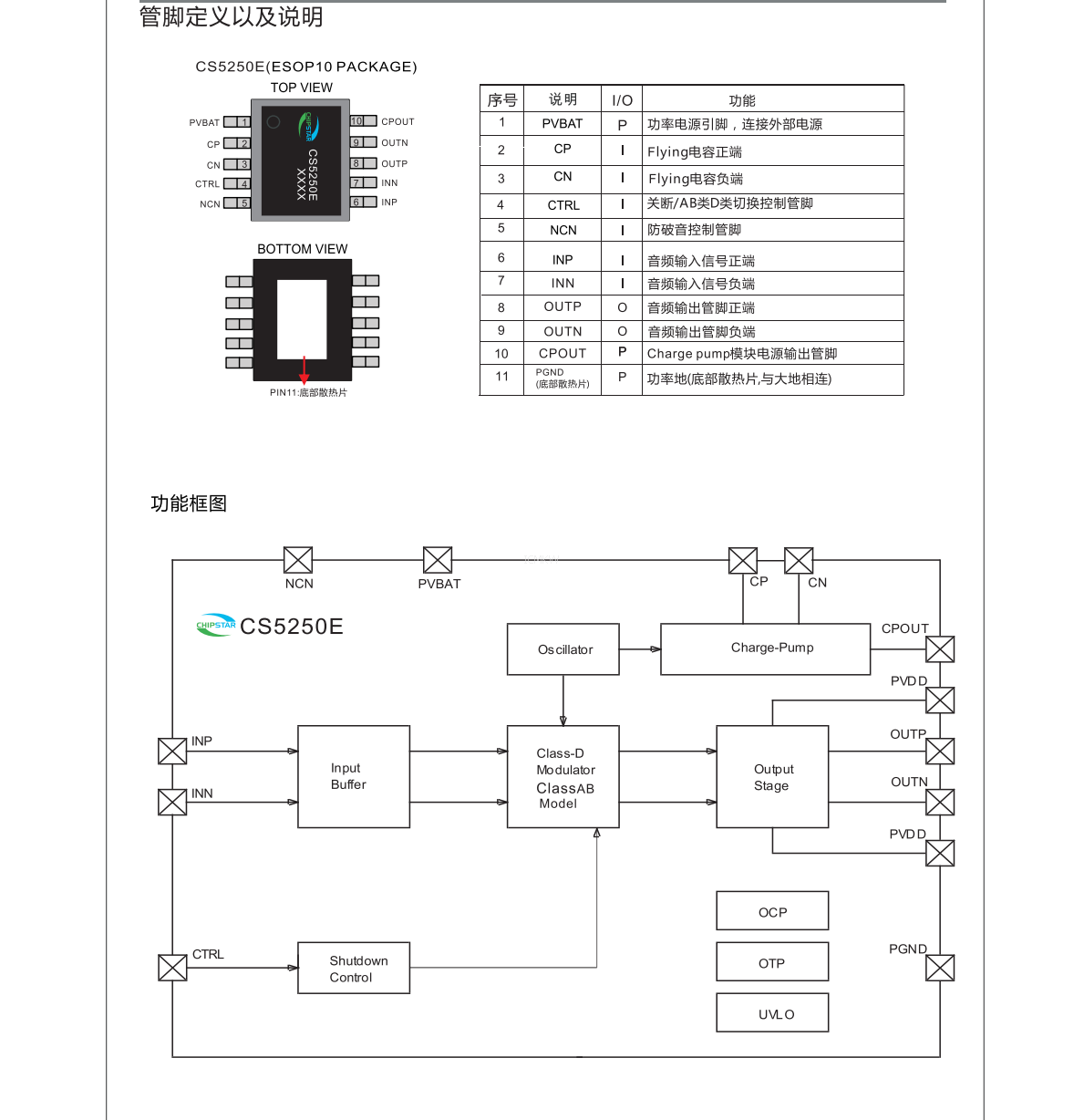 CS5250E,5.3W单声道GF类音频功率芯片PDF规格书下载