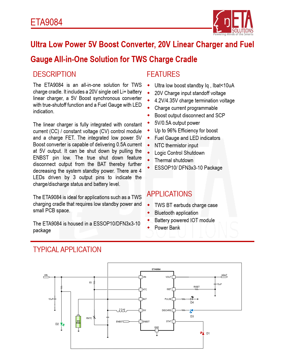 ETA9084,超低功耗5V升压转换器、20V线性充电器芯片PDF规格书下载