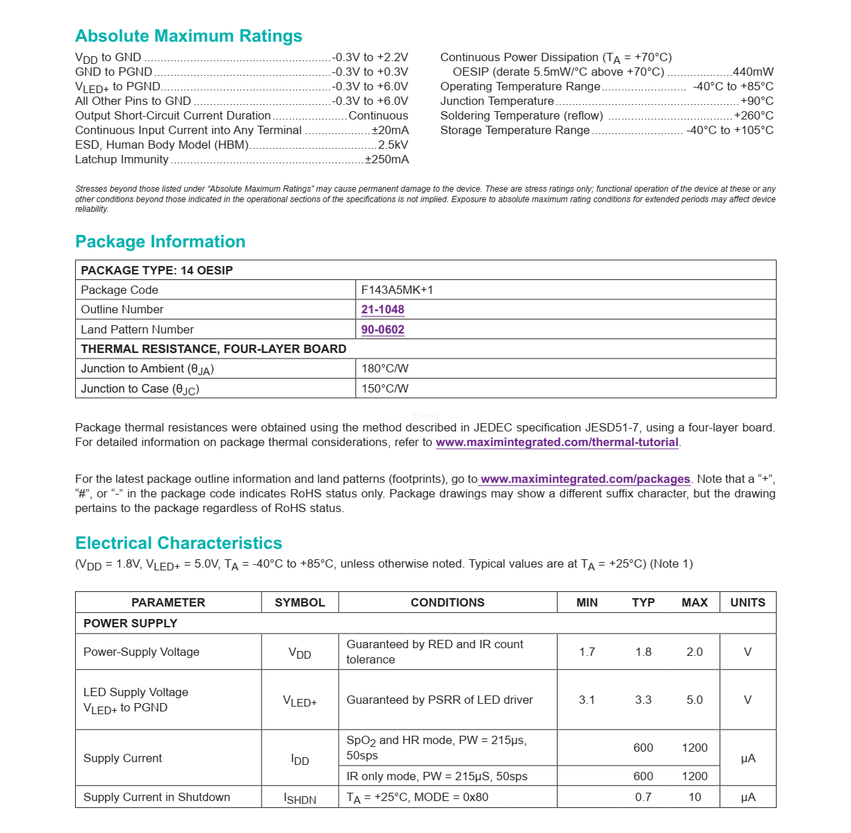 MAX30102,适用于穿戴式健康的高灵敏度脉搏血氧仪和心率传感器芯片PDF规格书下载