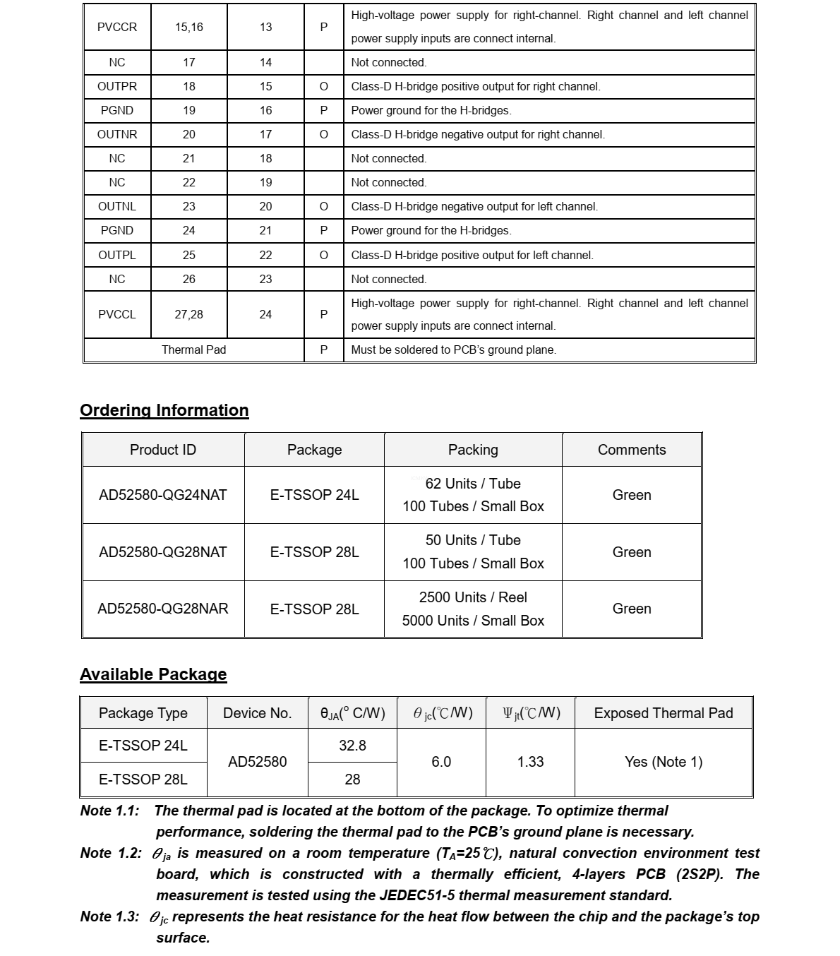AD52580,带功率限制的20W立体声D类音频放大器芯片PDF规格书下载