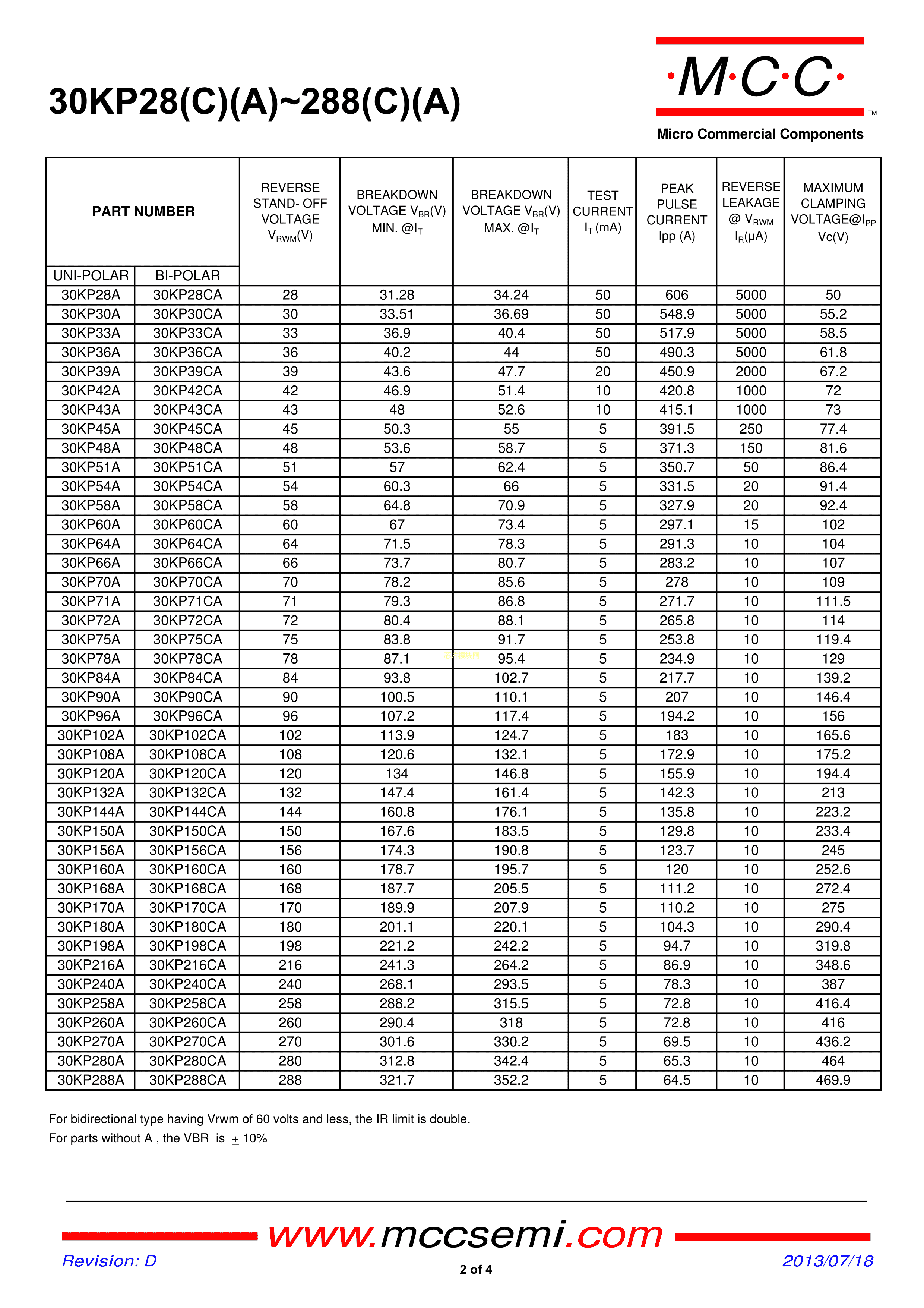 30KP70CA-TP数据手册R-6封装MCC(美微科)PDF规格书,中英文下载
