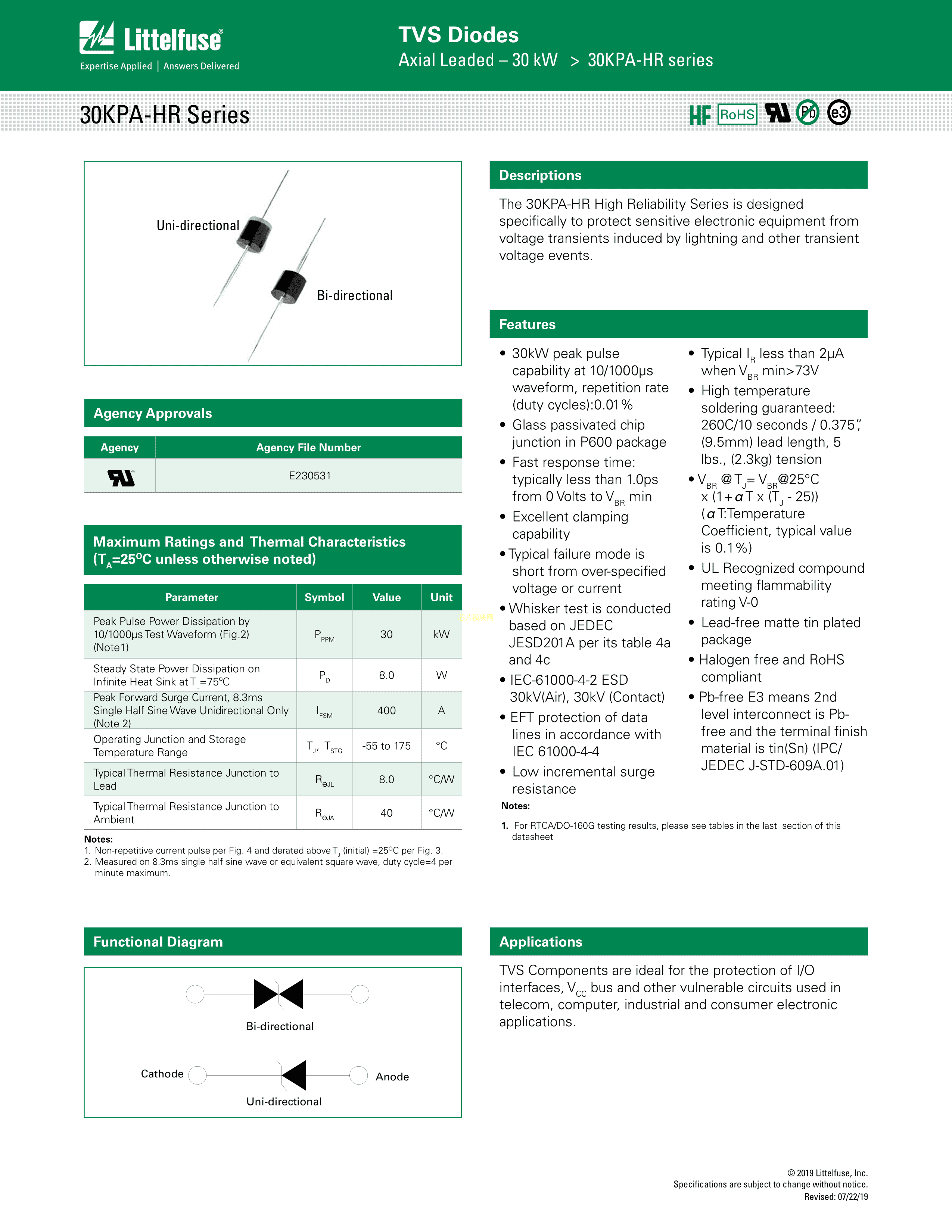 30KPA45CA-HR数据手册Axial封装Littelfuse(美国力特)PDF规格书,中英文下