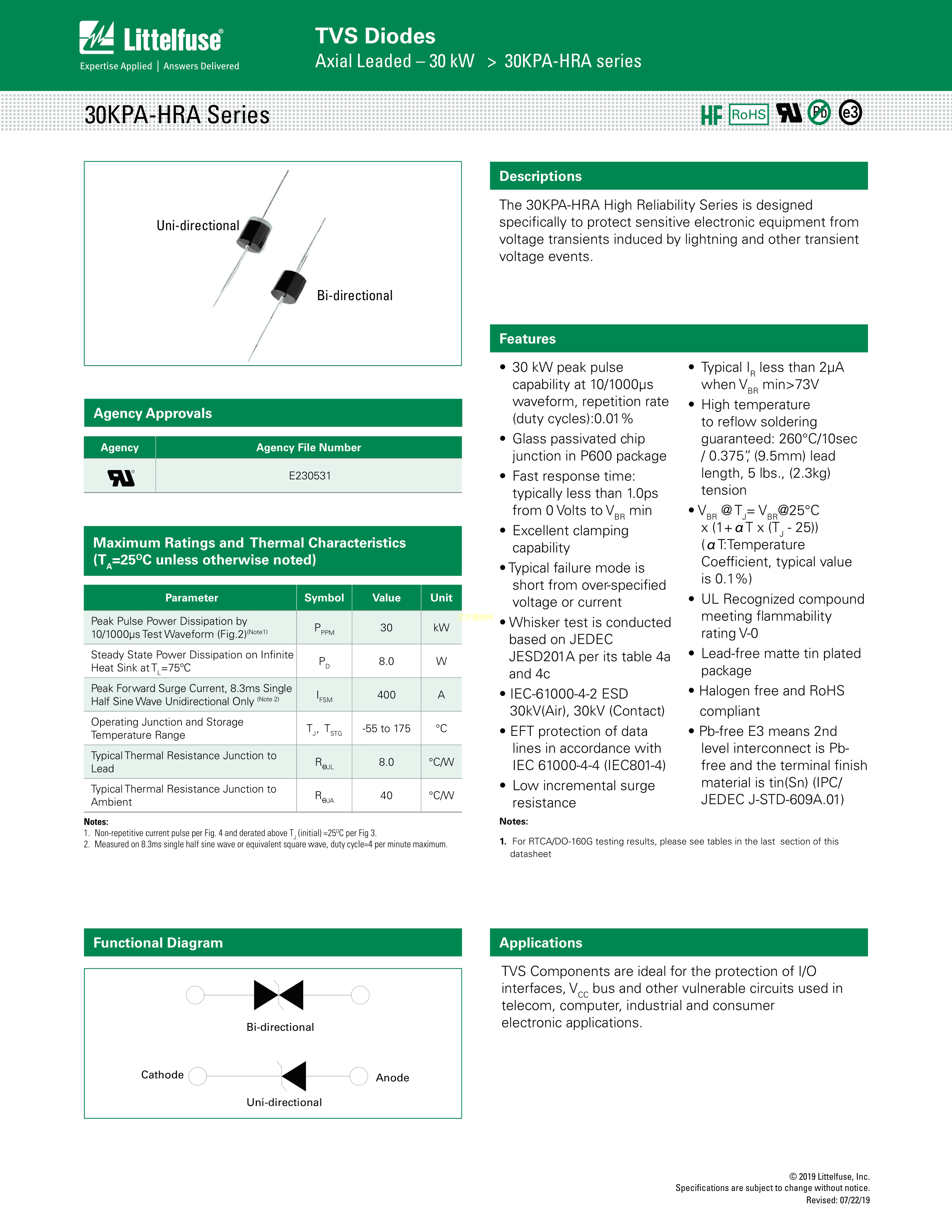30KPA64CA-HRA数据手册Axial封装Littelfuse(美国力特)PDF规格书,中英文