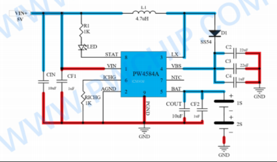 PW4584A同样是一款面向两节锂电池的升压充电芯片,但采用