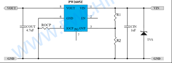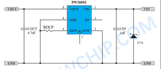 PW2605Z 通过持续监测VIN引脚电压、流经内部MOSFET的电流以及芯片结温来动态管理电源路径。