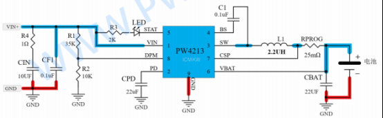 核心特性 :与前几款线性充电器不同, PW4213是一款 同步开关降压型 充电管理芯片,采用 SOP8-EP封装。其最大充电电流高达2A,且充电效率远高于线性方案,尤其在高压差(如9V/12V输入对3.7V电池充电)时优势明显,能显著减少发热。