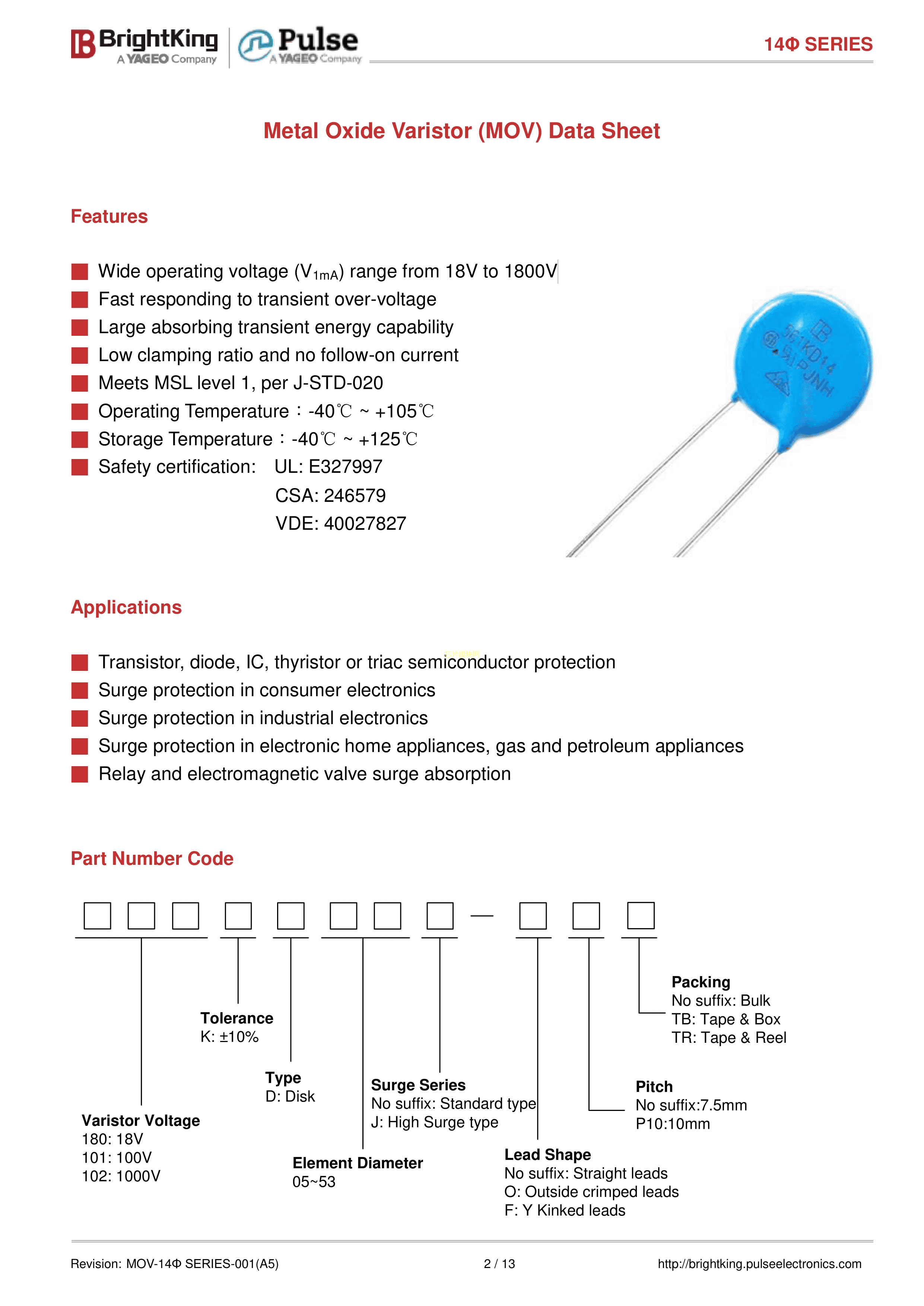391KD14J数据手册径向引线封装Brightking(台湾君耀)PDF规格书,中英文下载