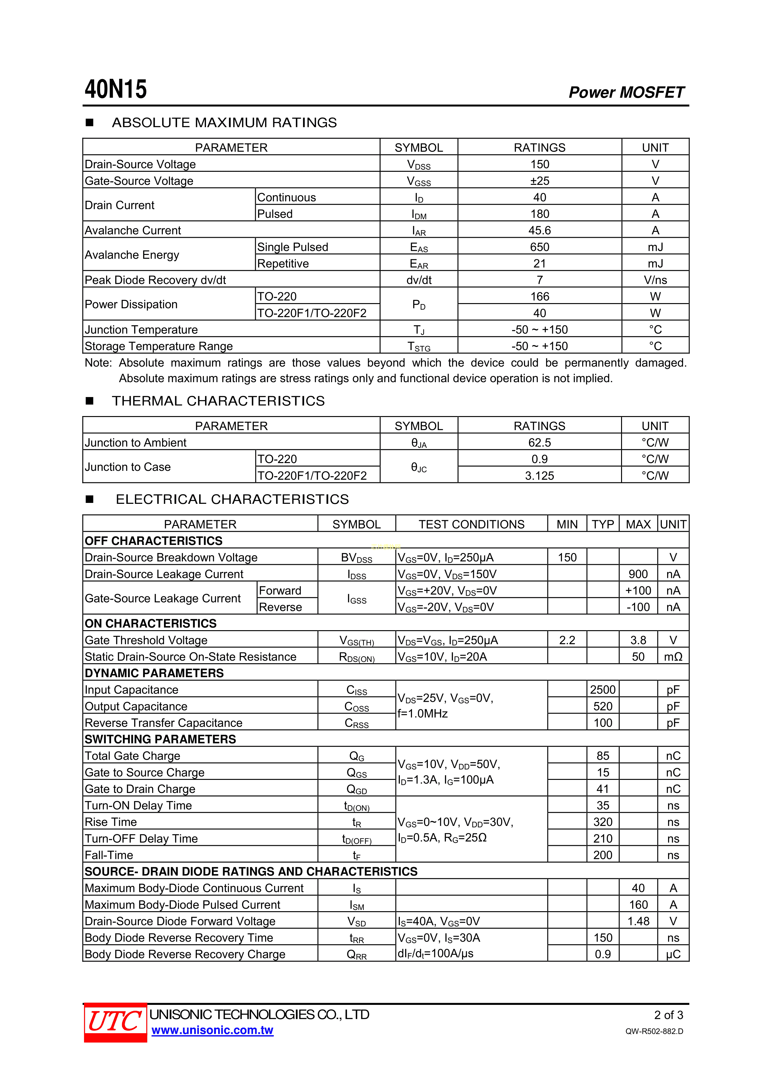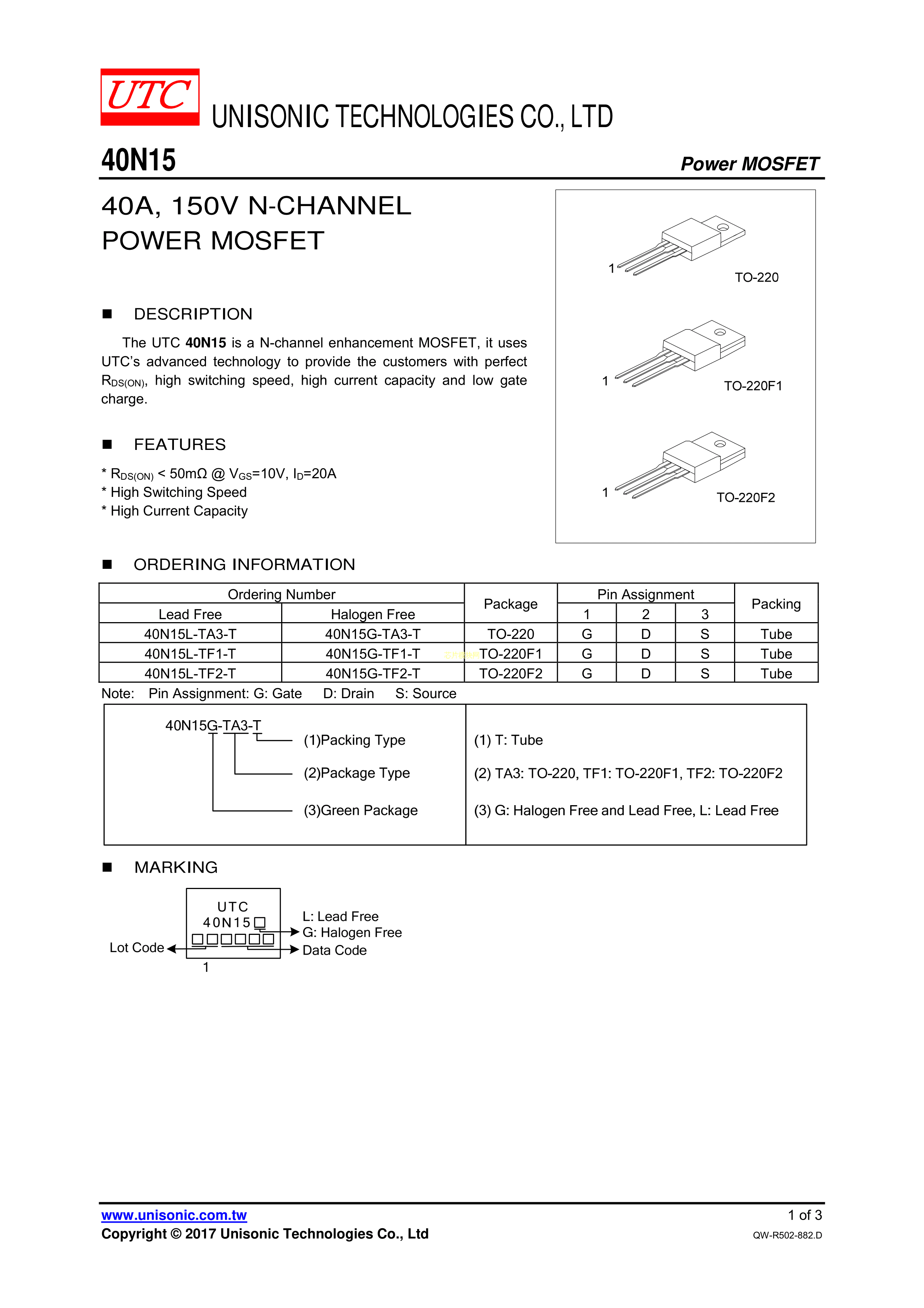 40N15L-TA3-T数据手册TO-220封装UTC(友顺)PDF规格书,中英文下载