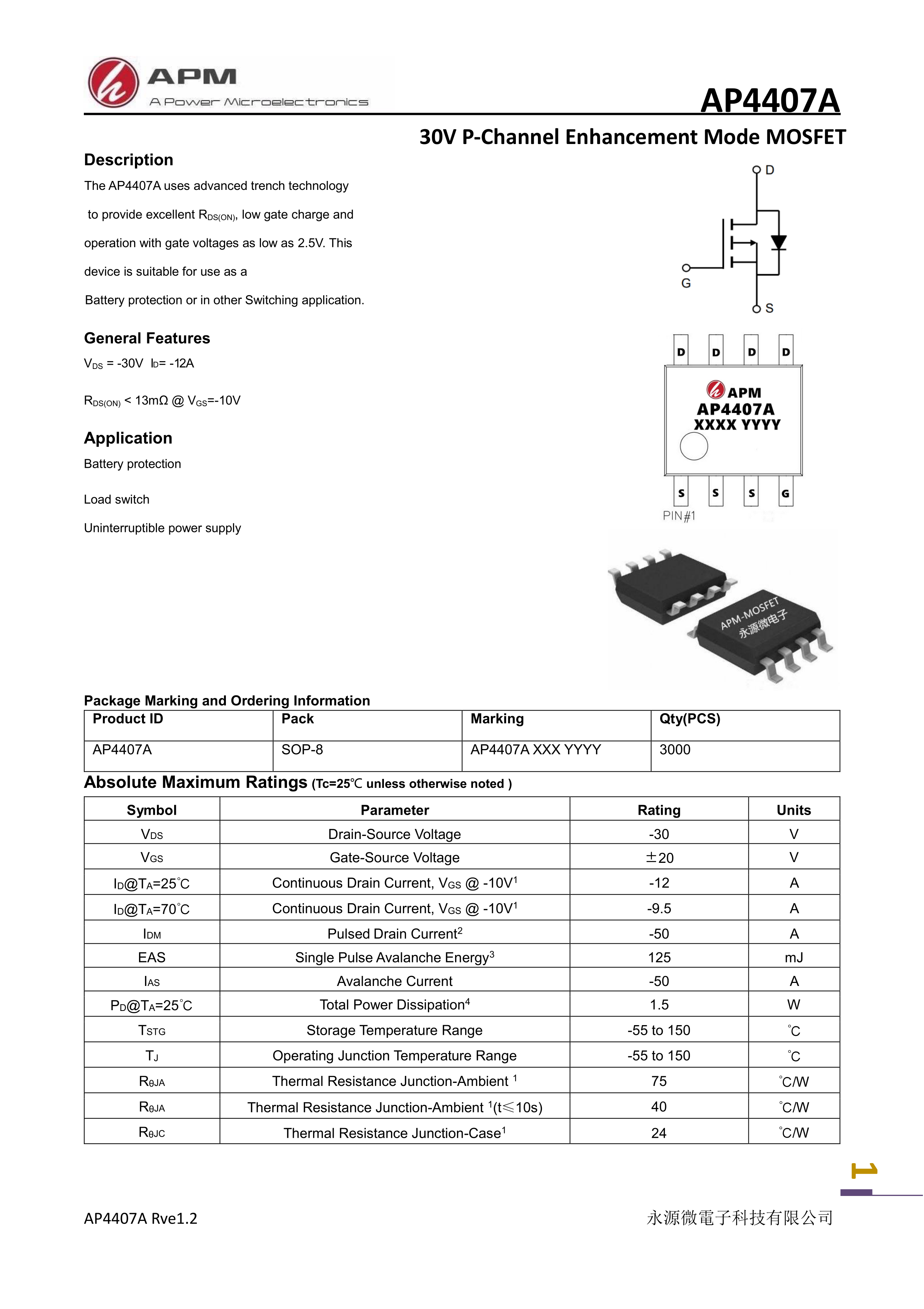 AP4407A数据手册SOP-8封装APM(永源微电子)PDF规格书,中英文下载