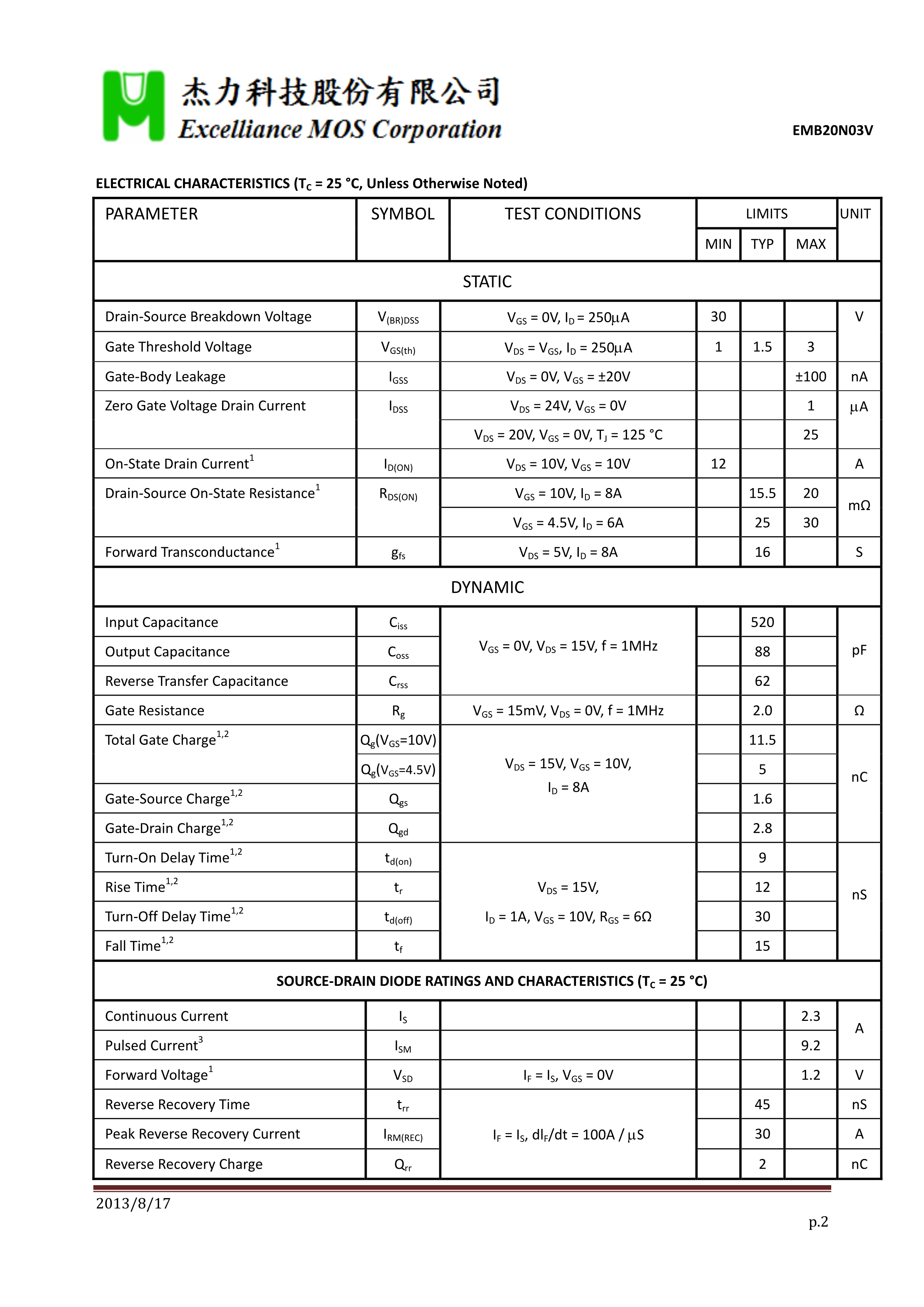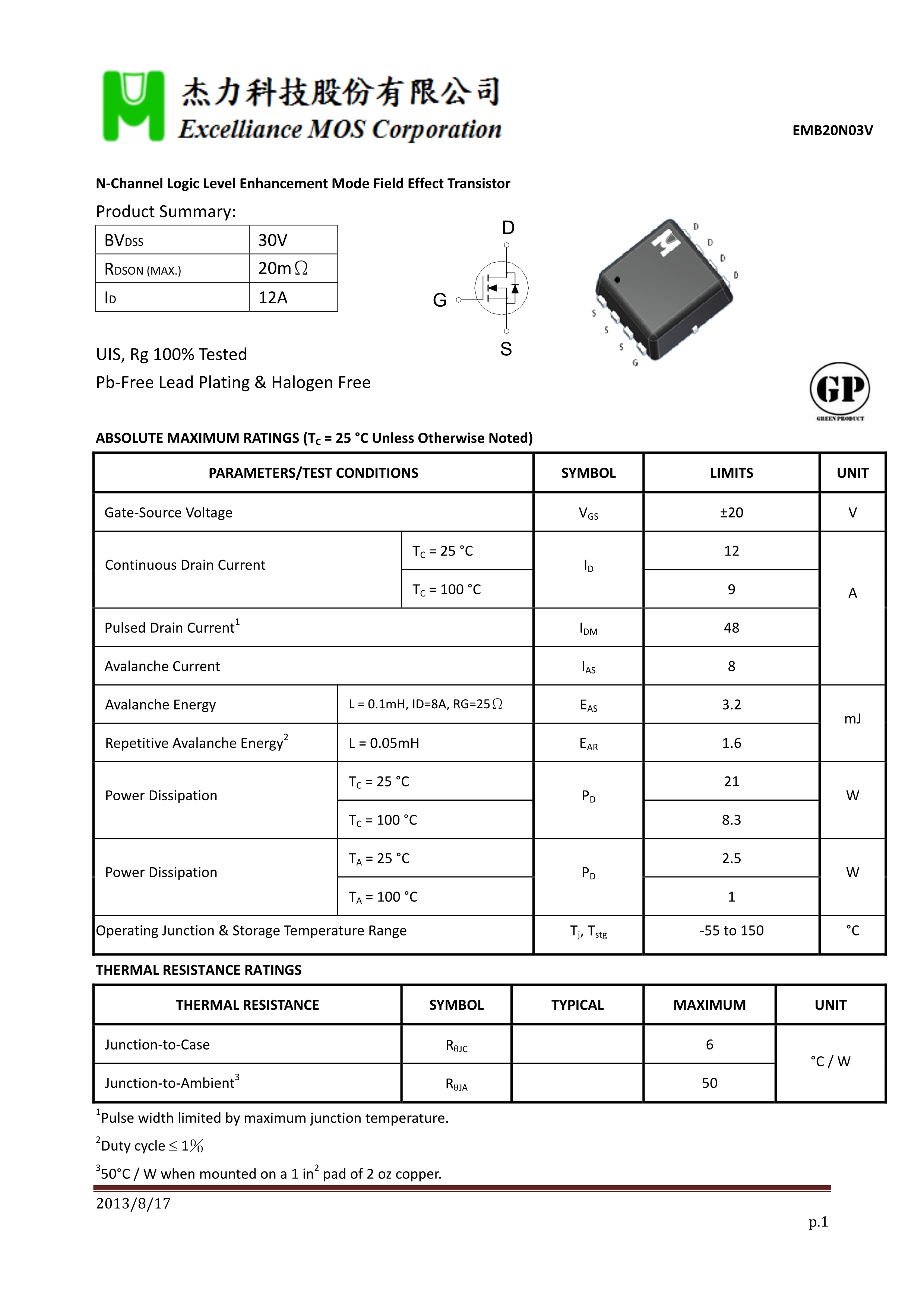 EMB20N03V数据手册EDFN(3x3)封装EMC(杰力)PDF规格书,中英文下载