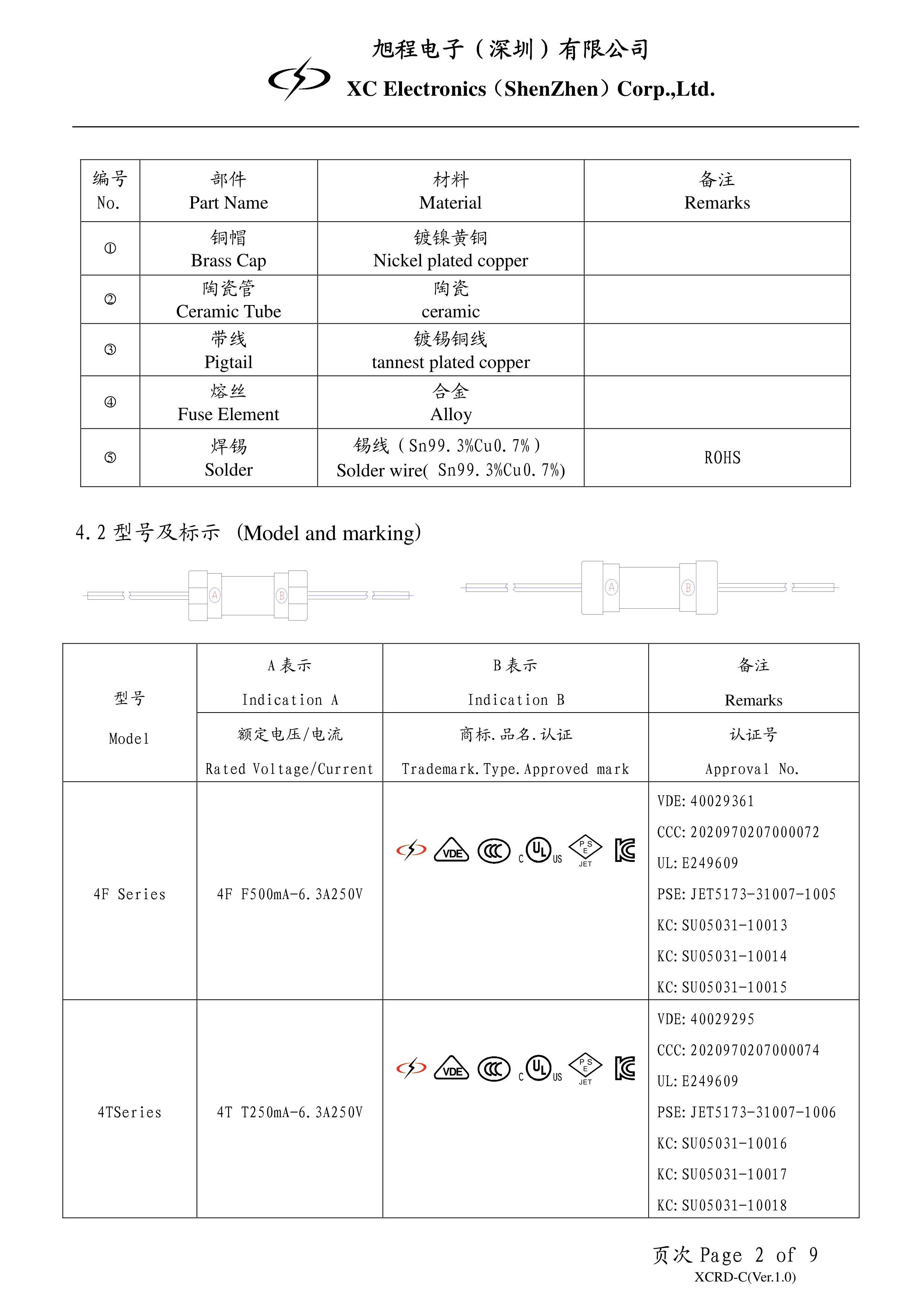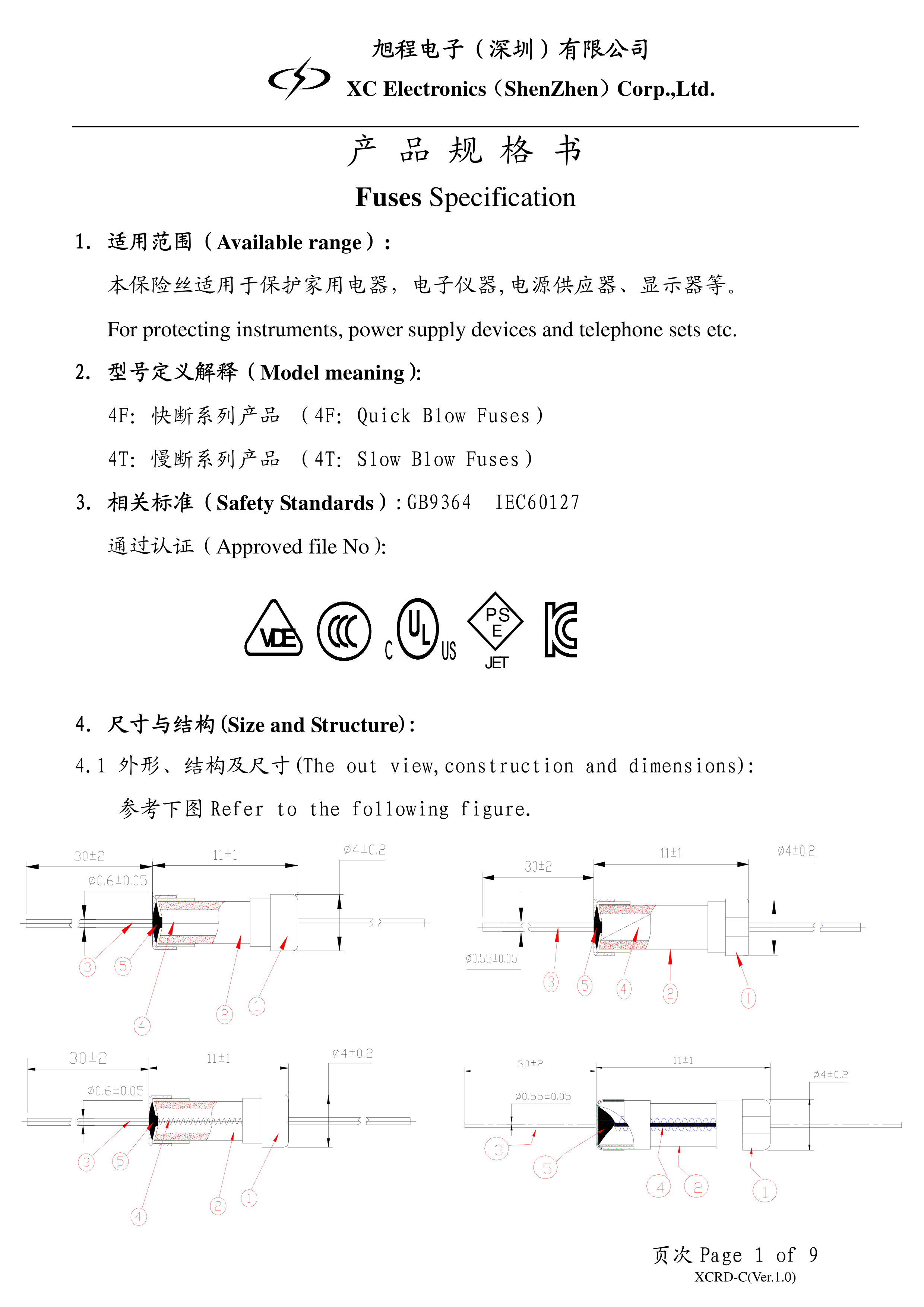 4F4A250V数据手册轴向引线4x11mm封装xcfuse(旭程)PDF规格书,中英文下载