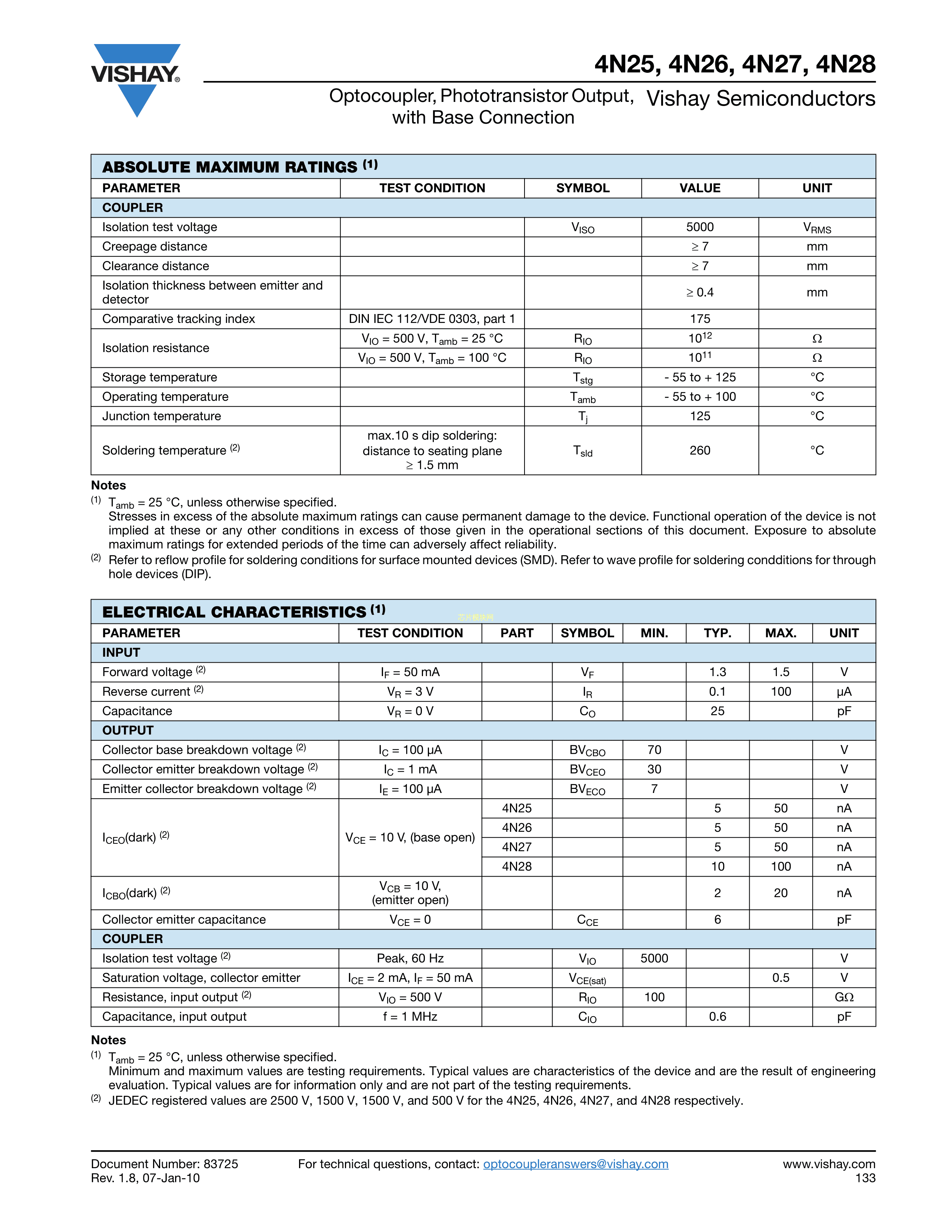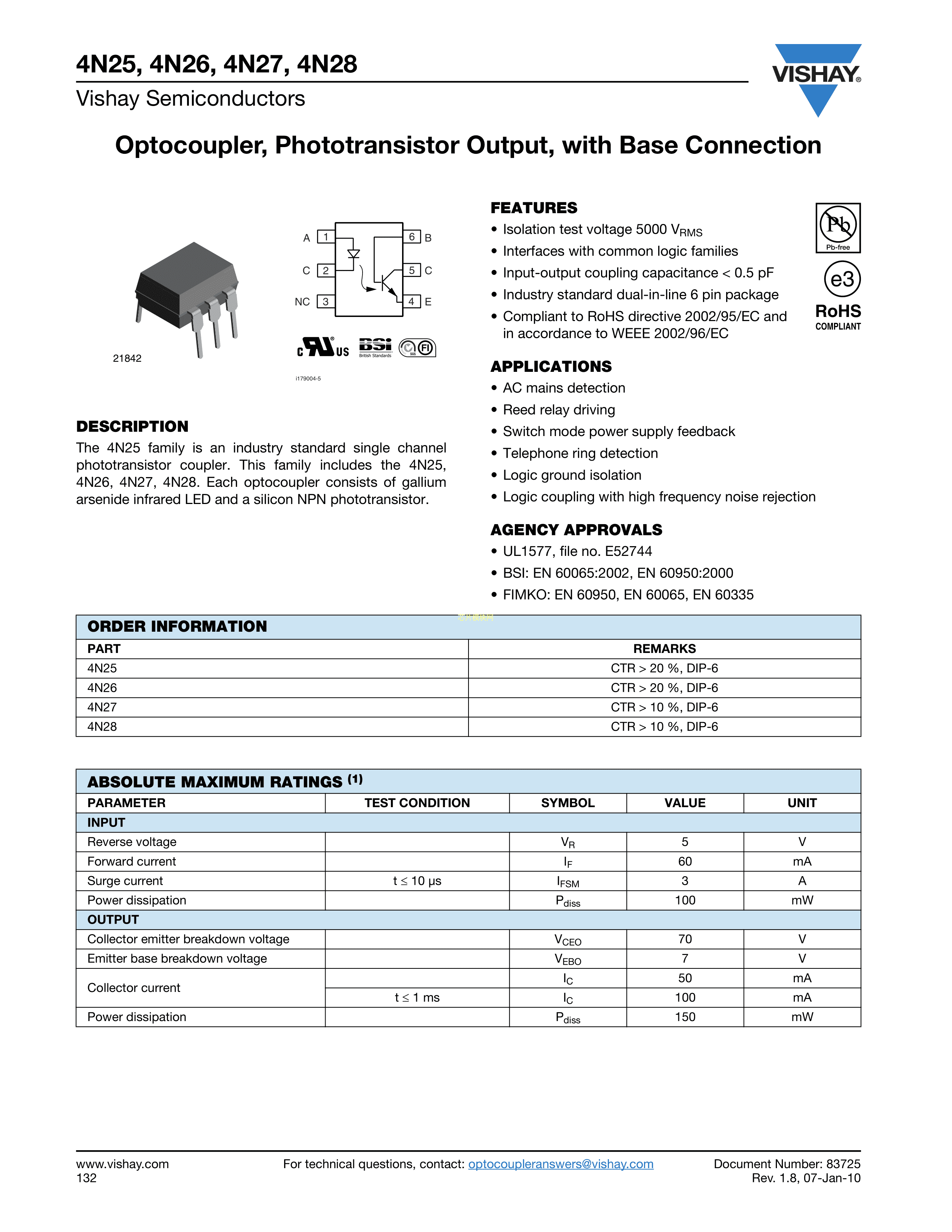 4N26数据手册DIP-6封装VISHAY(威世)PDF规格书,中英文下载