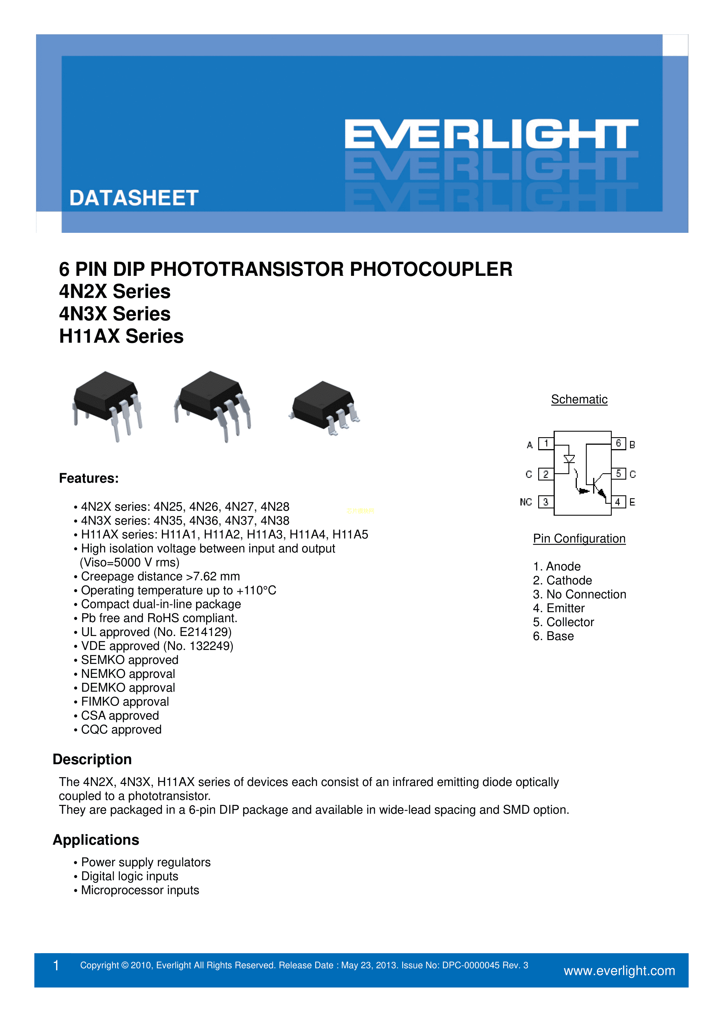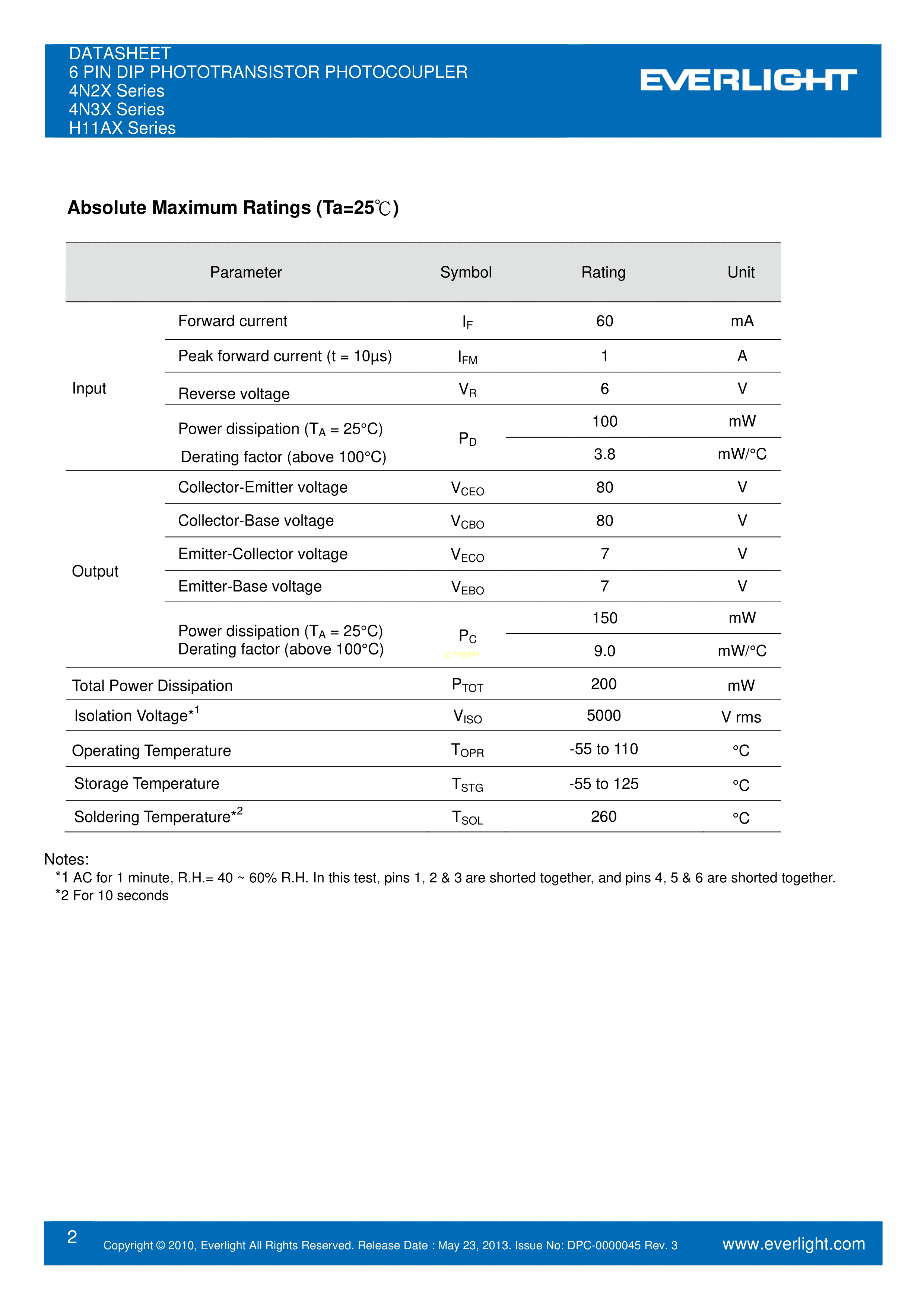 4N35S(TA)数据手册SMD-6封装EVERLIGHT(台湾亿光)PDF规格书,中英文下载