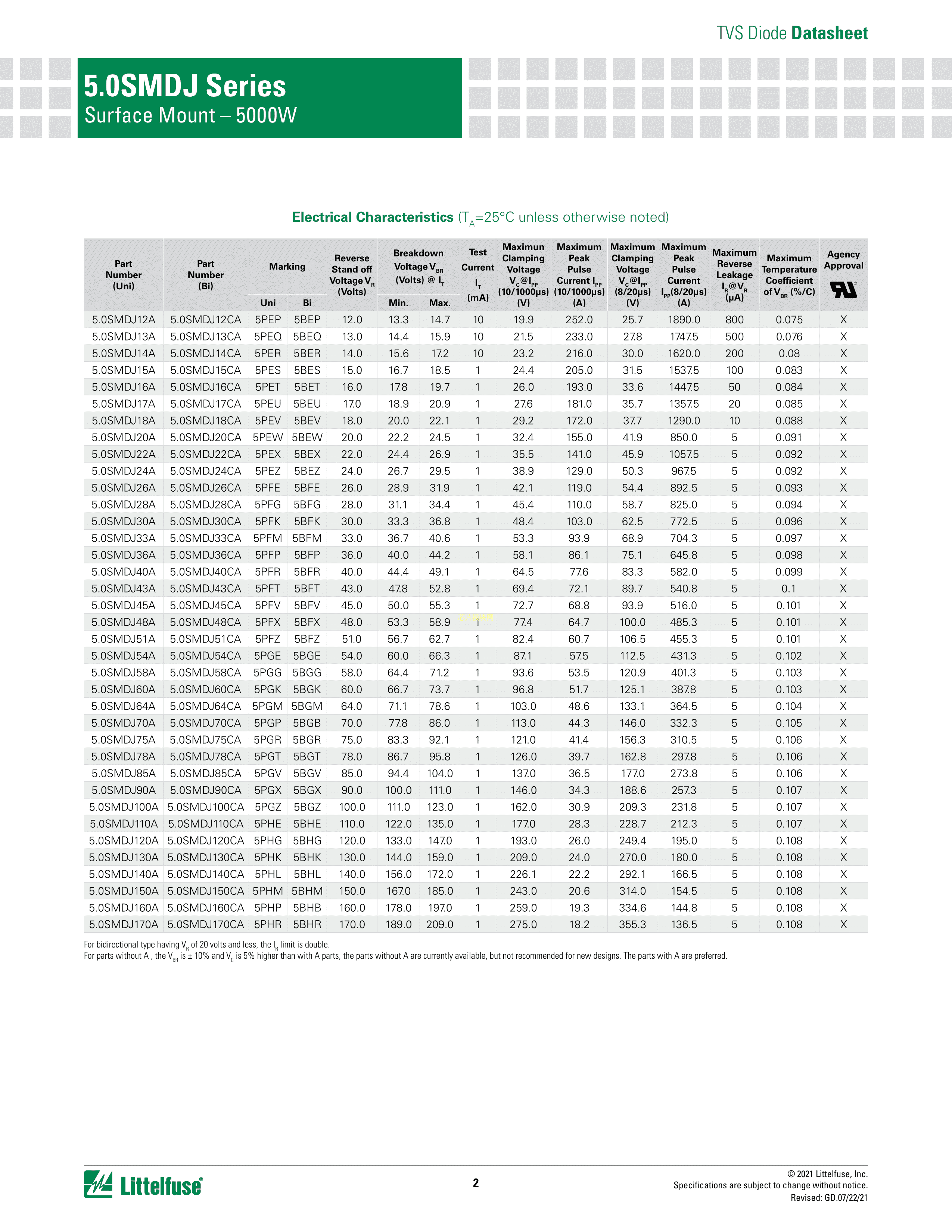5.0SMDJ110CA-T7数据手册DO-214AB(SMCJ)封装Littelfuse(美国力特