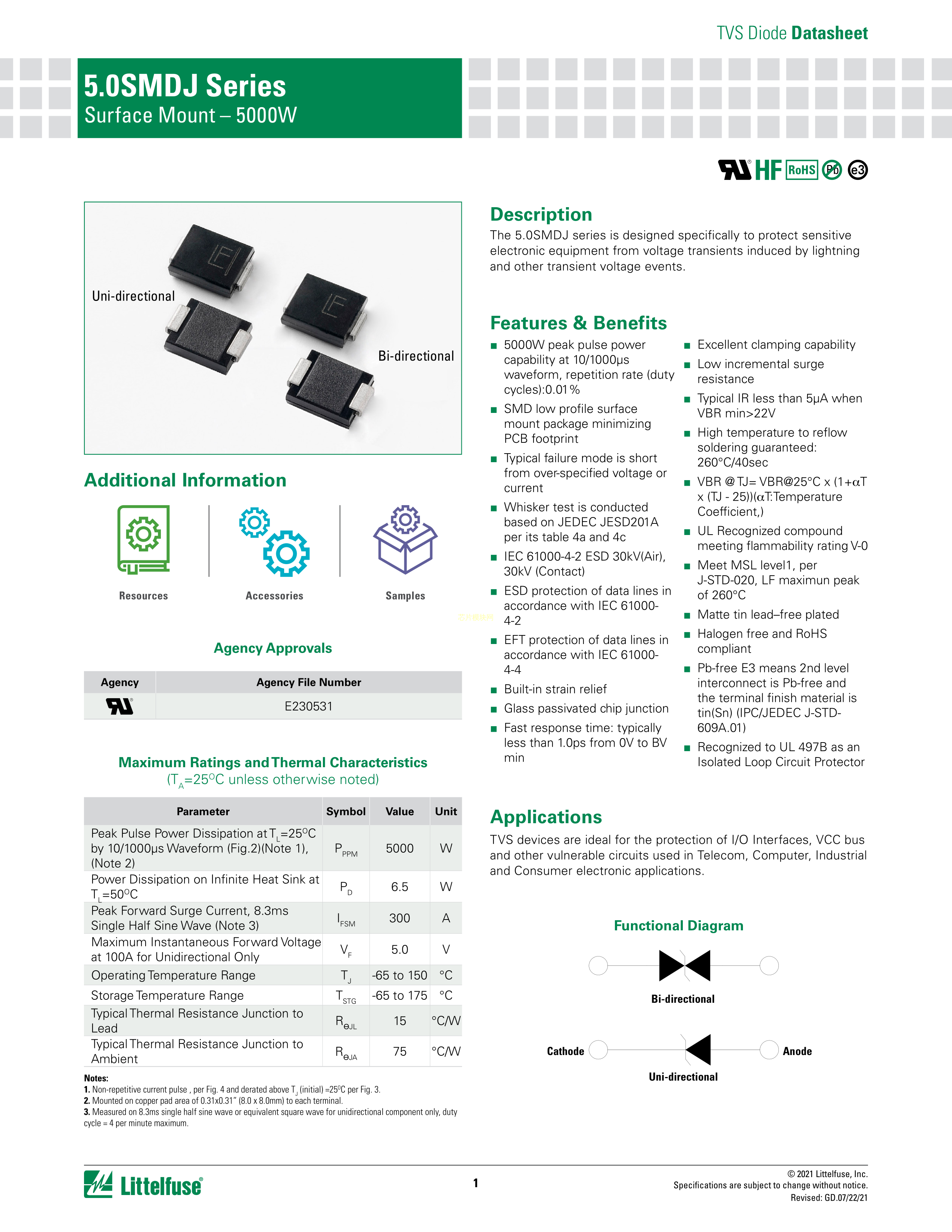 5.0SMDJ12CA数据手册DO-214AB(SMCJ)封装Littelfuse(美国力特)PDF