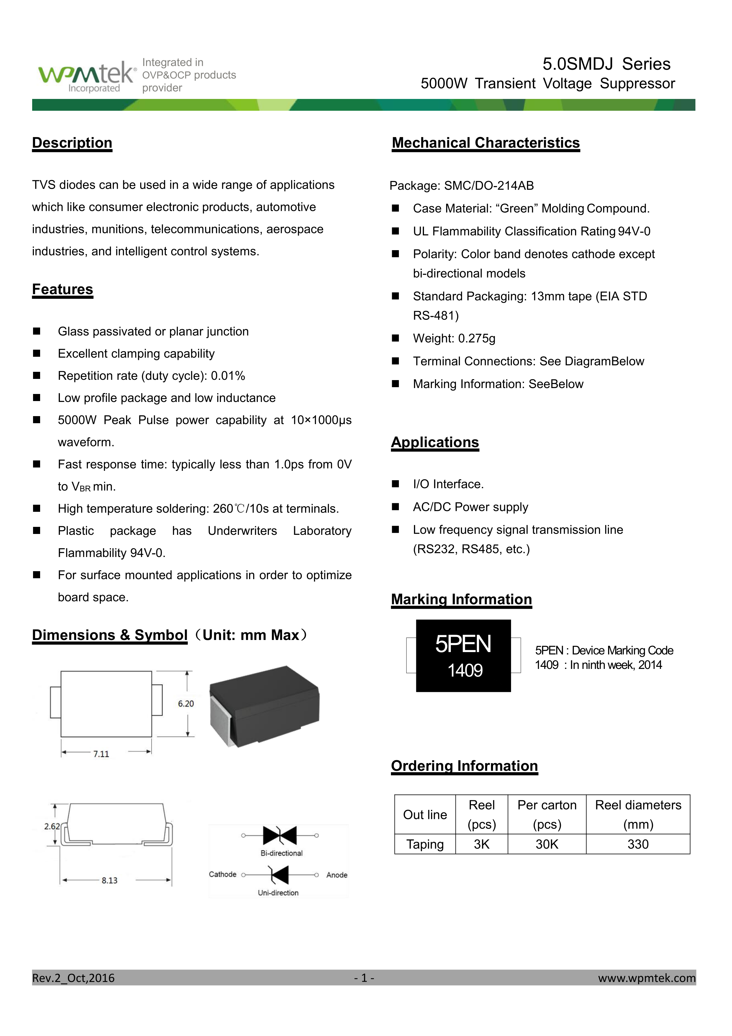 5.0SMDJ24A数据手册SMC封装WPMtek(维攀微)PDF规格书,中英文下载
