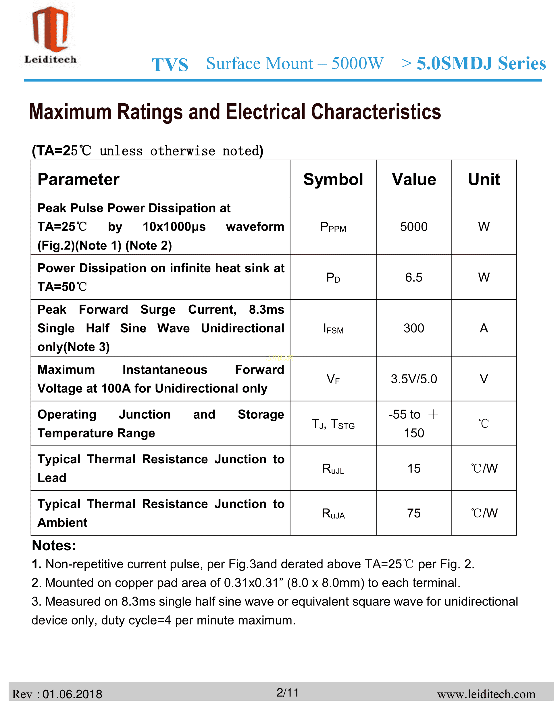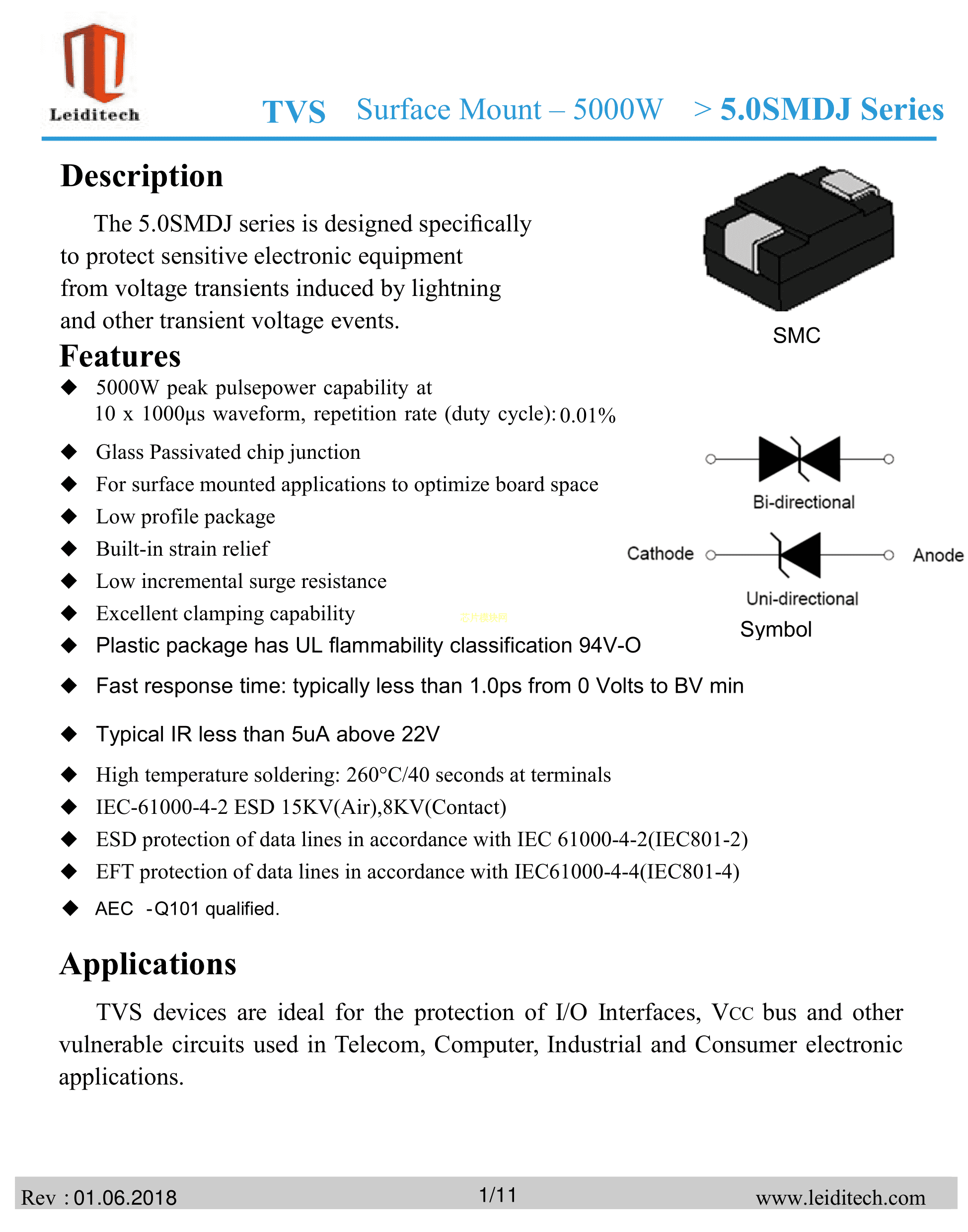 5.0SMDJ26A数据手册SMC封装Leiditech(雷卯电子)PDF规格书,中英文下载