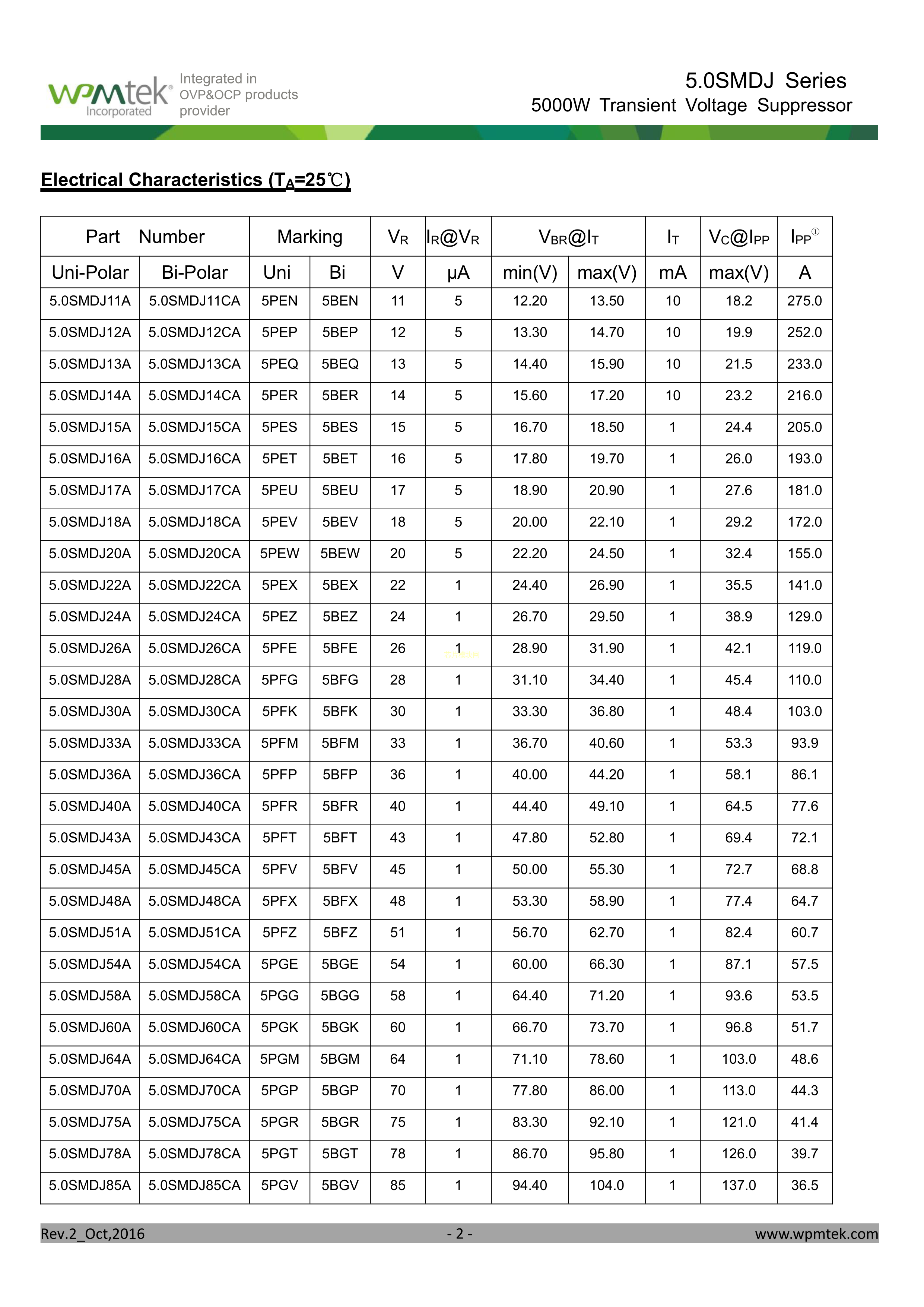 5.0SMDJ26A数据手册SMC封装WPMtek(维攀微)PDF规格书,中英文下载