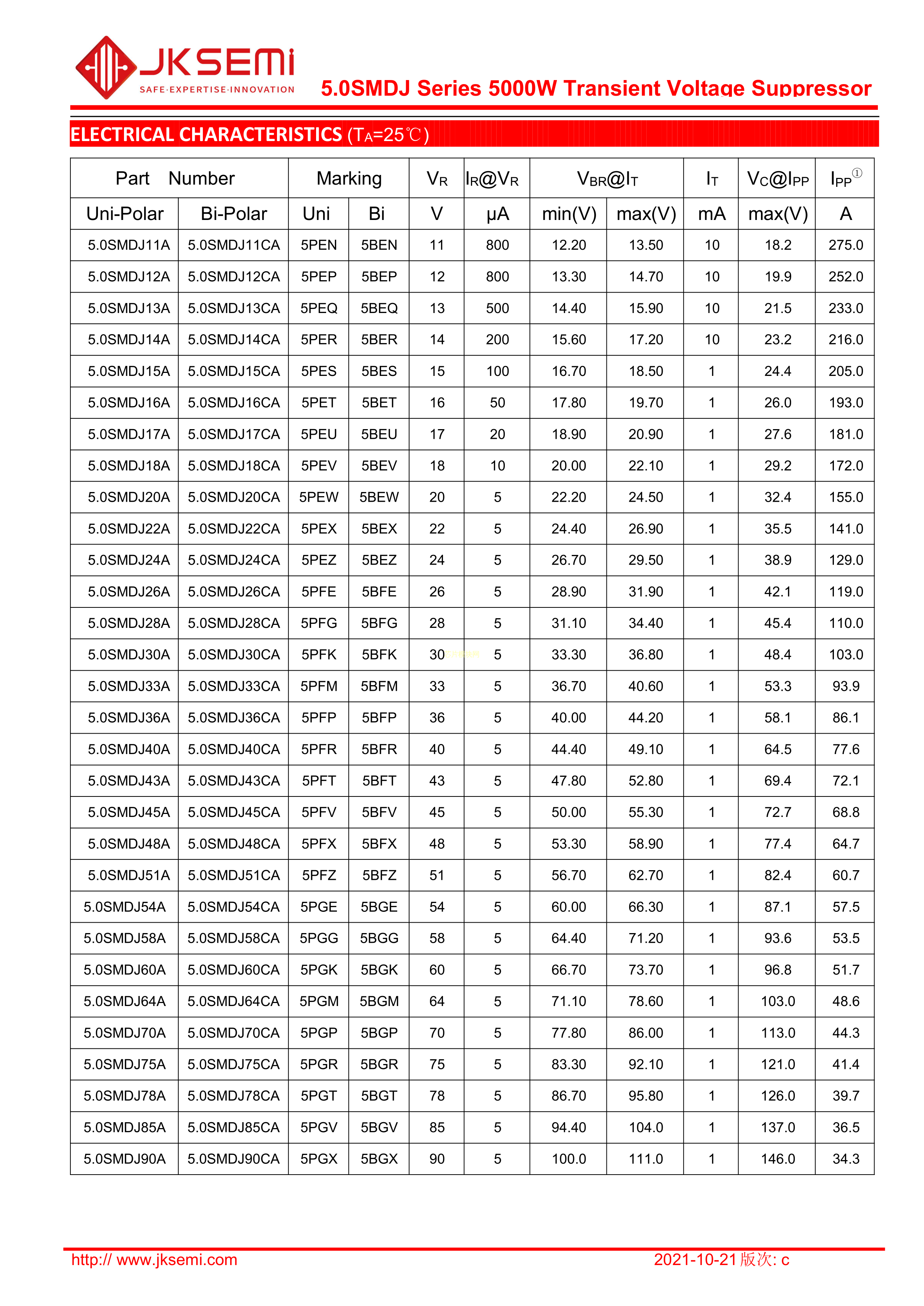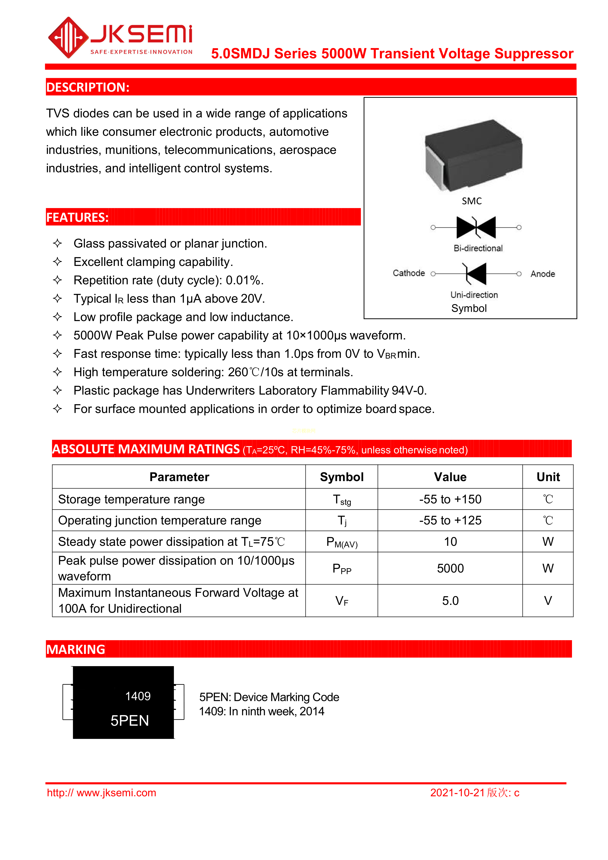 5.0SMDJ28CA数据手册SMC封装JKSEMI(金开盛)PDF规格书,中英文下载