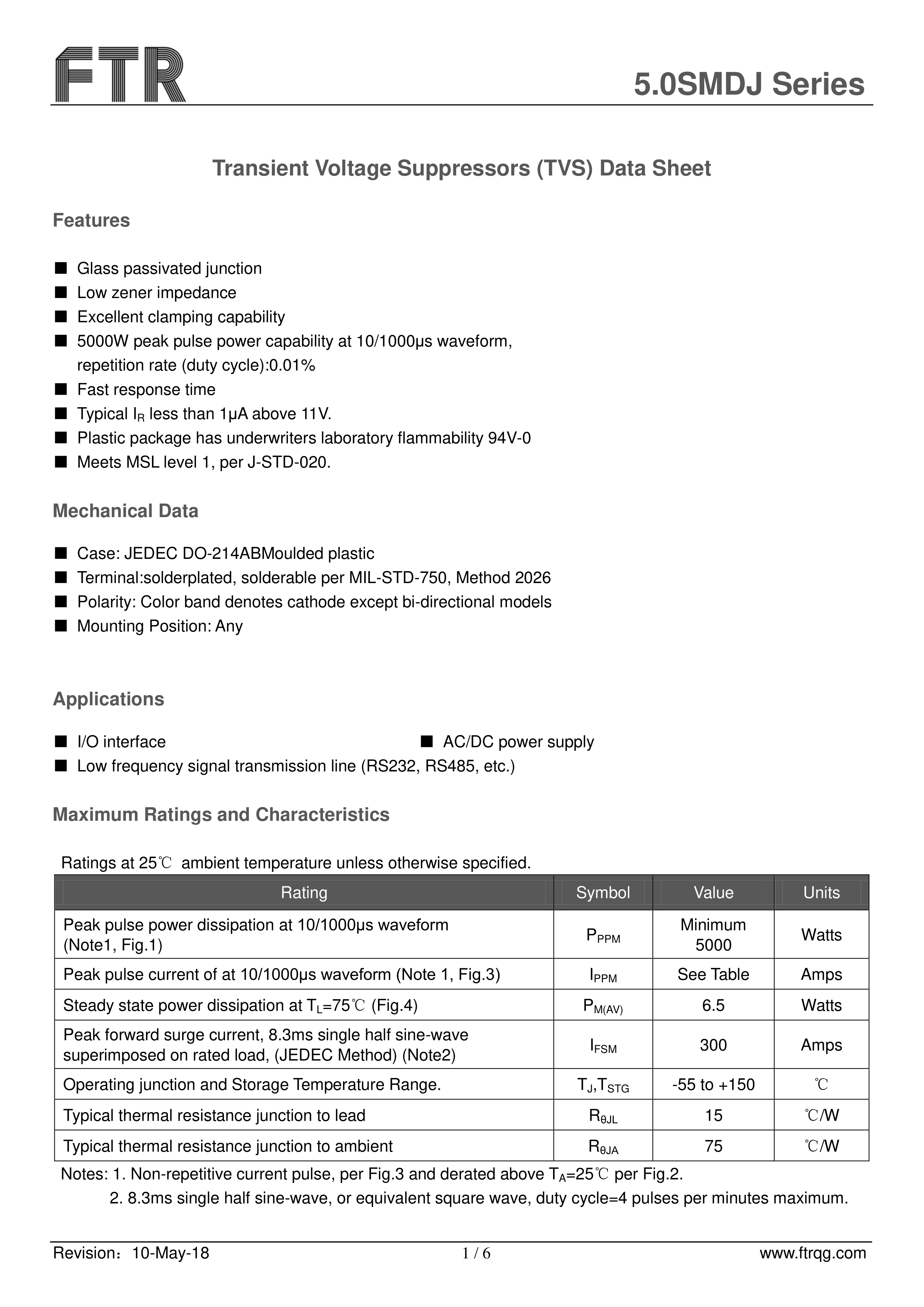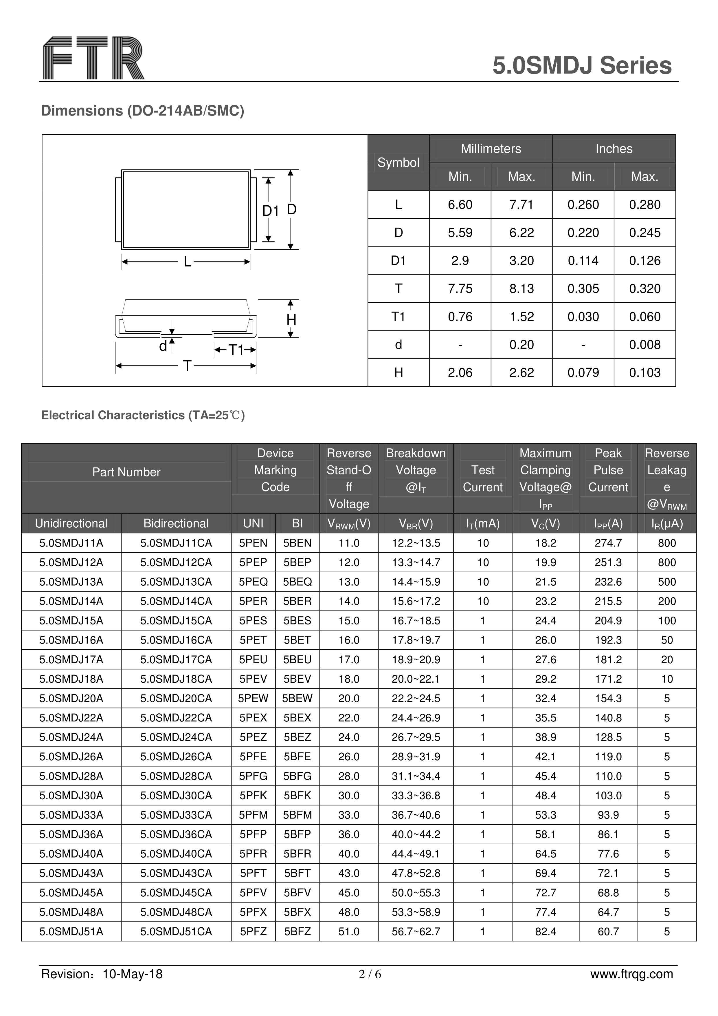 5.0SMDJ33CA数据手册SMC(DO-214AB)封装FTR(乔光电子)PDF规格书,中英文下