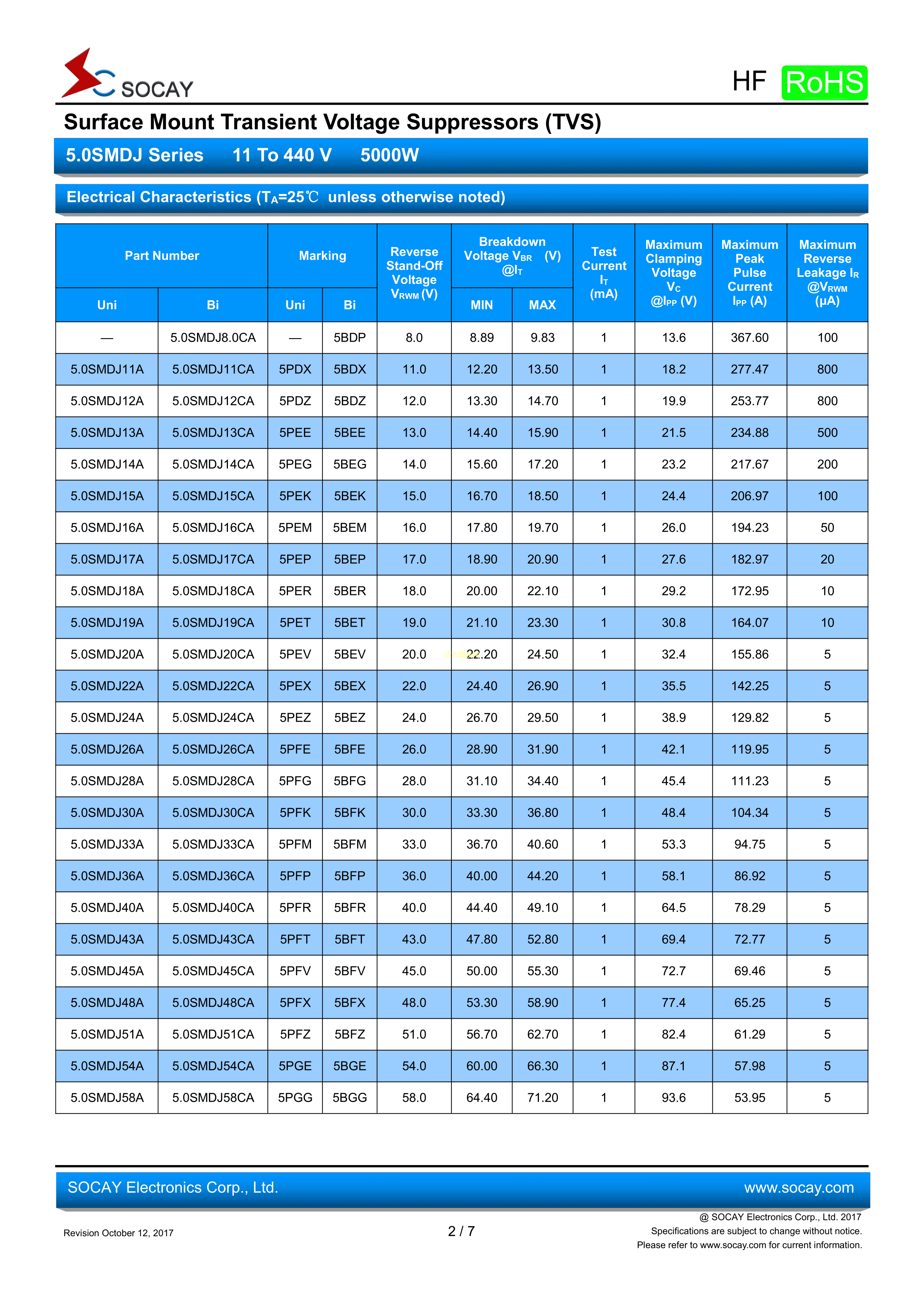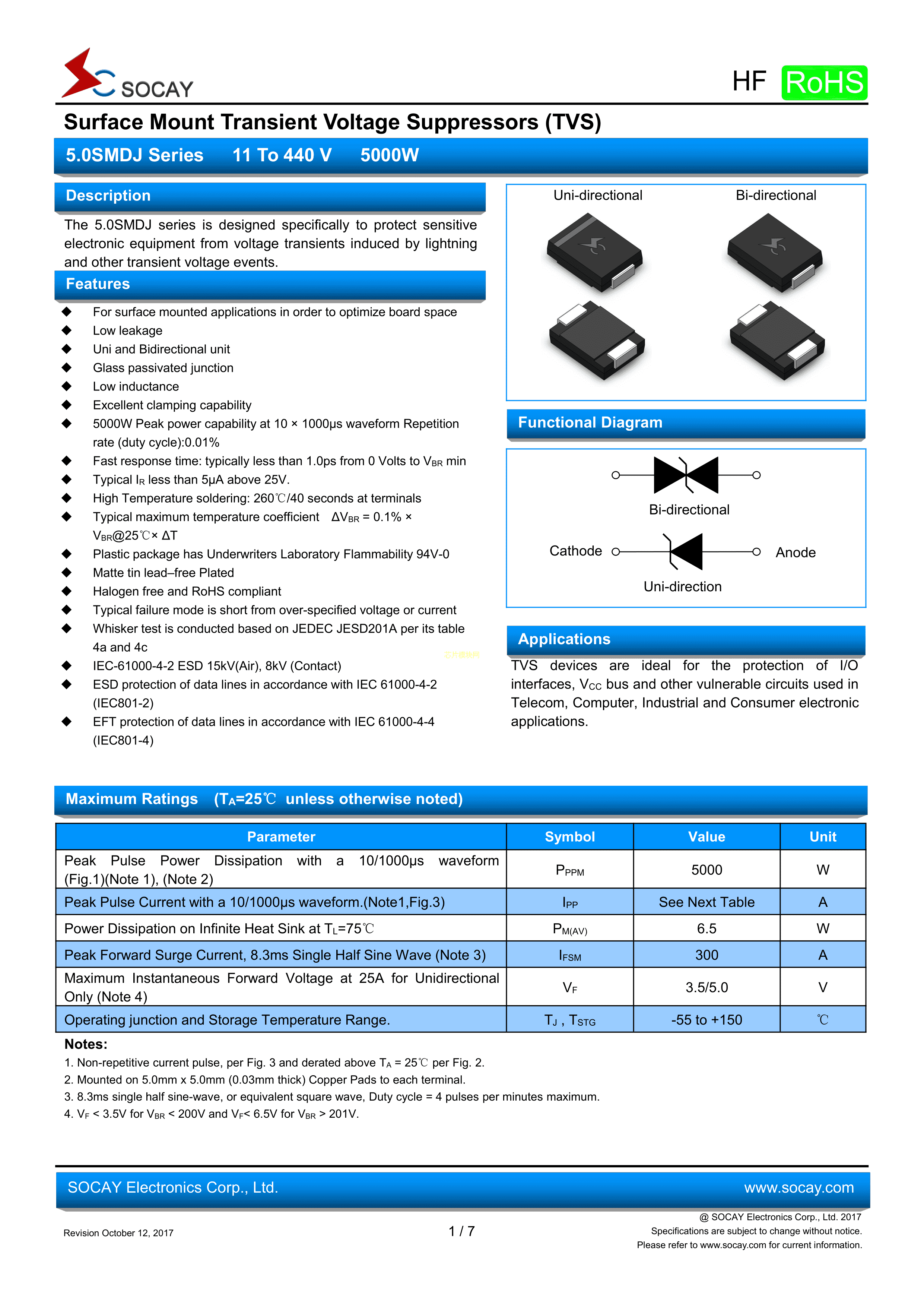 5.0SMDJ33CA数据手册SMC(DO-214AB)封装SOCAY(硕凯)PDF规格书,中英文下