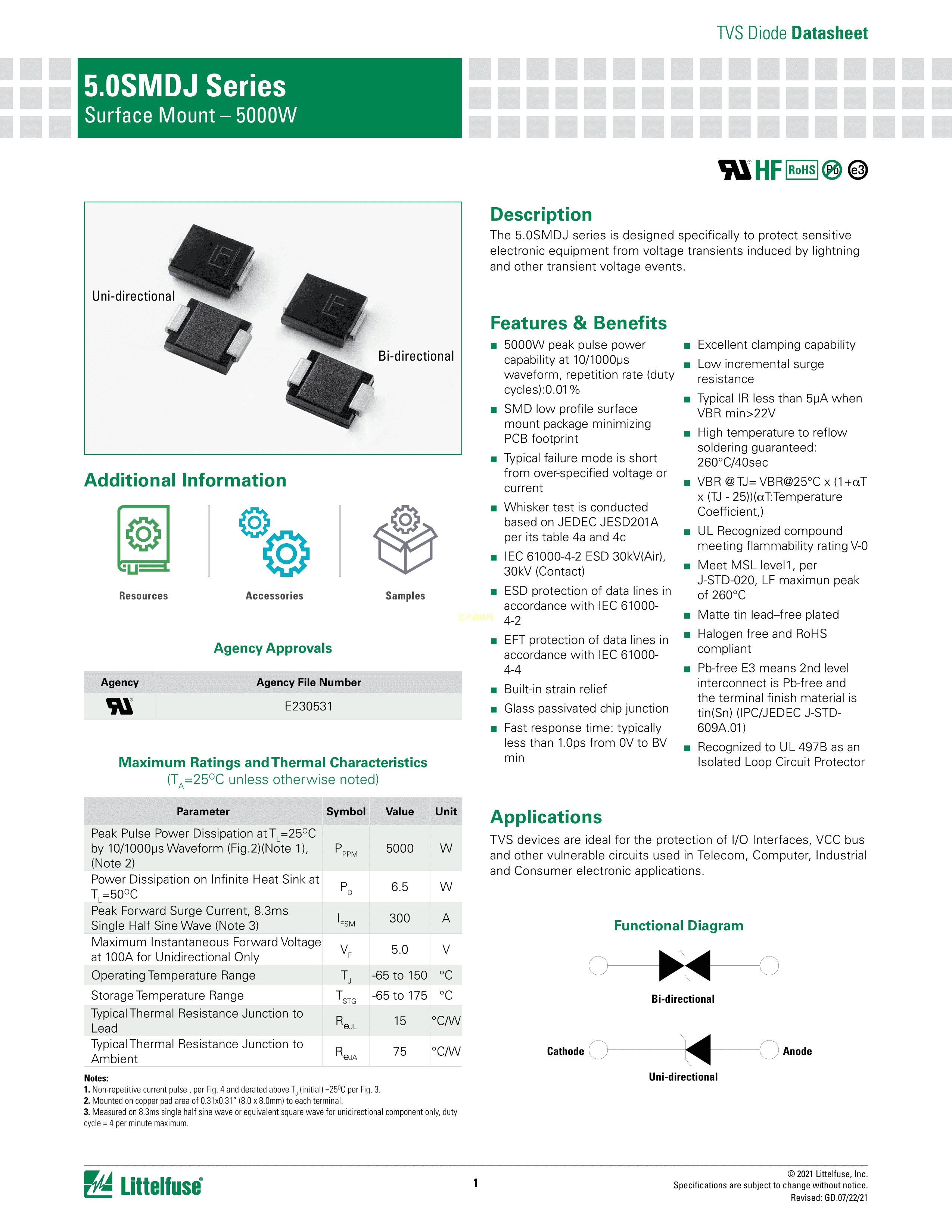 5.0SMDJ75CA-T7数据手册DO-214AB(SMCJ)封装Littelfuse(美国力特)