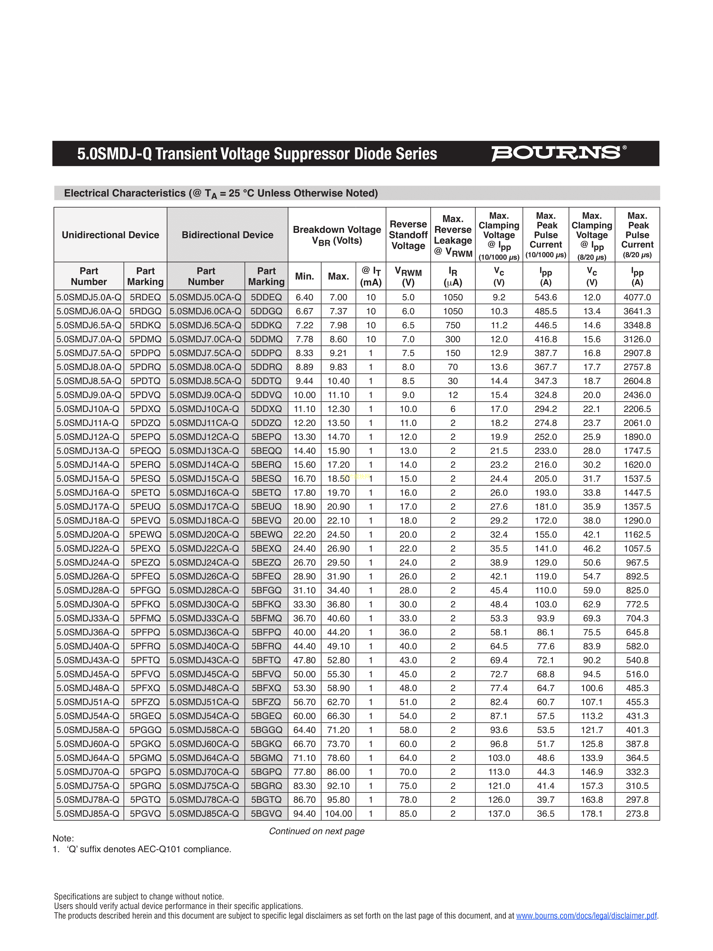 5.0SMDJ78A-Q数据手册SMC(DO-214AB)封装BOURNSPDF规格书,中英文下载