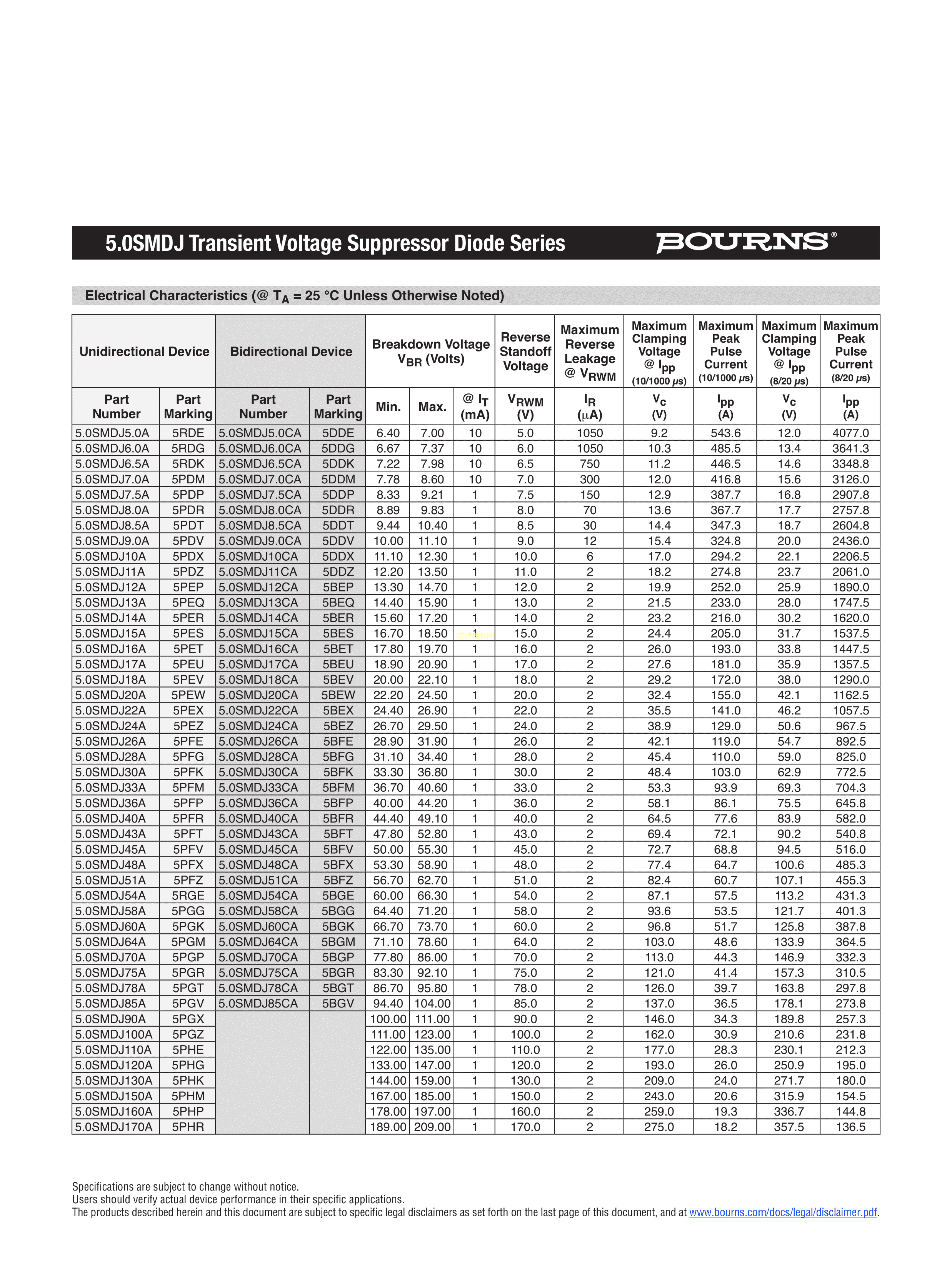 5.0SMDJ78CA-H数据手册SMC(DO-214AB)封装BOURNSPDF规格书,中英文下载