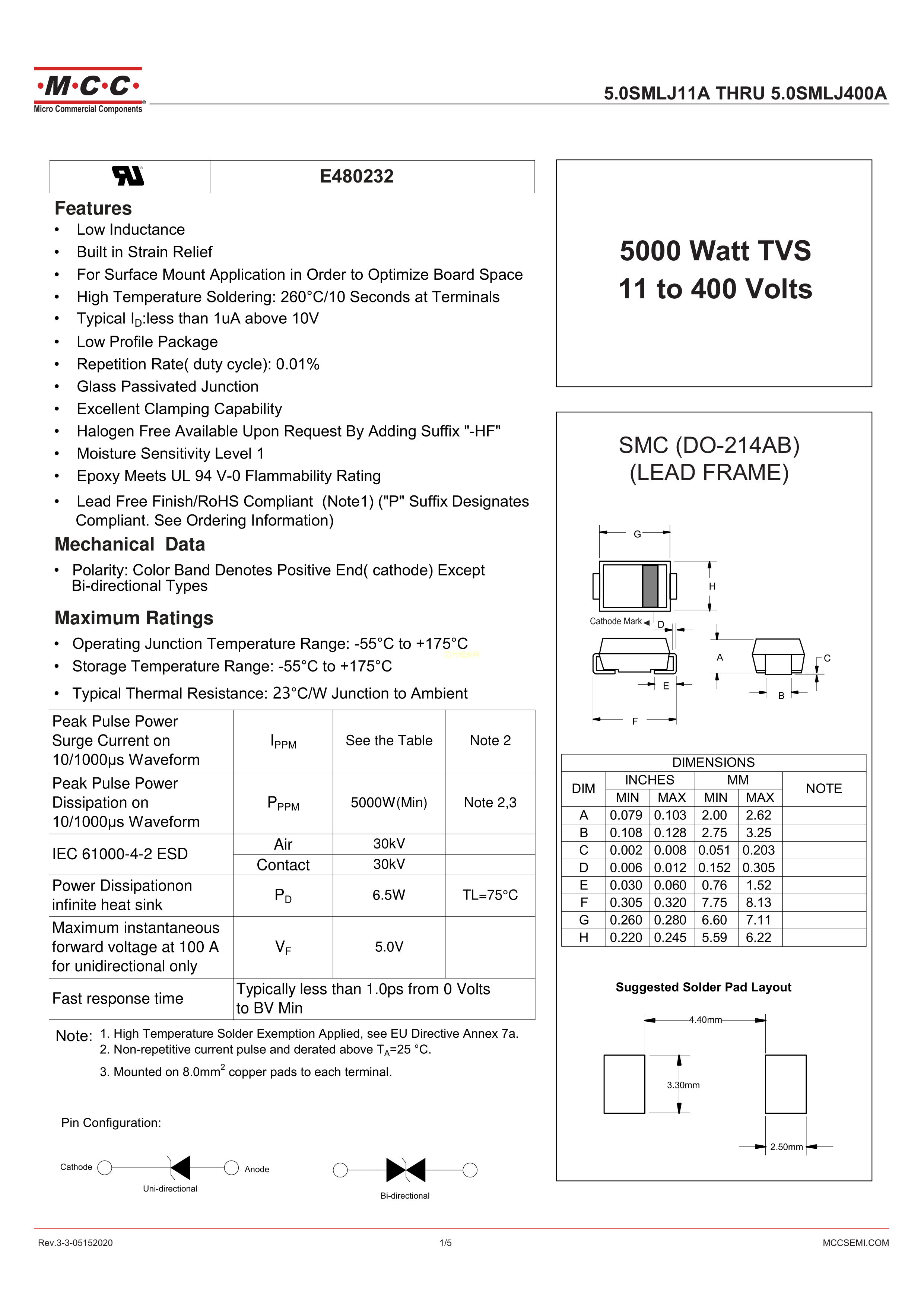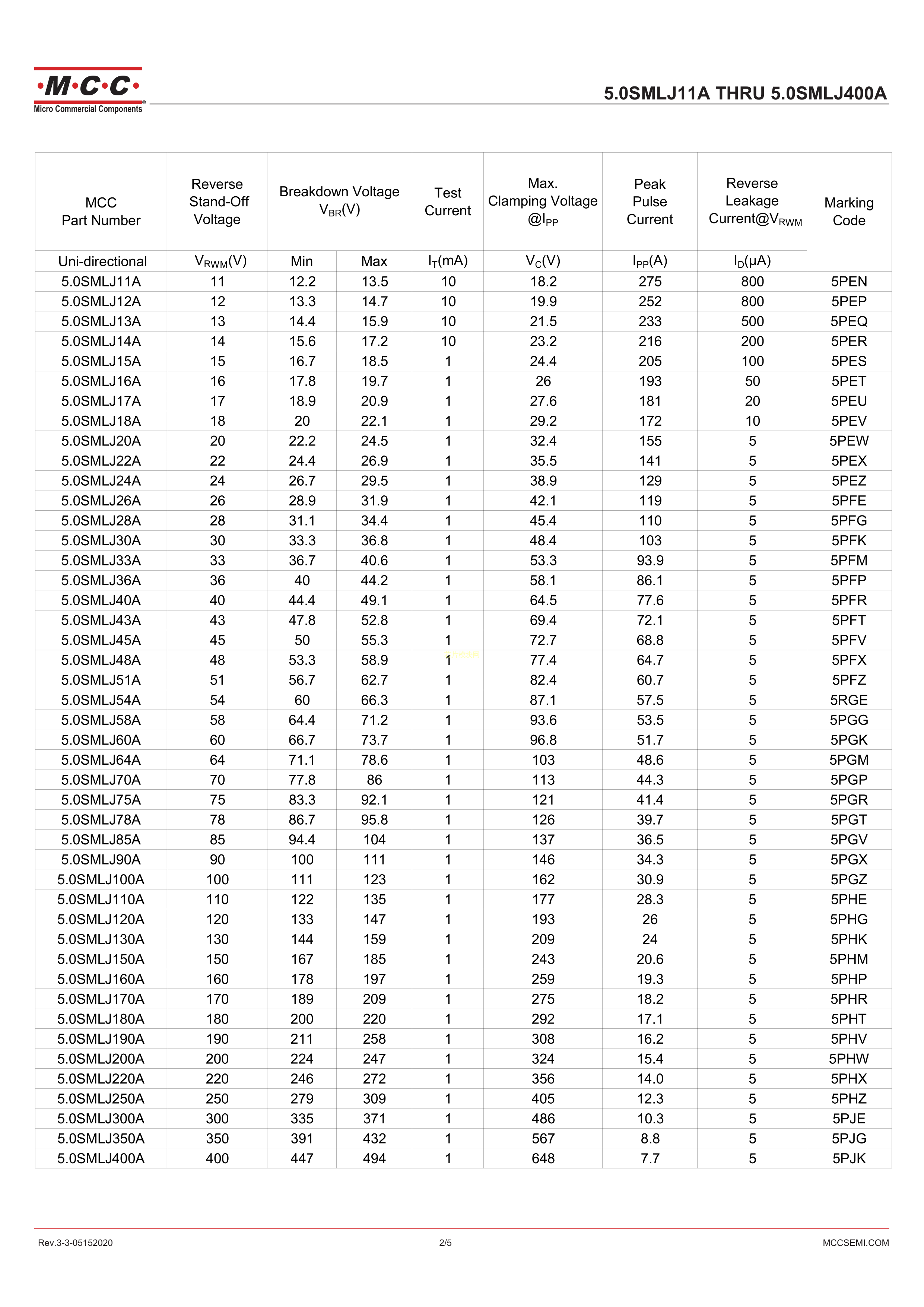 5.0SMLJ64A-TP数据手册SMC封装MCC(美微科)PDF规格书,中英文下载
