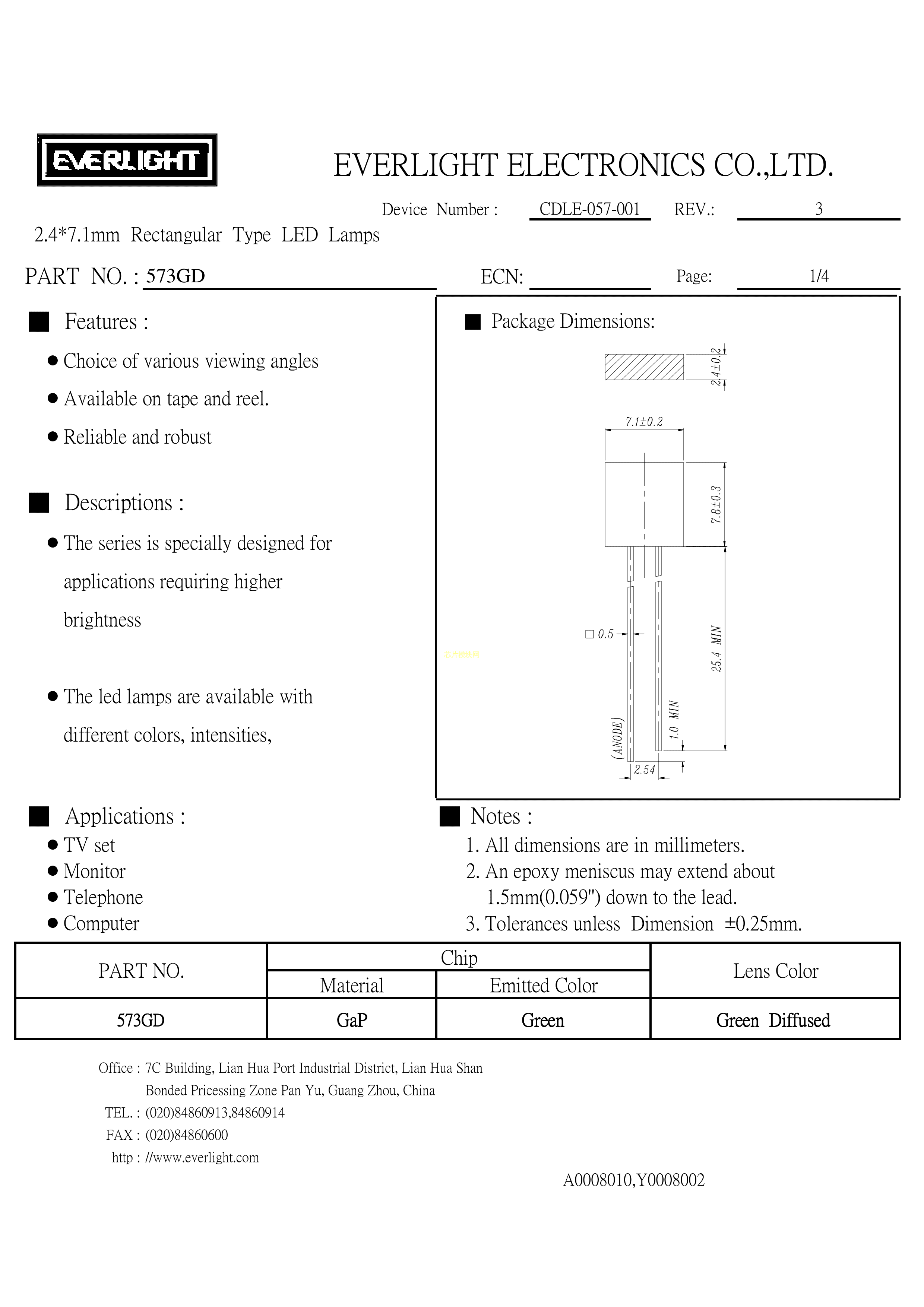 573GD数据手册插件封装EVERLIGHT(台湾亿光)PDF规格书,中英文下载