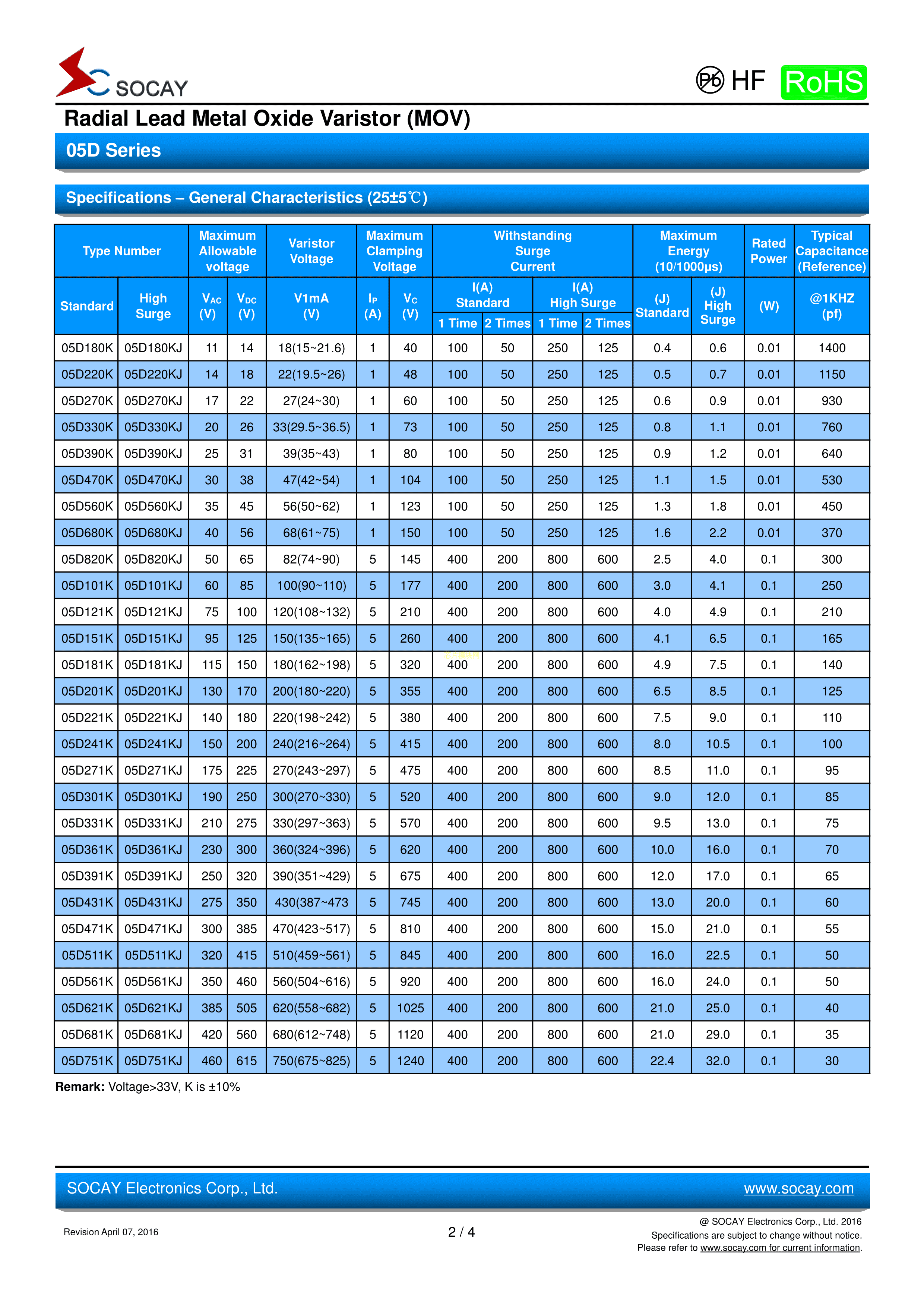 5D271K数据手册径向引线封装SOCAY(硕凯)PDF规格书,中英文下载