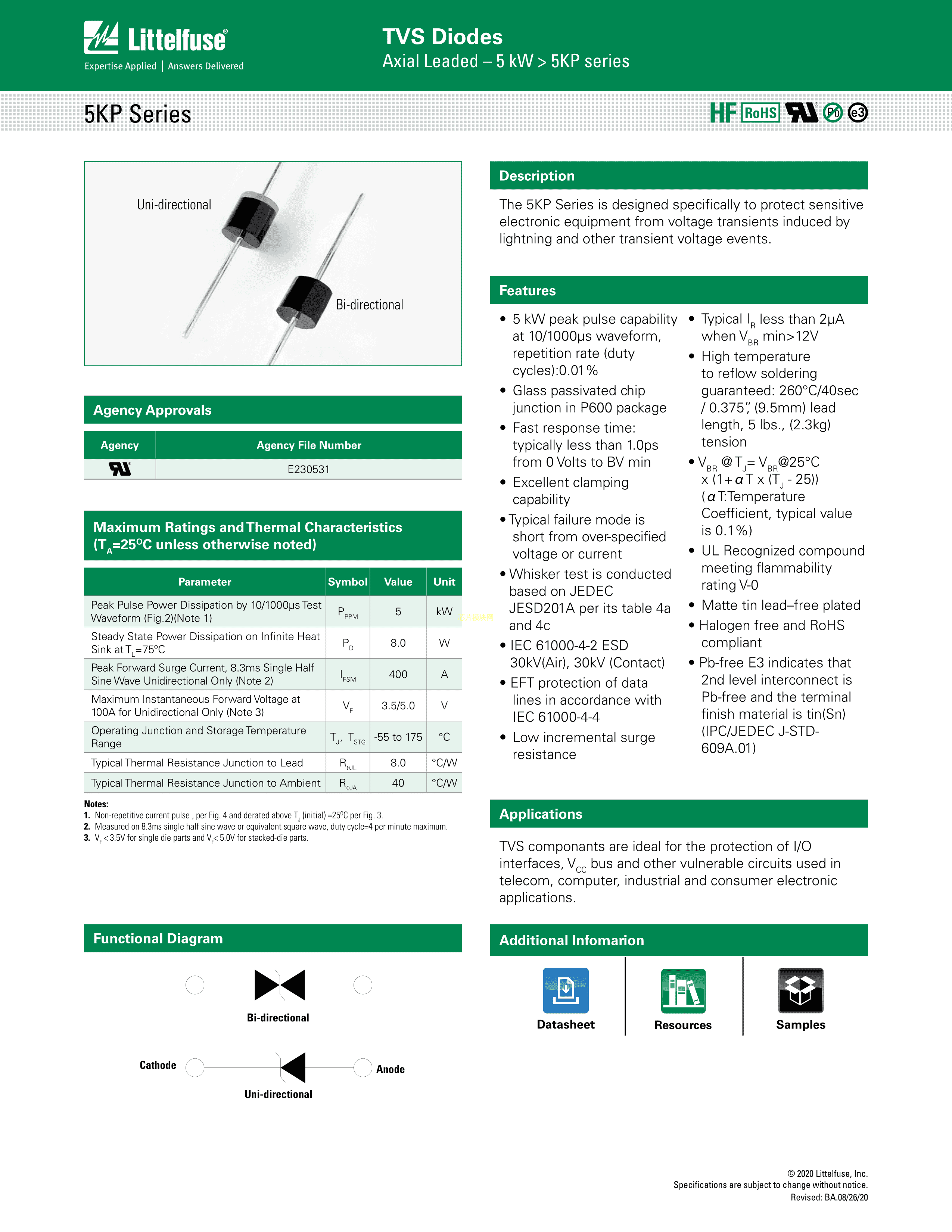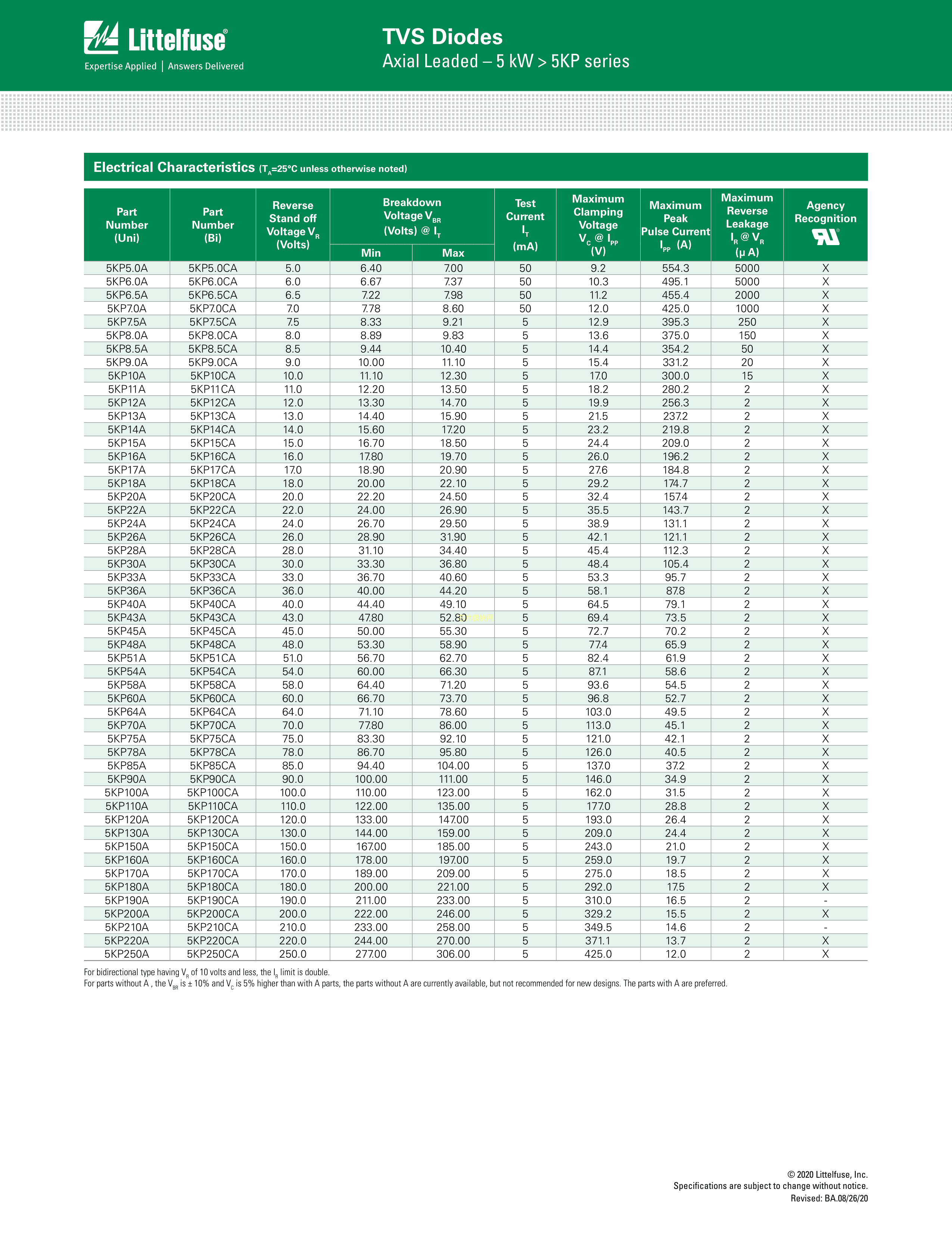 5KP12A数据手册Axial封装Littelfuse(美国力特)PDF规格书,中英文下载