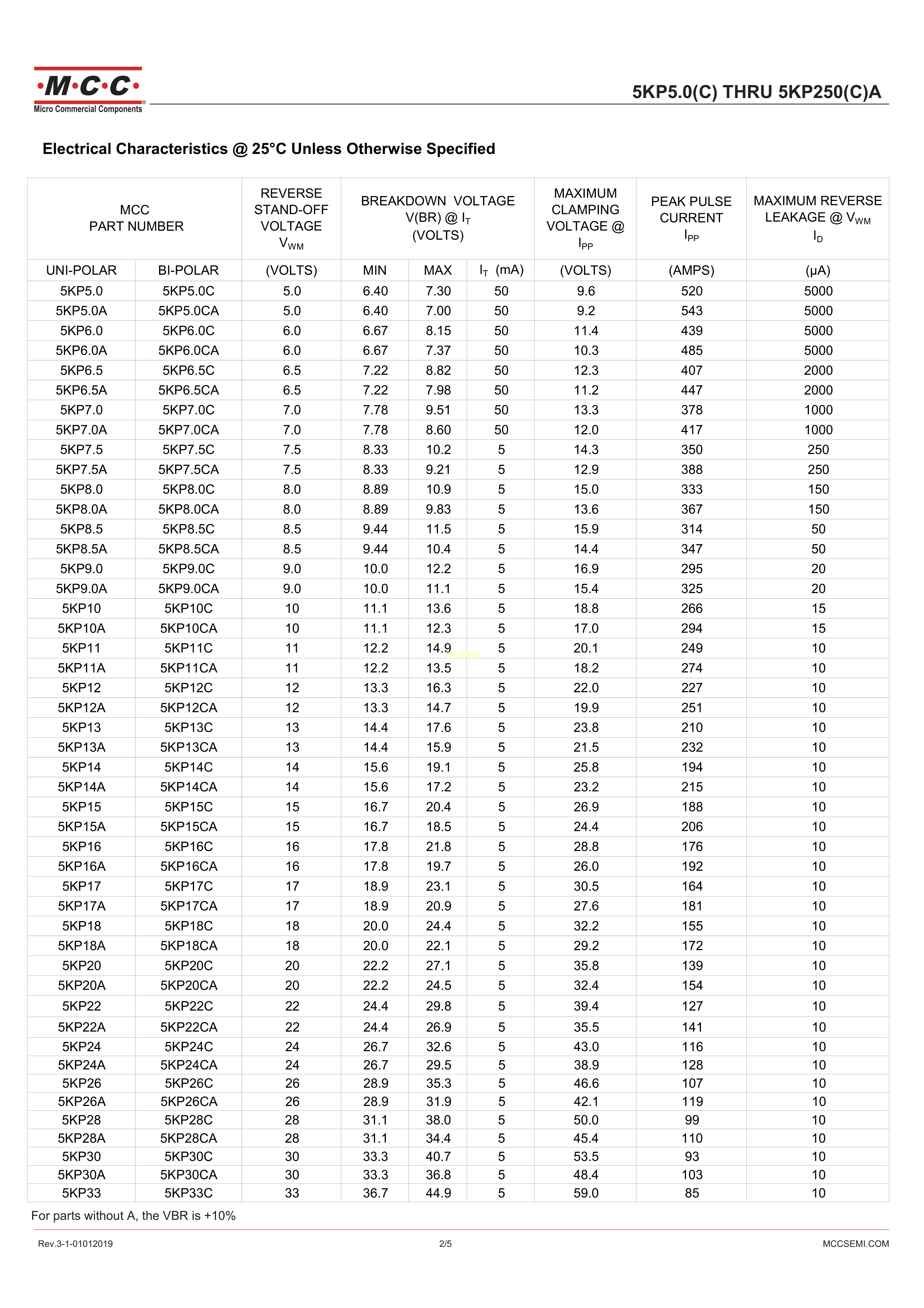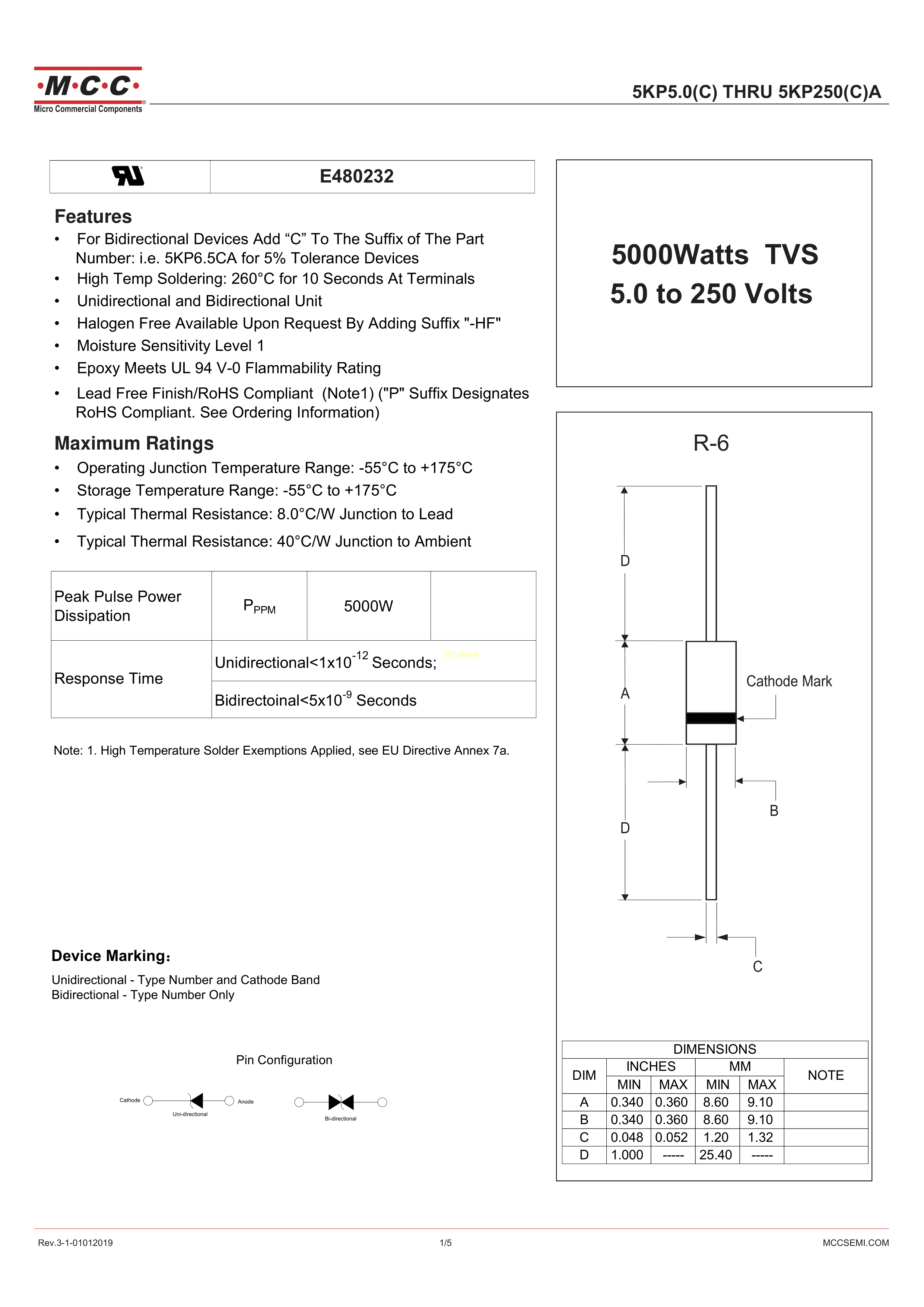 5KP170CA-TP数据手册R-6封装MCC(美微科)PDF规格书,中英文下载