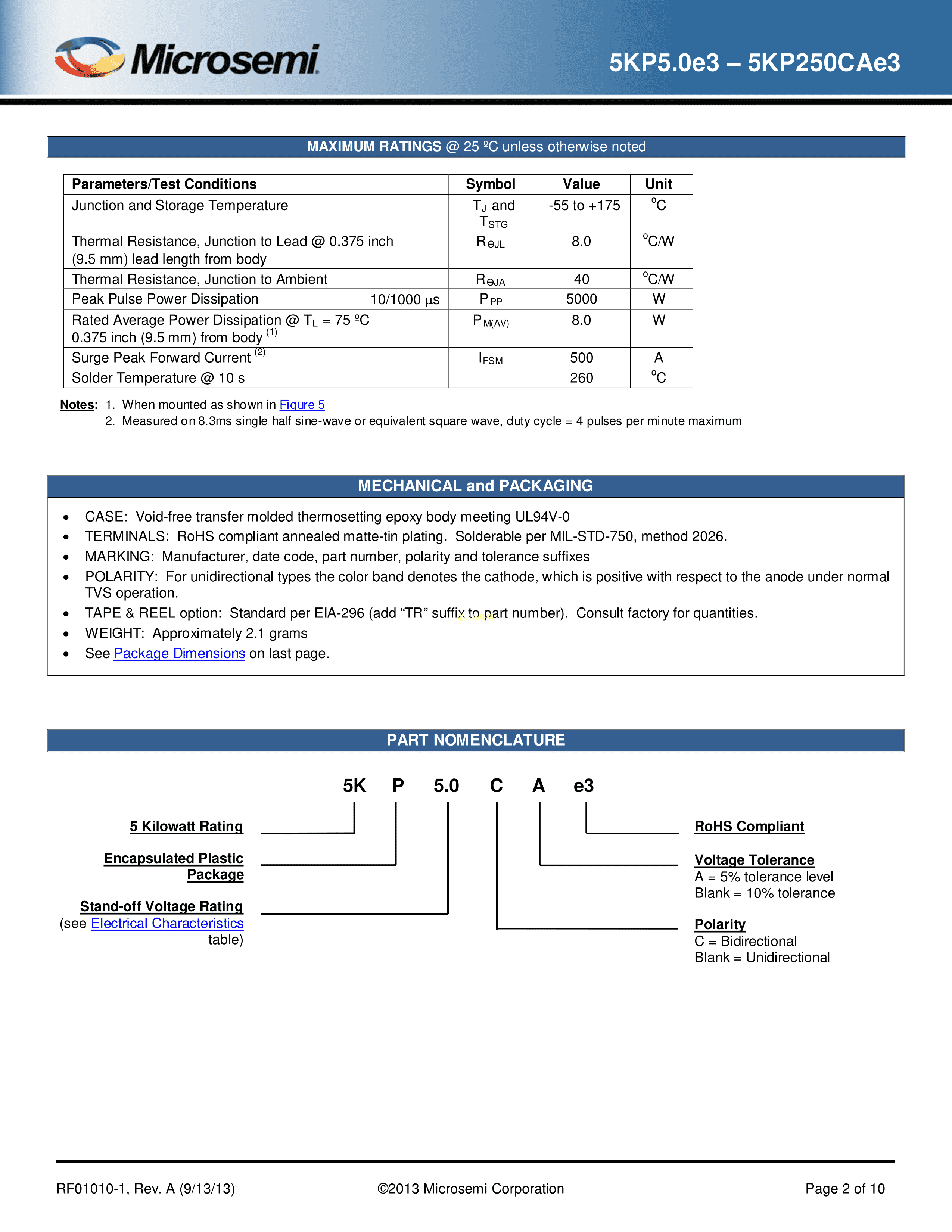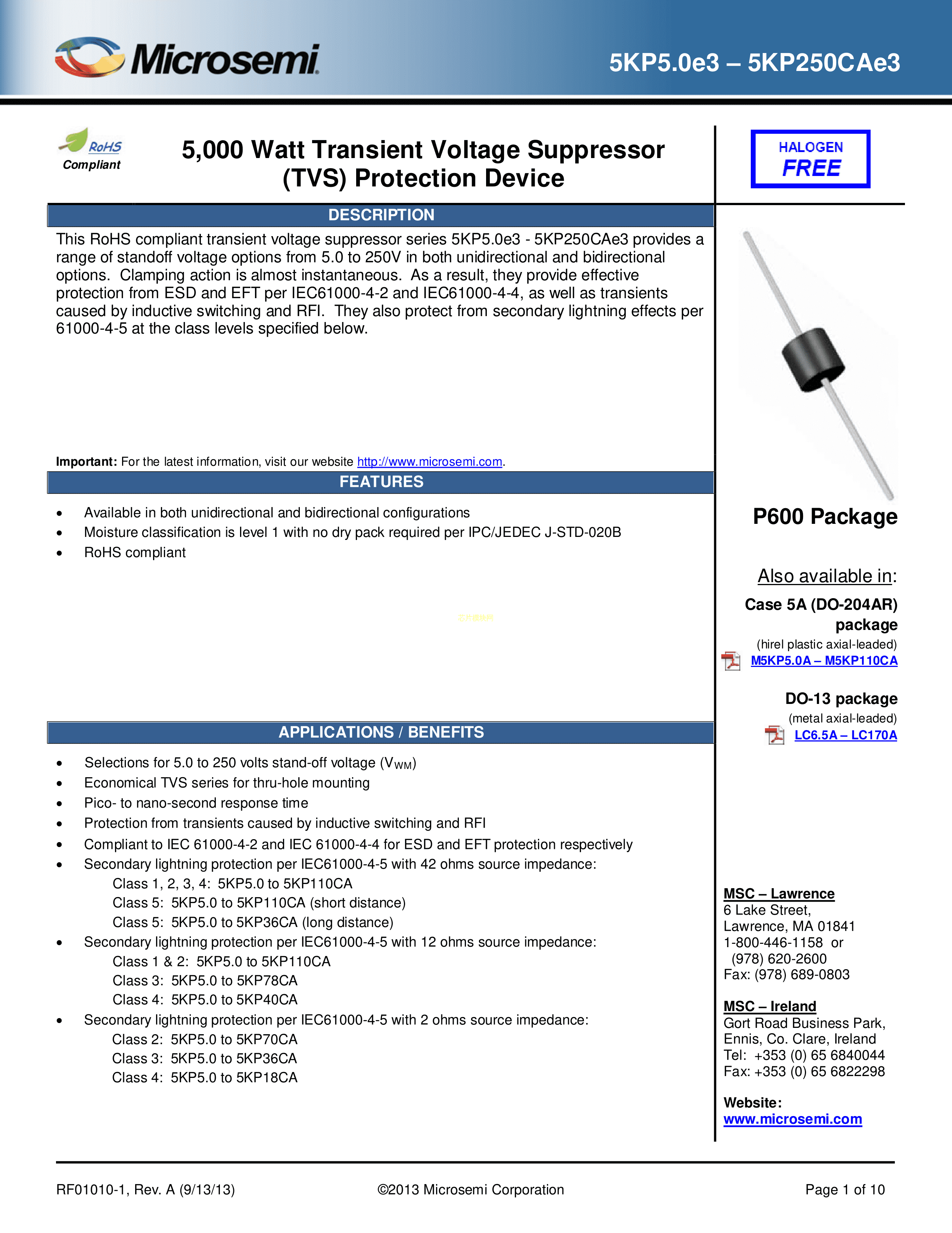5KP18E3-TR13数据手册Axial封装Microsemi(美高森美)PDF规格书,中英文下载