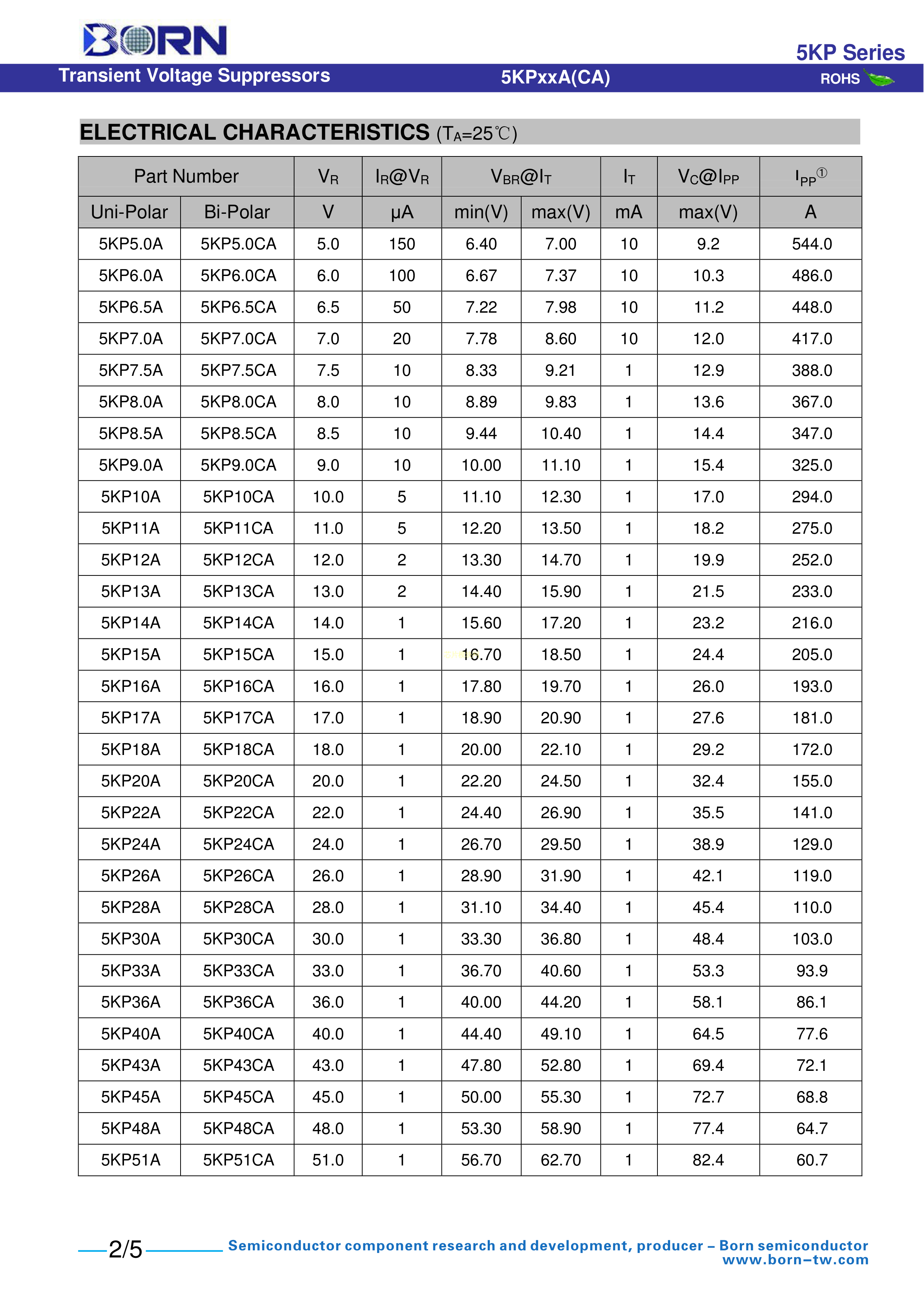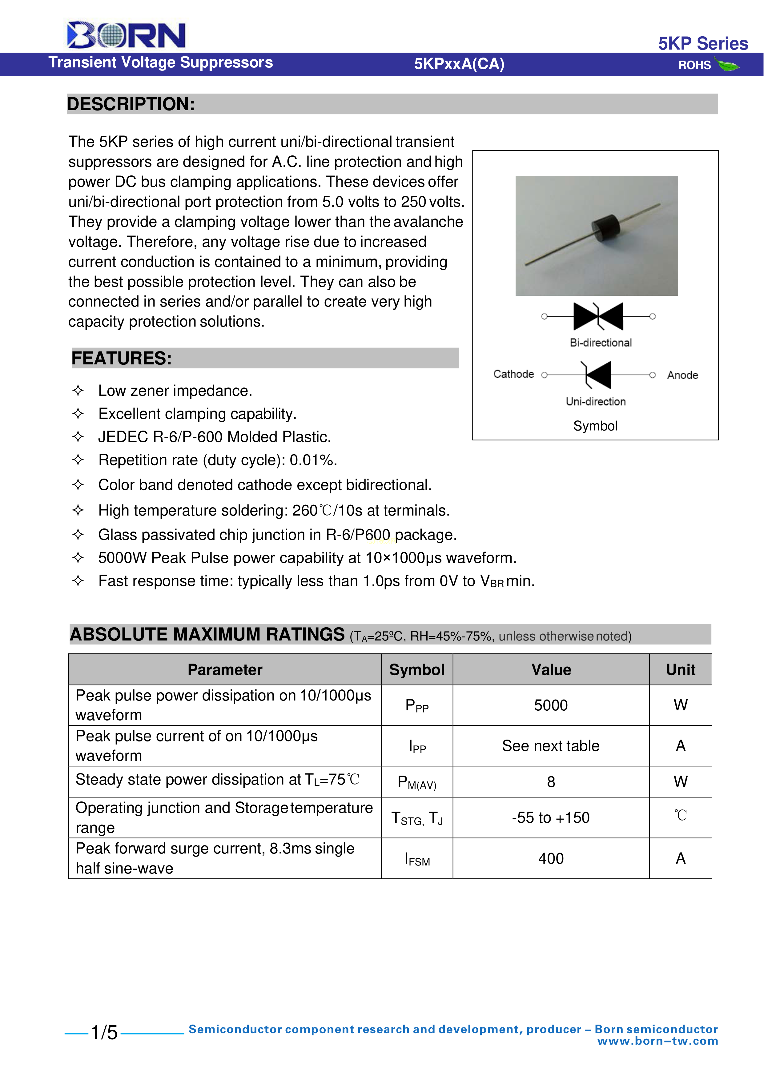 5KP36CA数据手册R-6封装BORN(伯恩半导体)PDF规格书,中英文下载