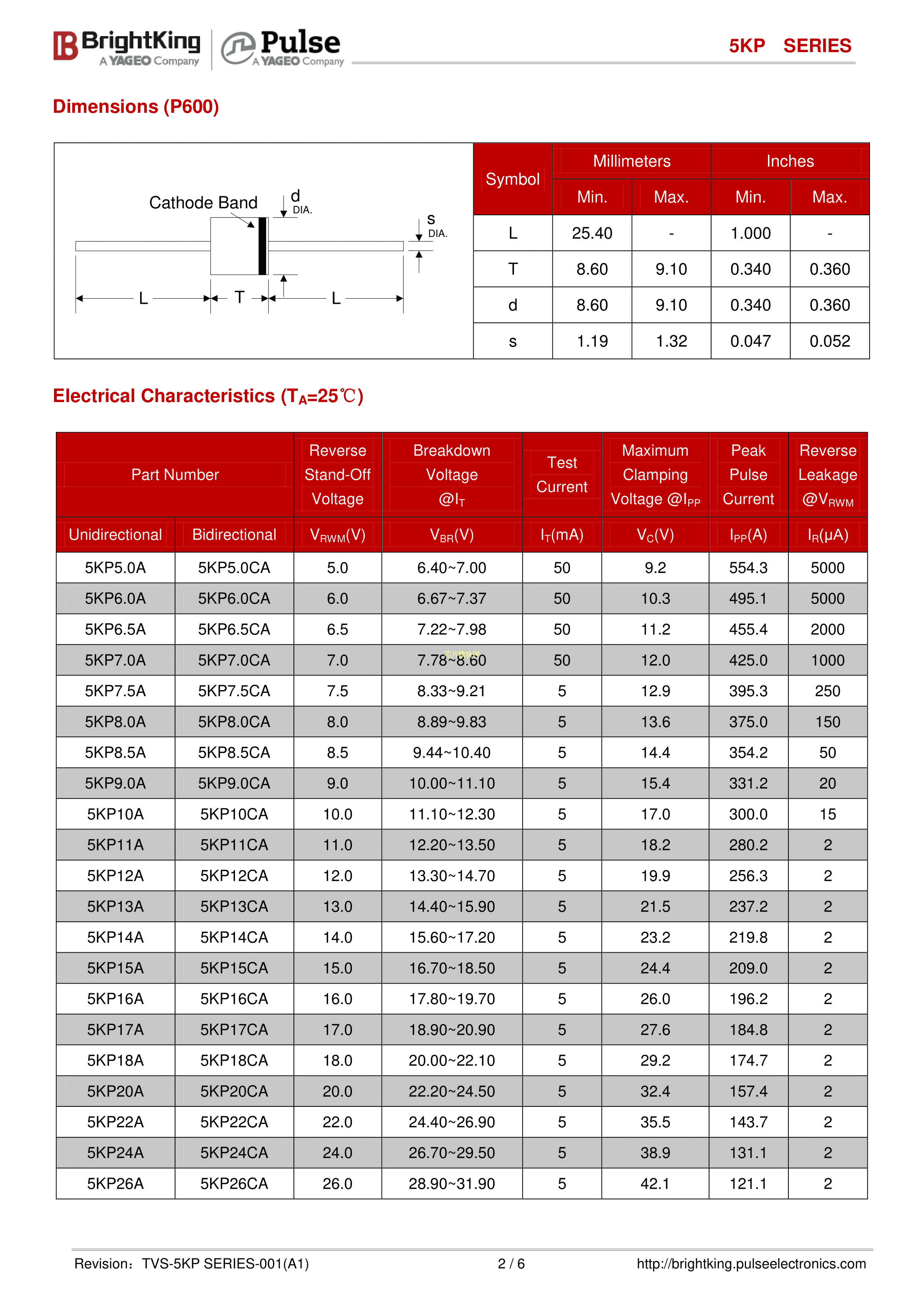 5KP5.0CA数据手册Axial封装Brightking(台湾君耀)PDF规格书,中英文下载