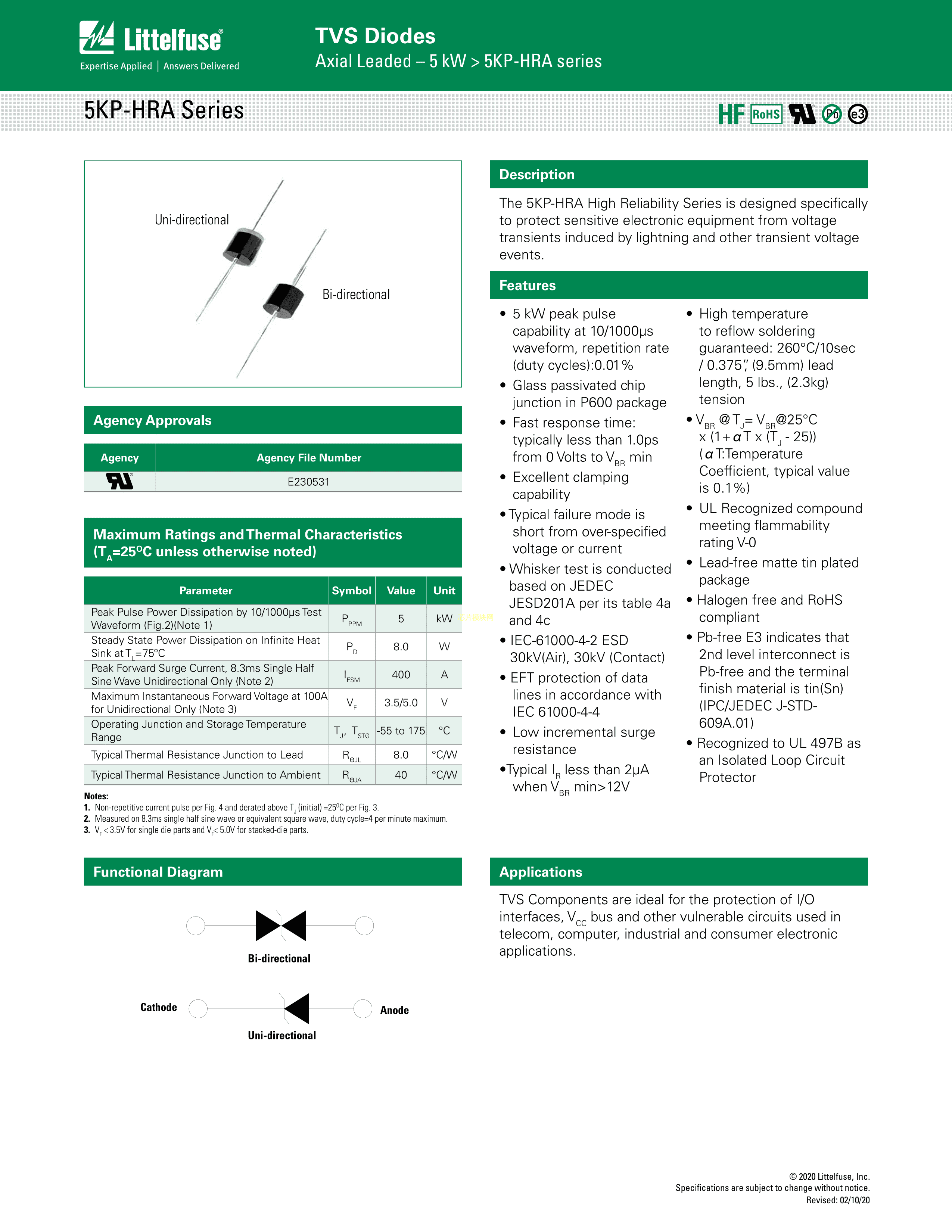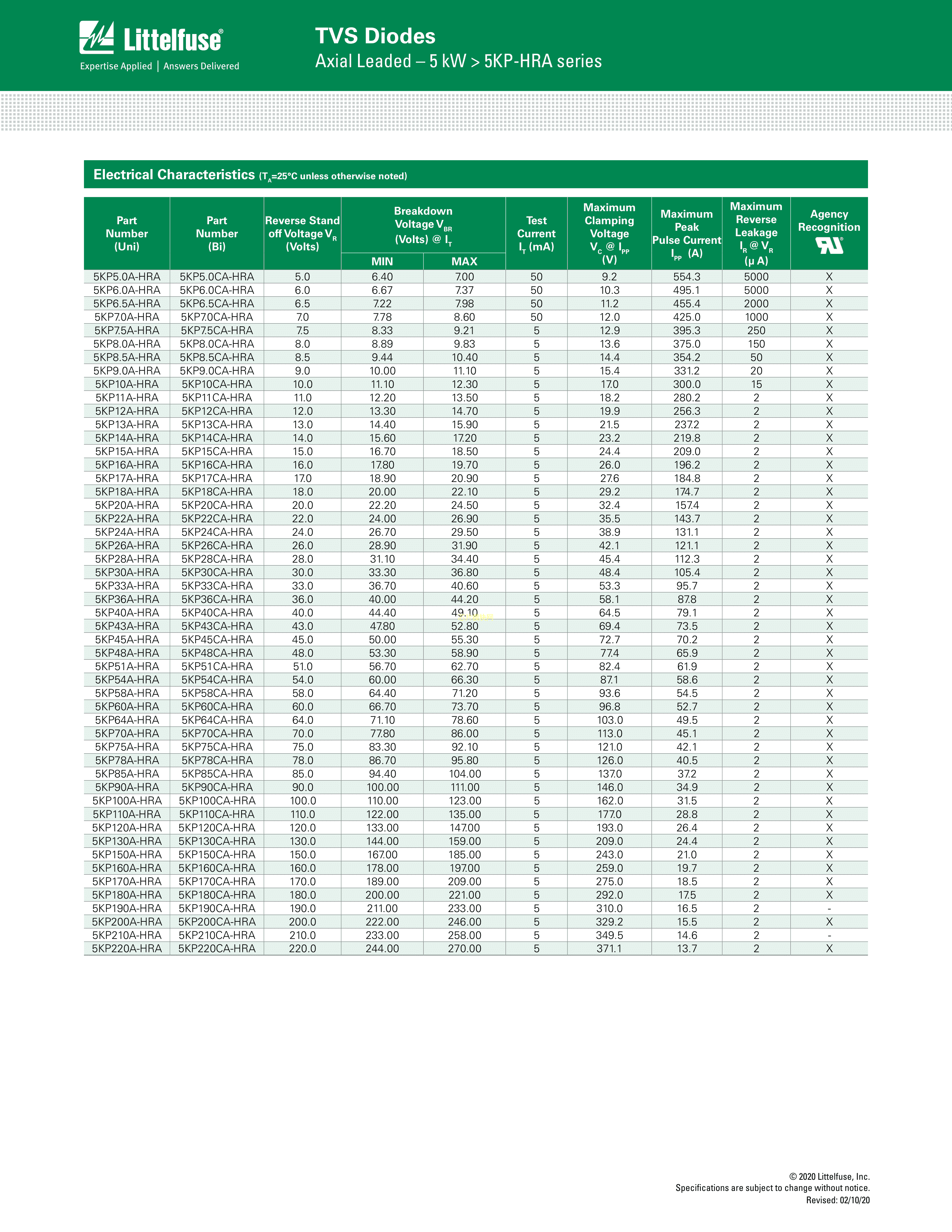5KP6.5A-HRA数据手册Axial封装Littelfuse(美国力特)PDF规格书,中英文下载