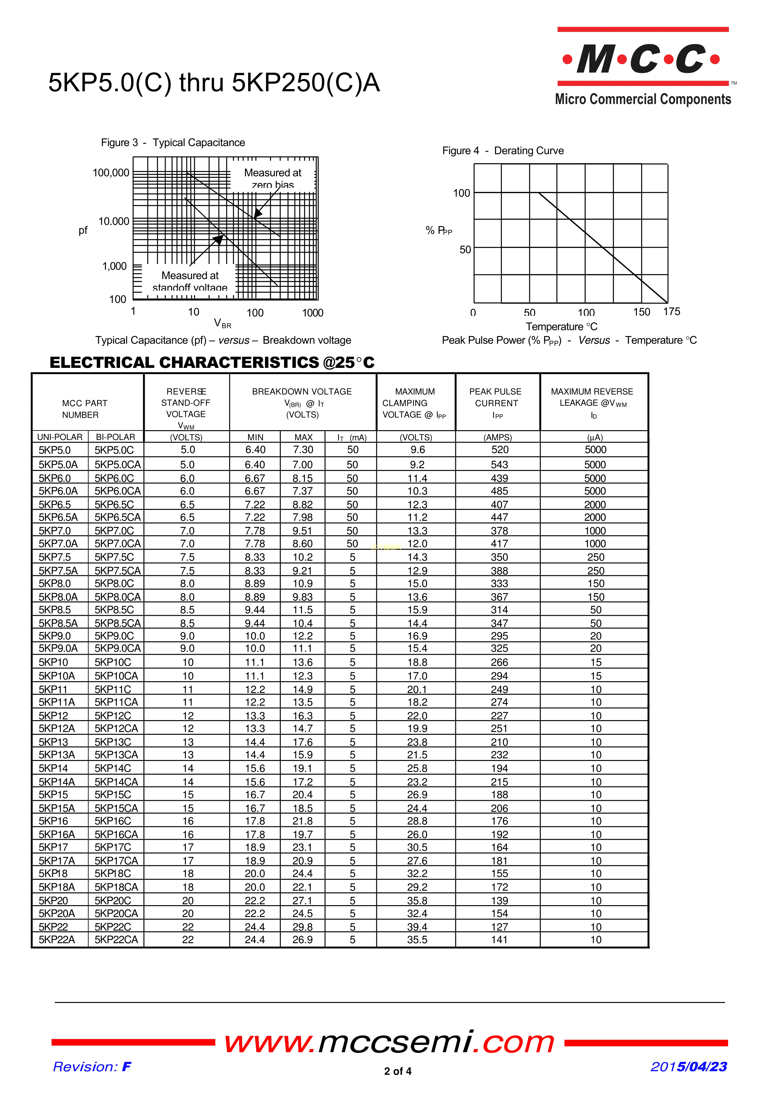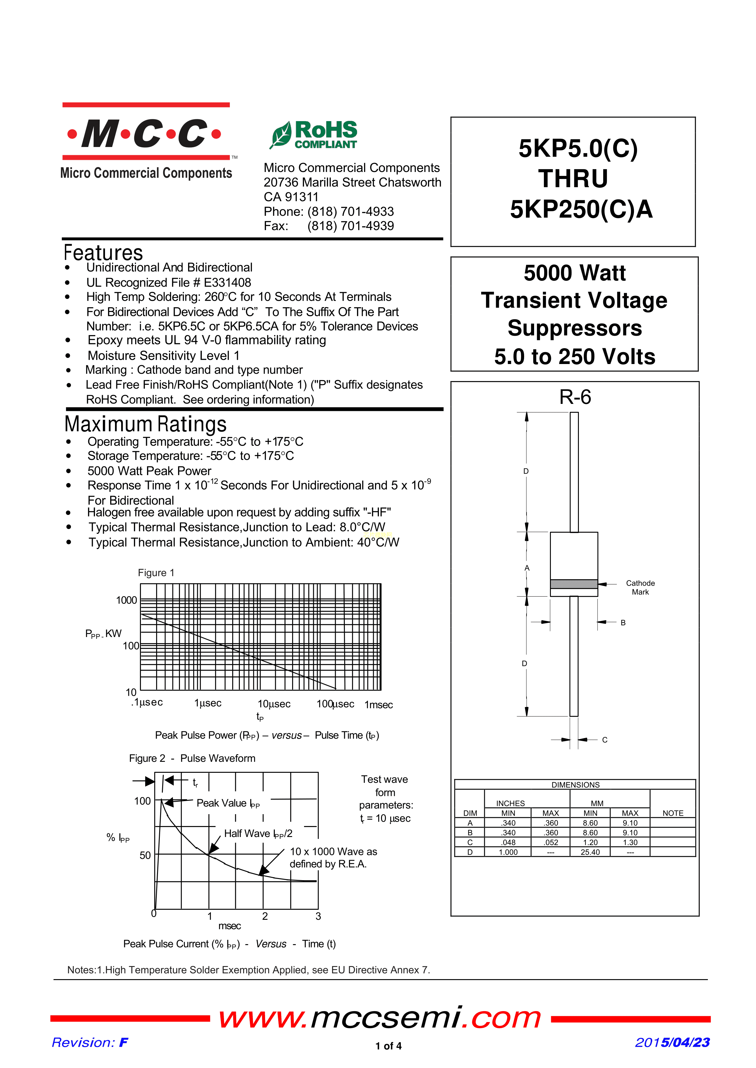 5KP6.5CA-TP数据手册R-6封装MCC(美微科)PDF规格书,中英文下载