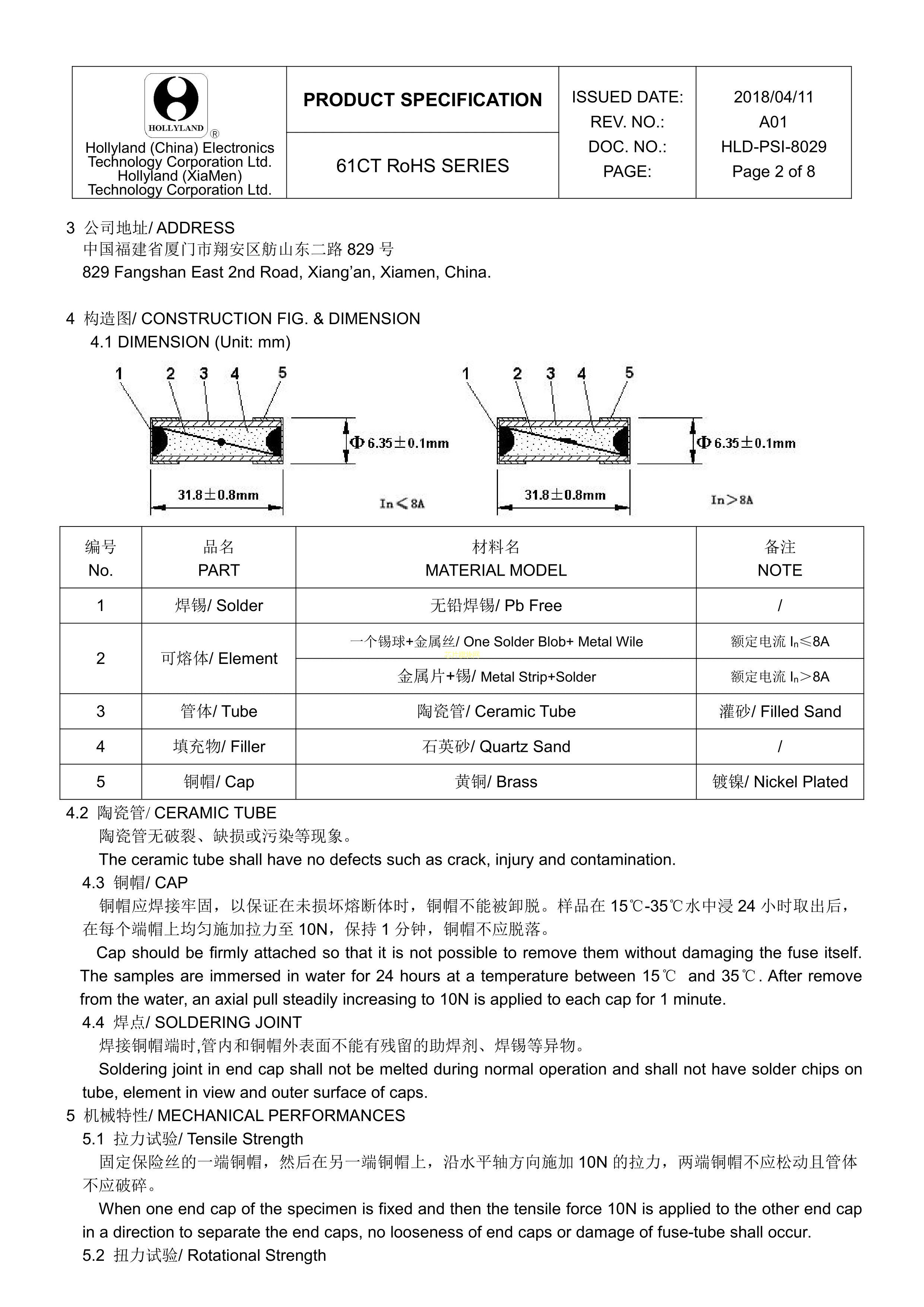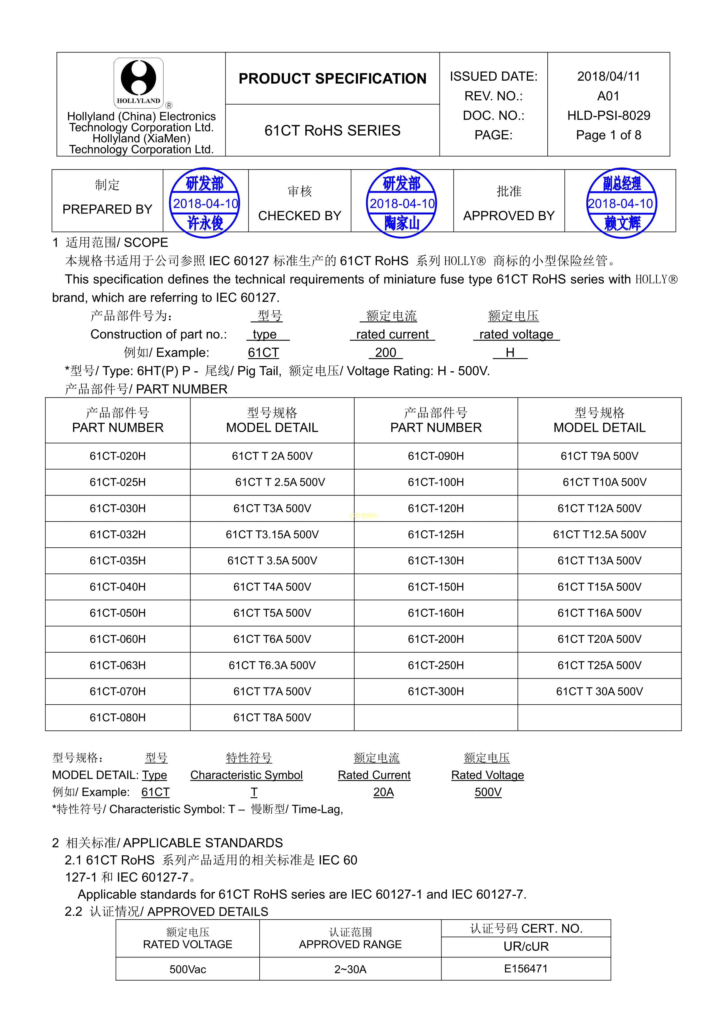 61CT-250H数据手册管6.35x31.8mm封装HOLLY(好利来)PDF规格书,中英文下载