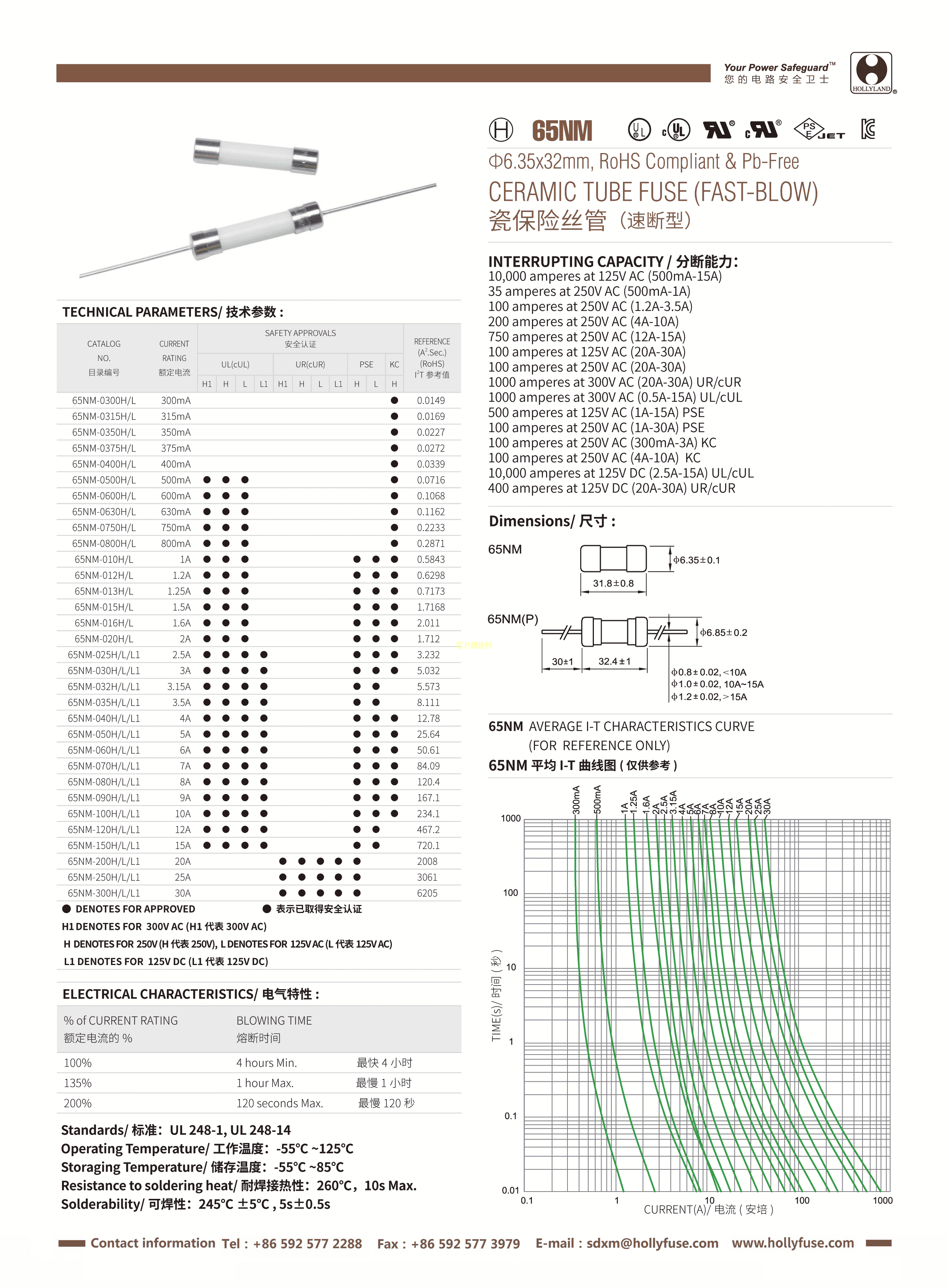 65NM-080H数据手册管6.35x32mm封装HOLLY(好利来)PDF规格书,中英文下载