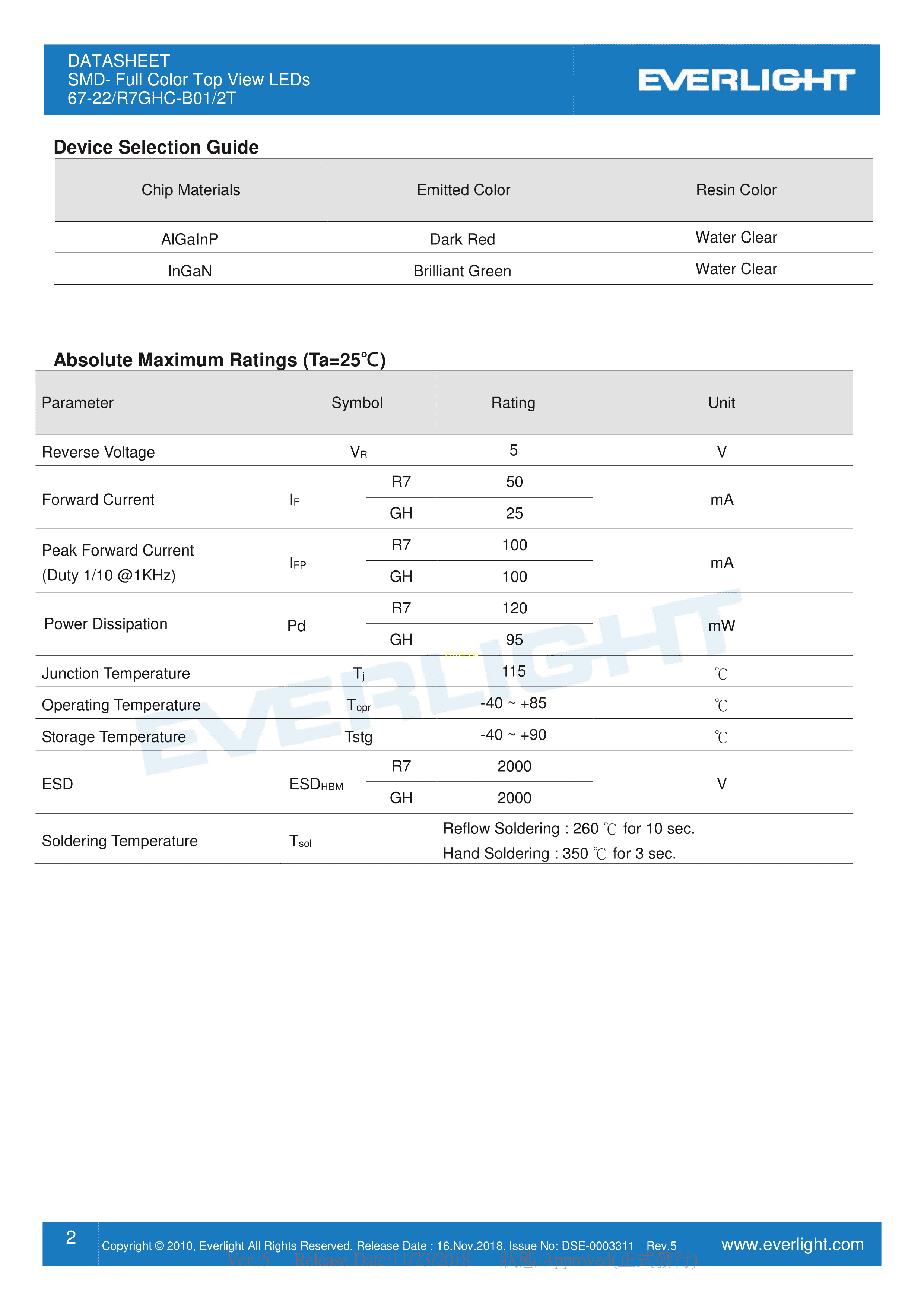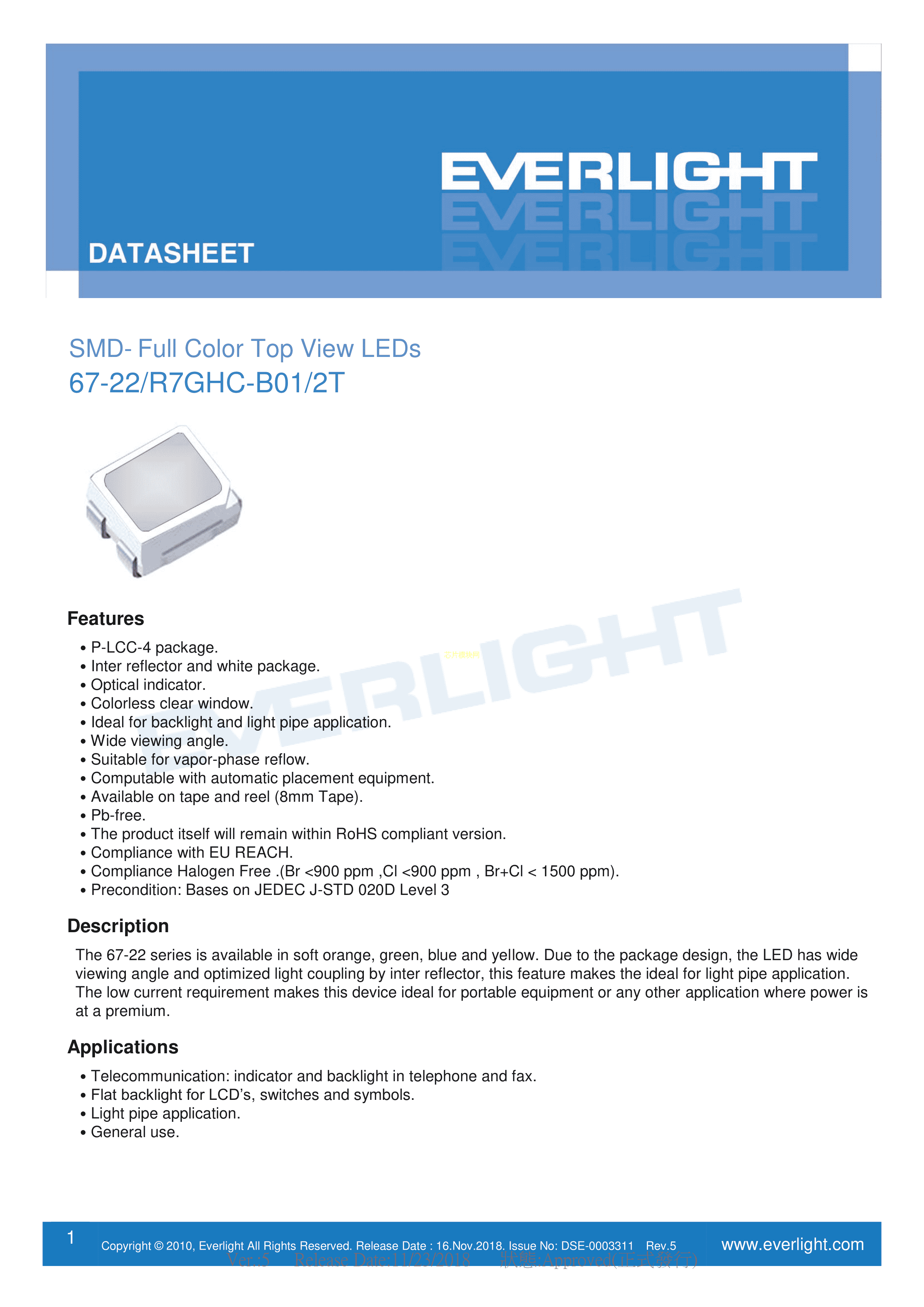 67-22-R7GHC-B01-2T数据手册PLCC-4封装EVERLIGHT(台湾亿光)PDF规格