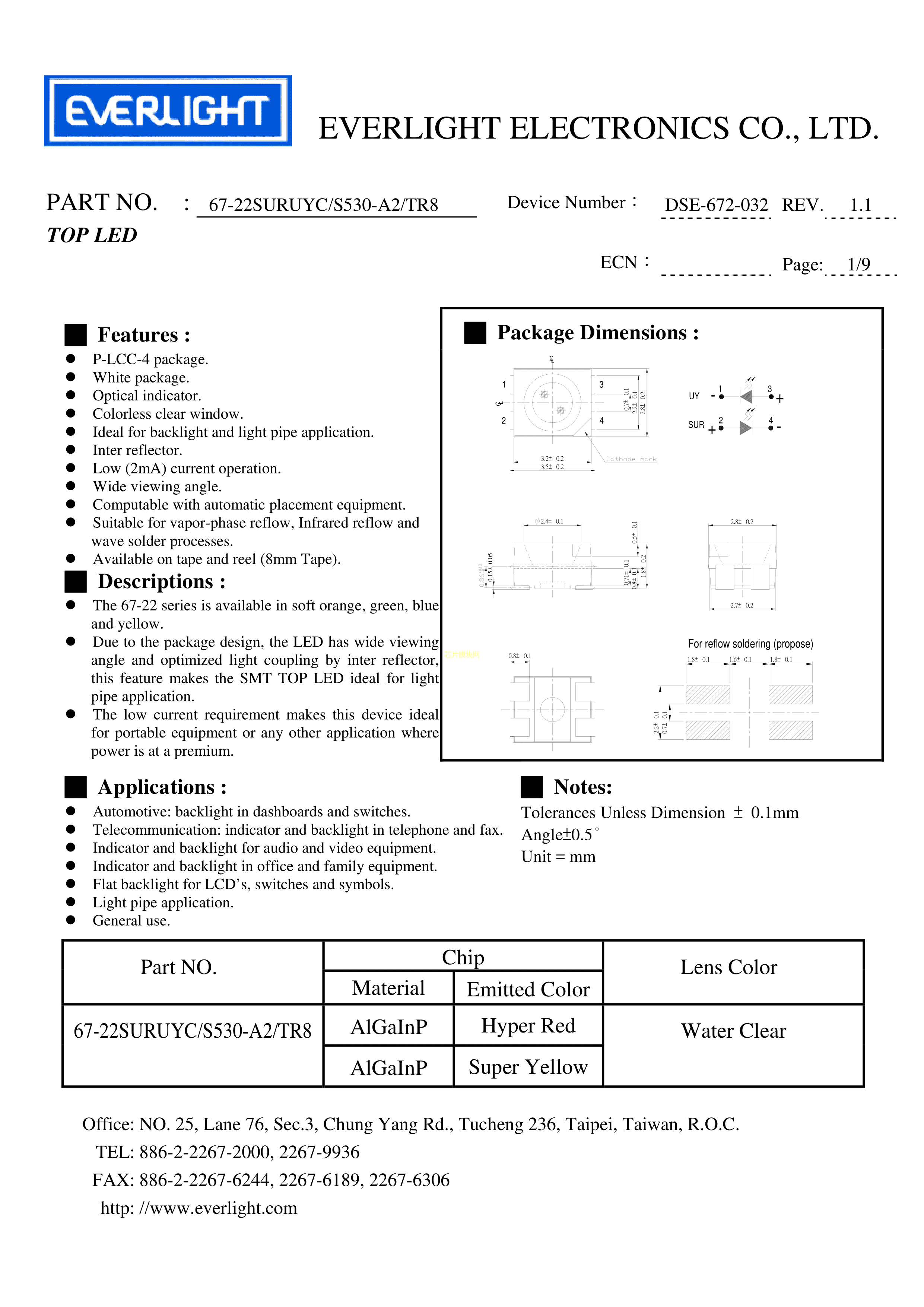67-22SURUYC-S530-A2-TR8数据手册SMD3.5x2.8mm封装EVERLIGHT