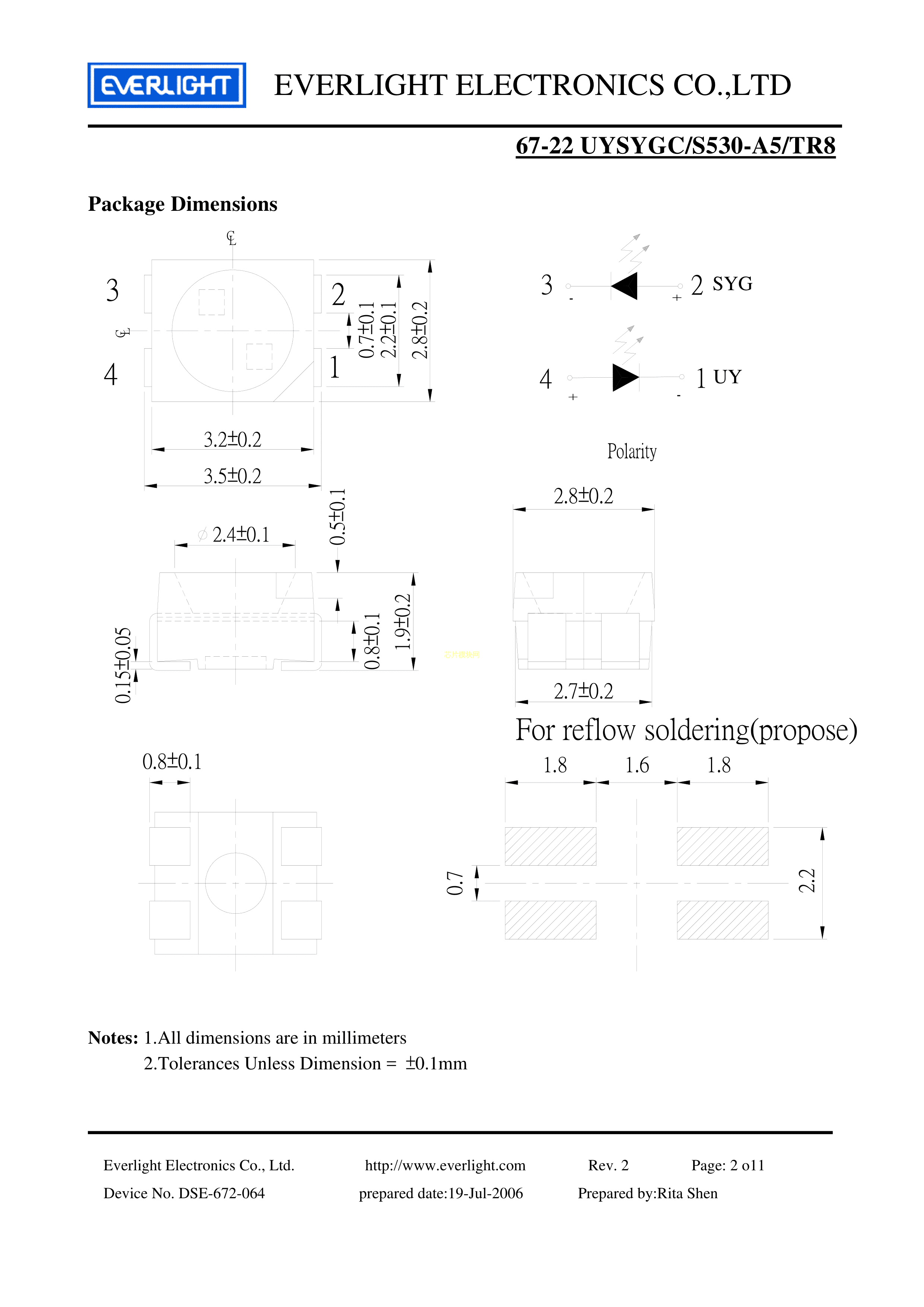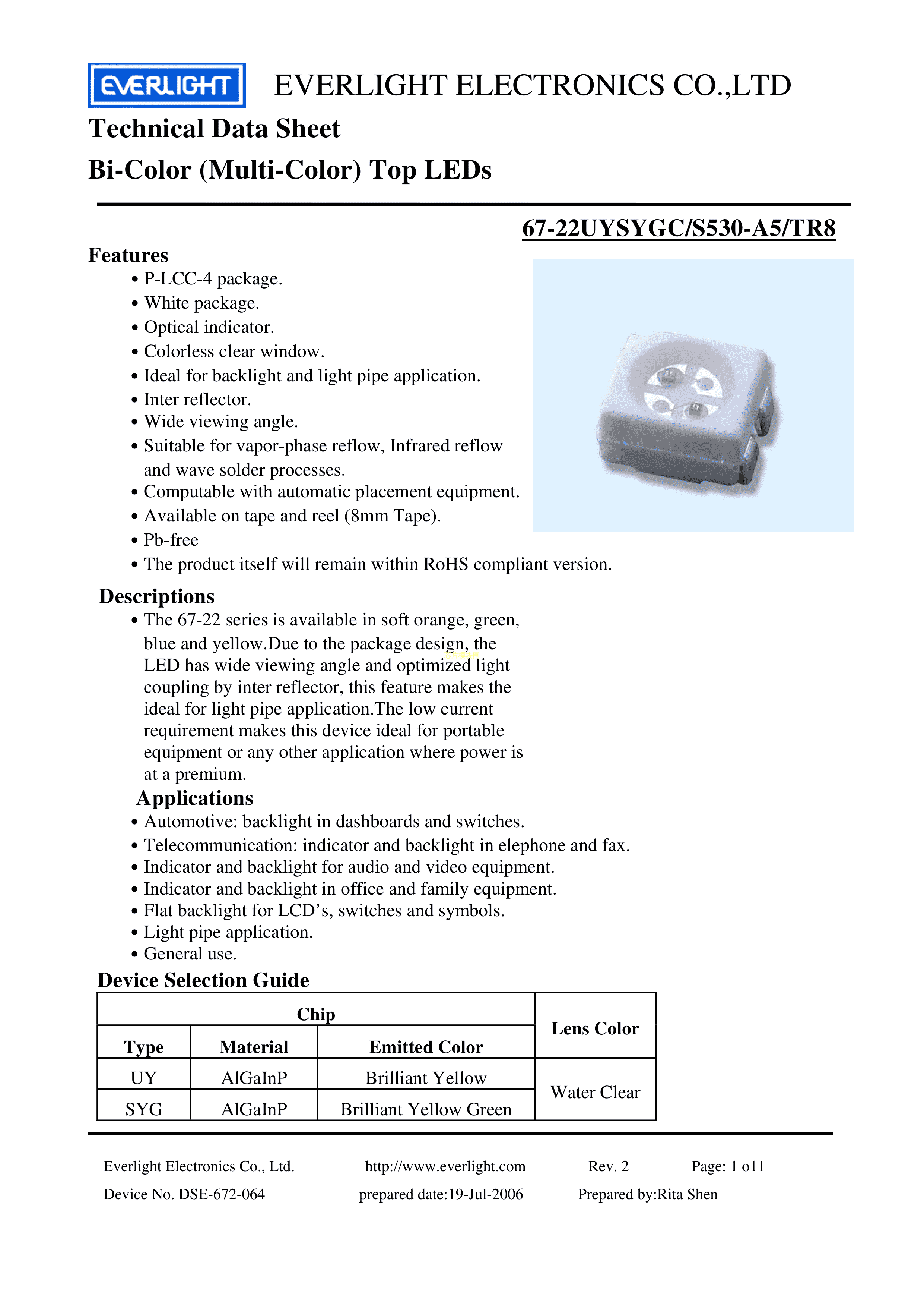 67-22UYSYGC-S530-A5-TR8数据手册SMD3.2x2.8x1.9mm封装EVERL