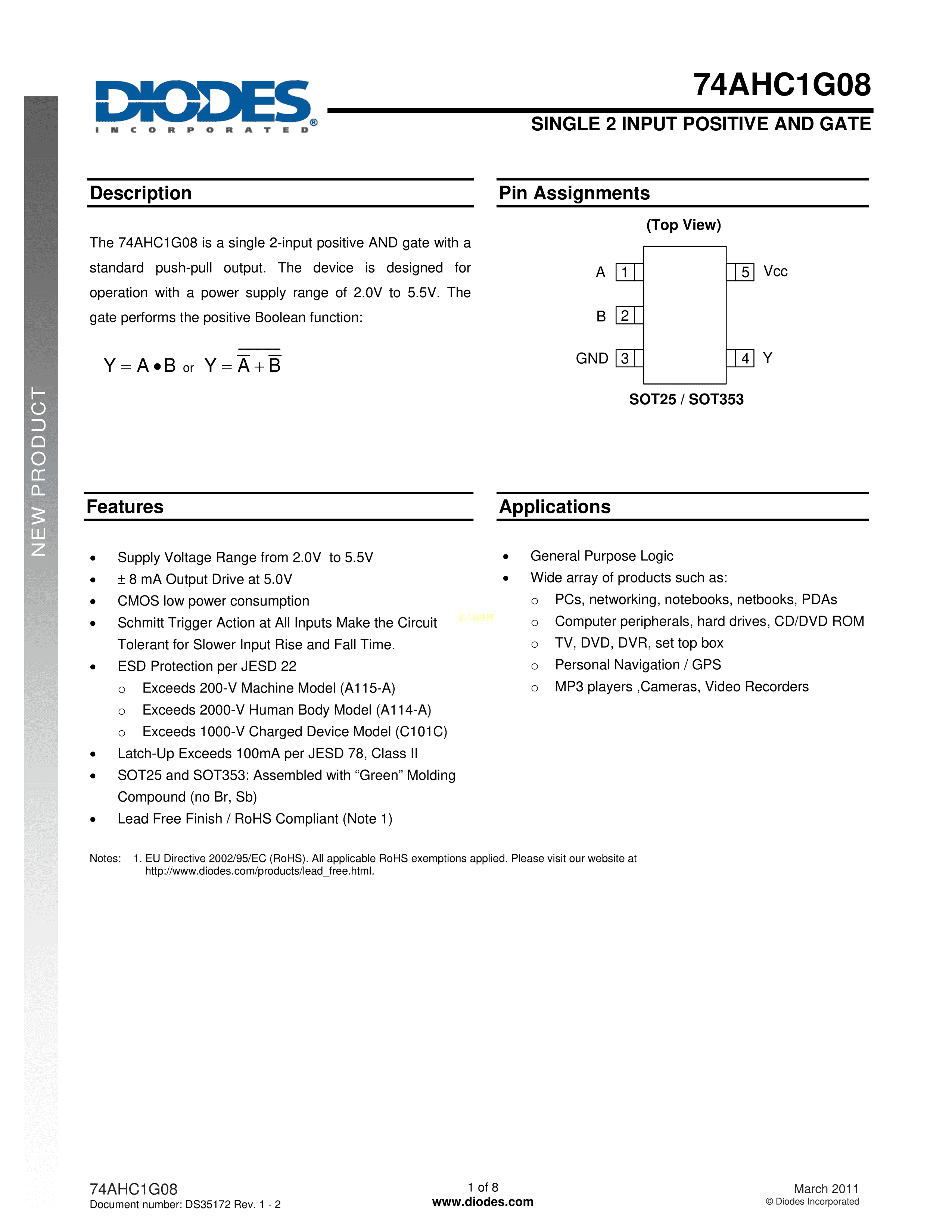 74AHC1G08W5-7数据手册SOT-25封装DIODES(美台)PDF规格书,中英文下载