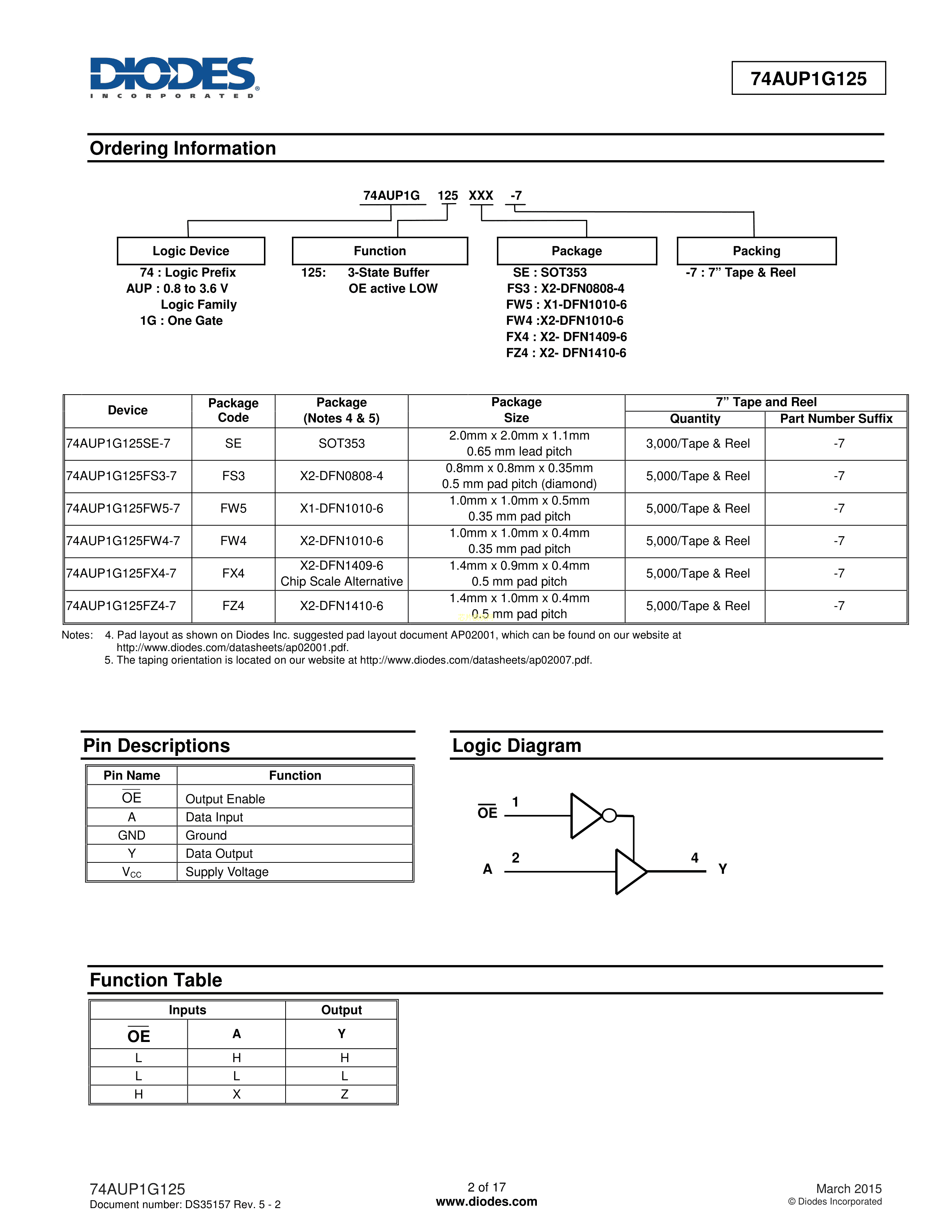 74AUP1G125FW4-7数据手册X2-DFN1010-6封装DIODES(美台)PDF规格书,