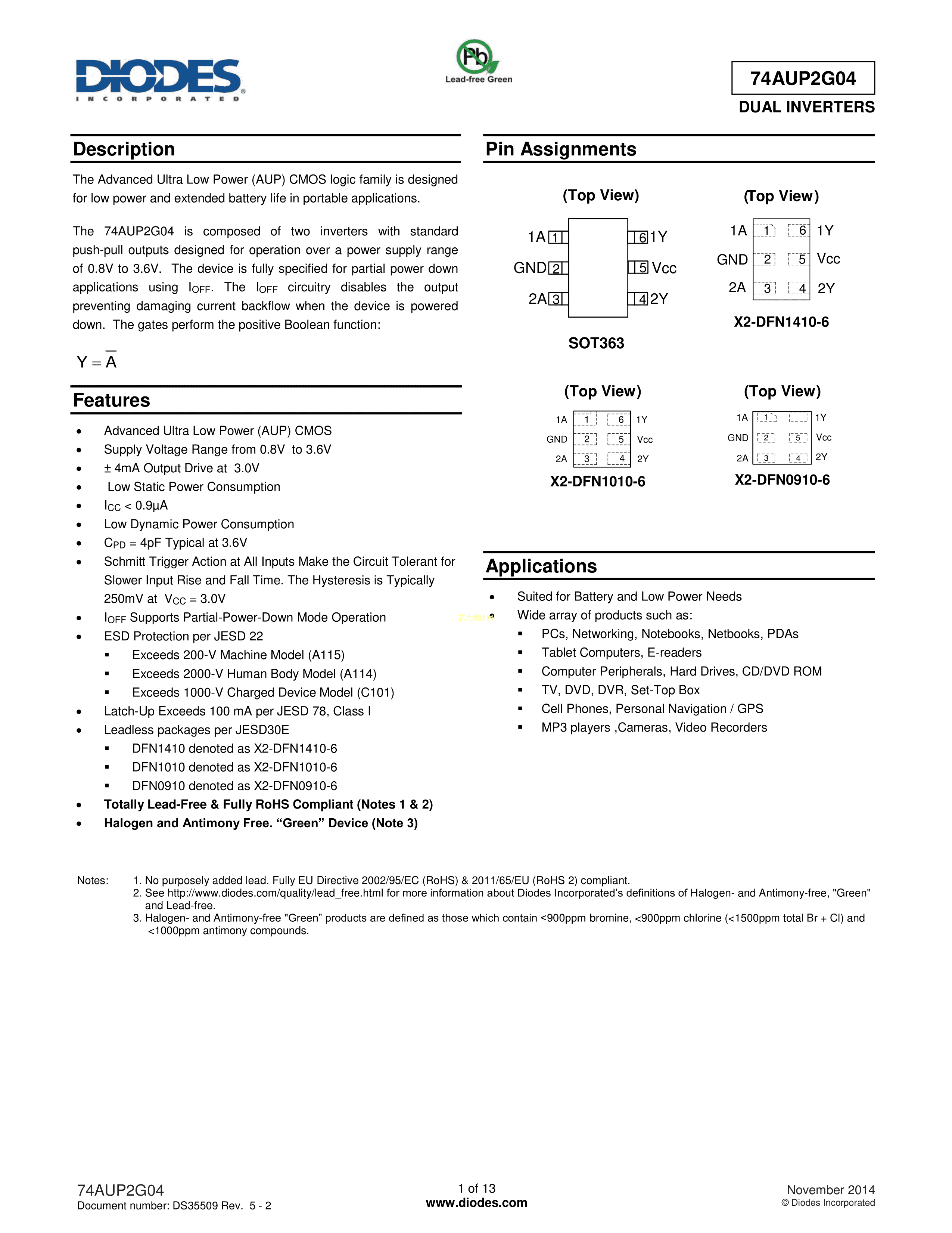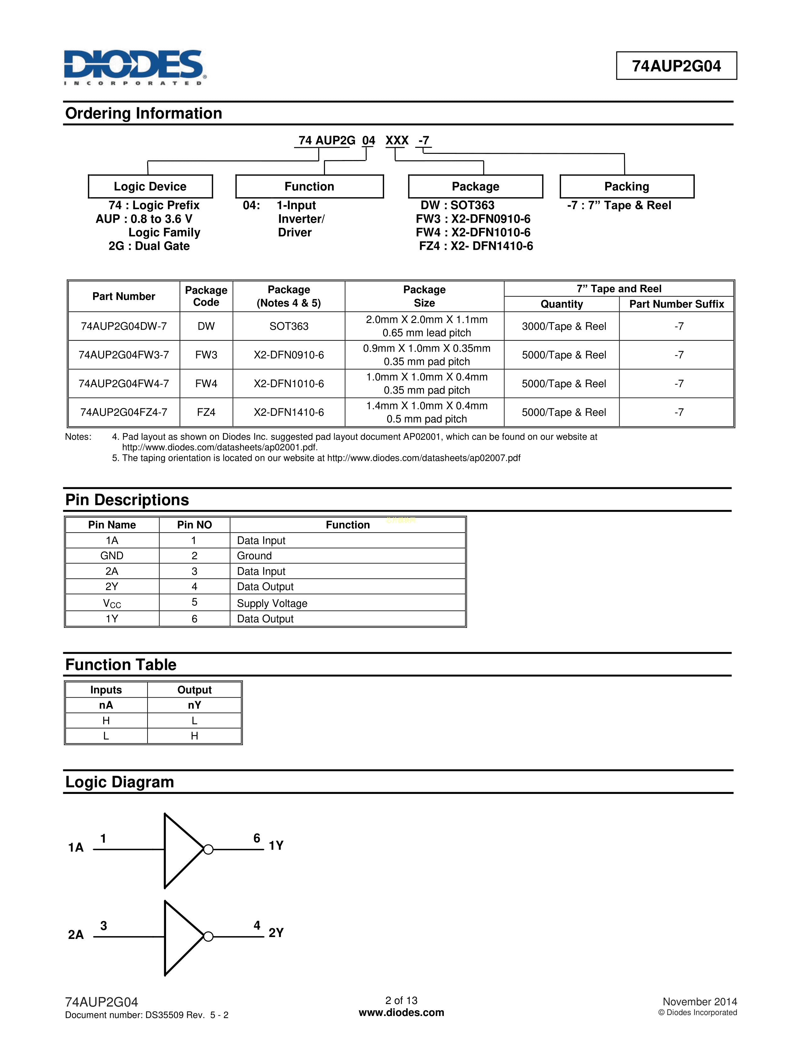 74AUP2G04FZ4-7数据手册X2-DFN1410-6封装DIODES(美台)PDF规格书,中