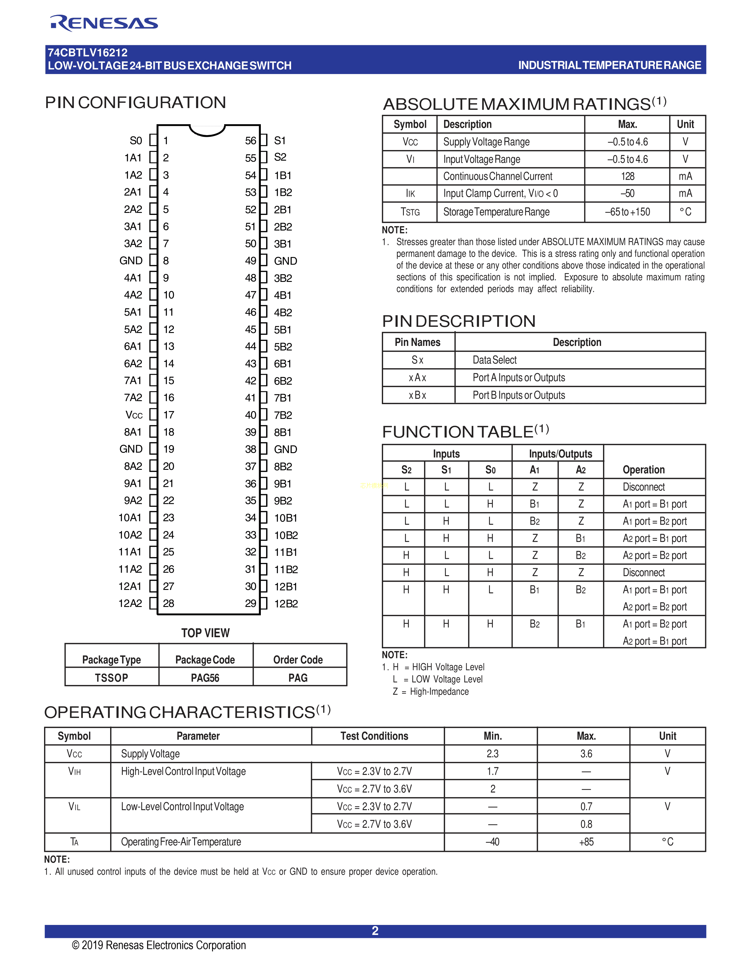 74CBTLV16212PAG8数据手册TSSOP-56封装RENESAS(瑞萨)-IDTPDF规格